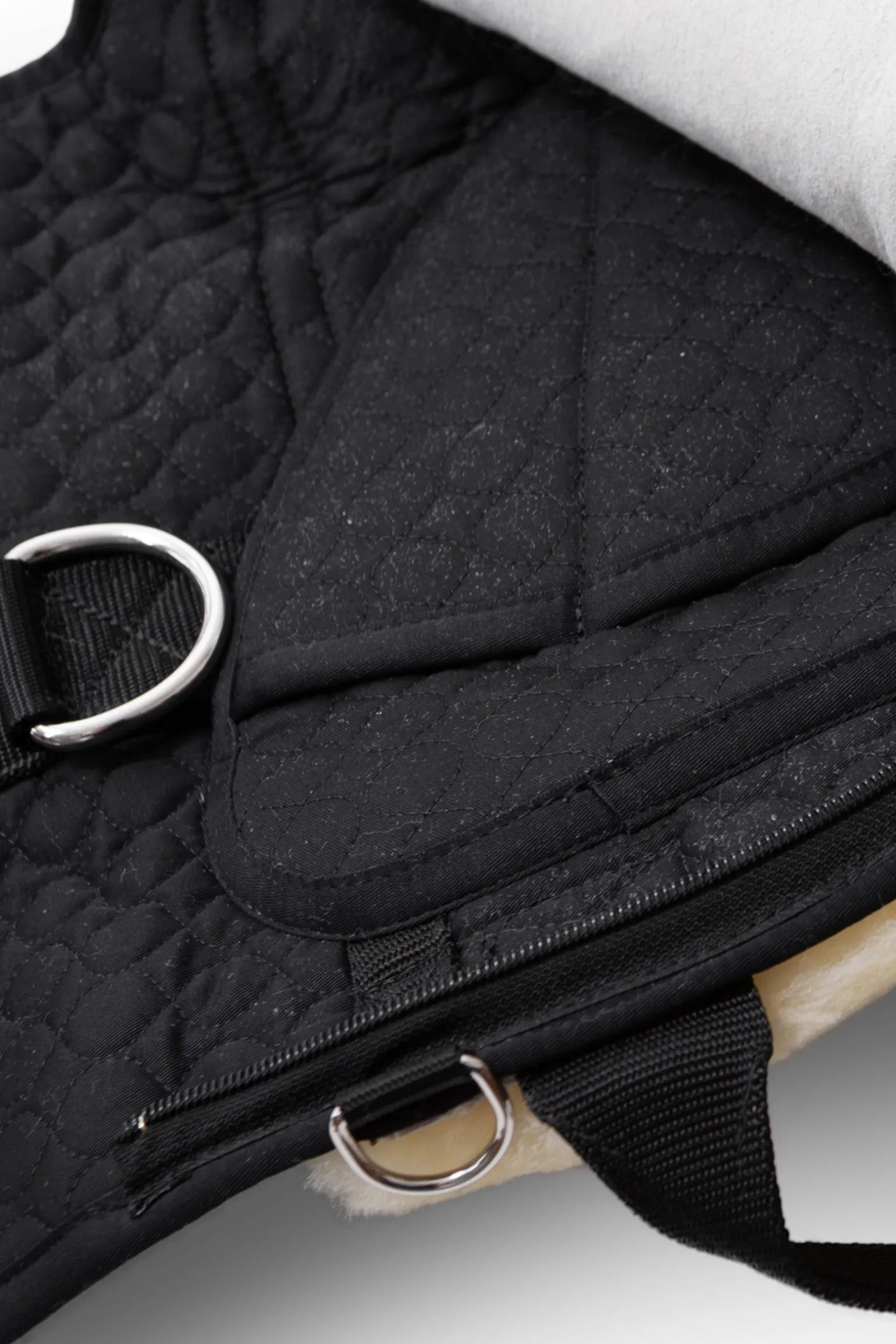 Die Sitzfläche dieses Sattels ist komplett aus Lammfell mit einer Wollhöhe von ca. 30mm gefertigt, die Unterseite nur im Rückenbereich. Seitliche Fellpauschen bieten zusätzlichen Halt. Ein spezielles Kopfeisen, separat erhältlich, kann in die Tasche unter dem abnehmbaren Lammfell-Bezug eingelegt werden. Die am Kopfeisen befestigten Sturzfedern erlauben das Aufsteigen über Steigbügel. Herausnehmbare Polster links und rechts vom Wirbelkanal erhöhen den Sitzkomfort und schonen den Pferderücken. Shetland-Größen werden unter Artikelnummer 304750 verkauft.