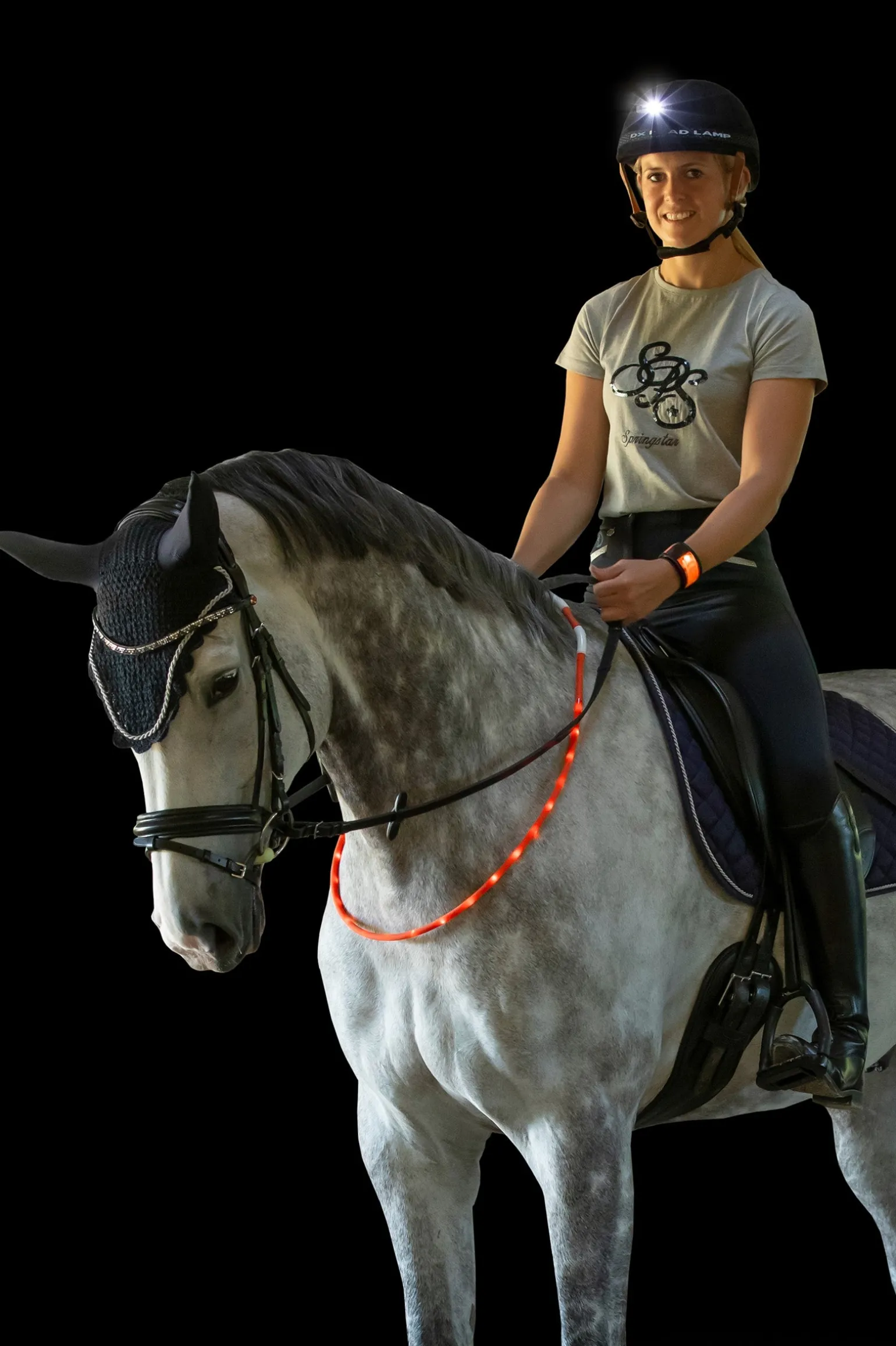 Das LED-Beleuchtungsset für sicheres Reiten auch in der Dämmerung kommt mit drei Komponenten daher: ein LED Halsring mit 3 Leuchtmodi für das Pferd, ein LED Armband für den Reiter und eine LED Kopflampe mit 3 Leuchtmodi. Die Kopflampe sowie der Halsring können mit dem mitgelieferten Ladekabel über vorhandene USB-Anschlüsse einfach geladen werden. Das gesamte Set ist zudem wetterfest. Dem Ausritt in der dunklen Jahreszeit steht nichts mehr im Weg!