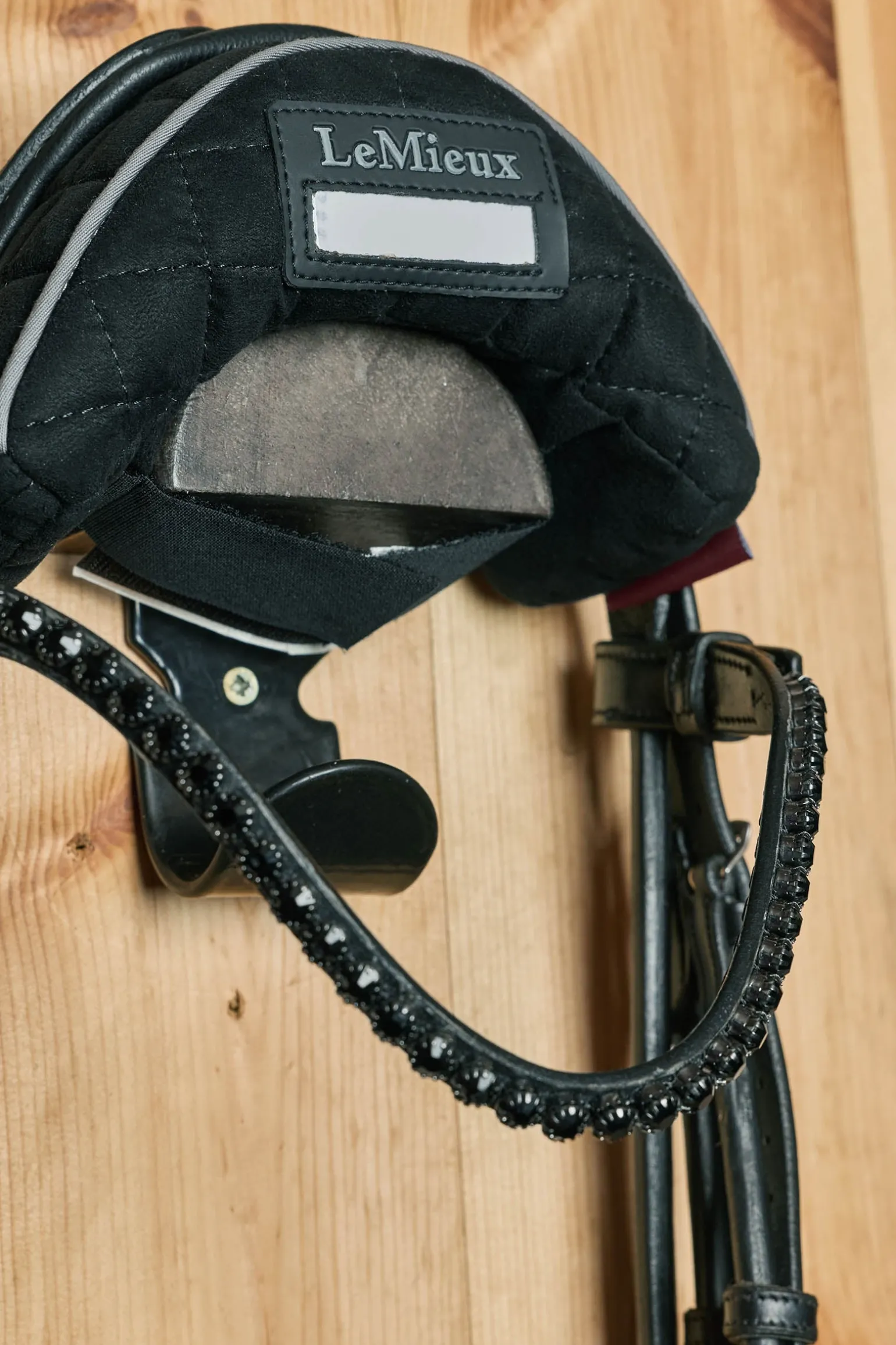 Ein geprägter Namensschildhalter ermöglicht eine einfache Identifizierung des Sets, während das Polster mit sicheren Klettriemen am Trensenhaken befestigt wird. Das gesteppte Suede-Design mit kontrastierender Paspel und der charakteristischen LeMieux Lasche harmoniert perfekt mit dem passenden Sattelhalterpolster und sorgt für eine stets aufgeräumte Sattelkammer.
