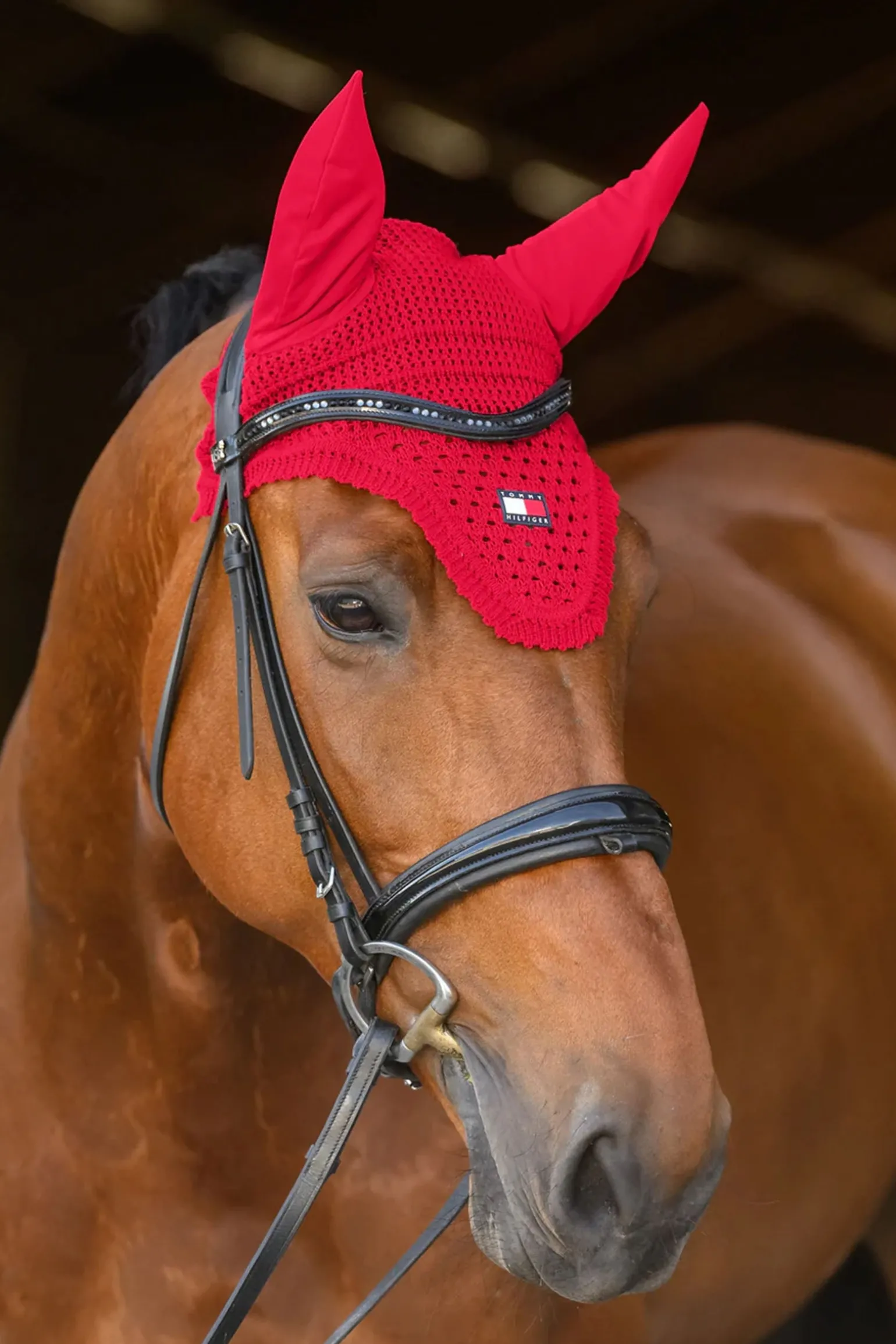 Verpasse deinem Pferd den Tommy Touch mit der gehäkelten Fliegenhaube mit Logo-Patch.