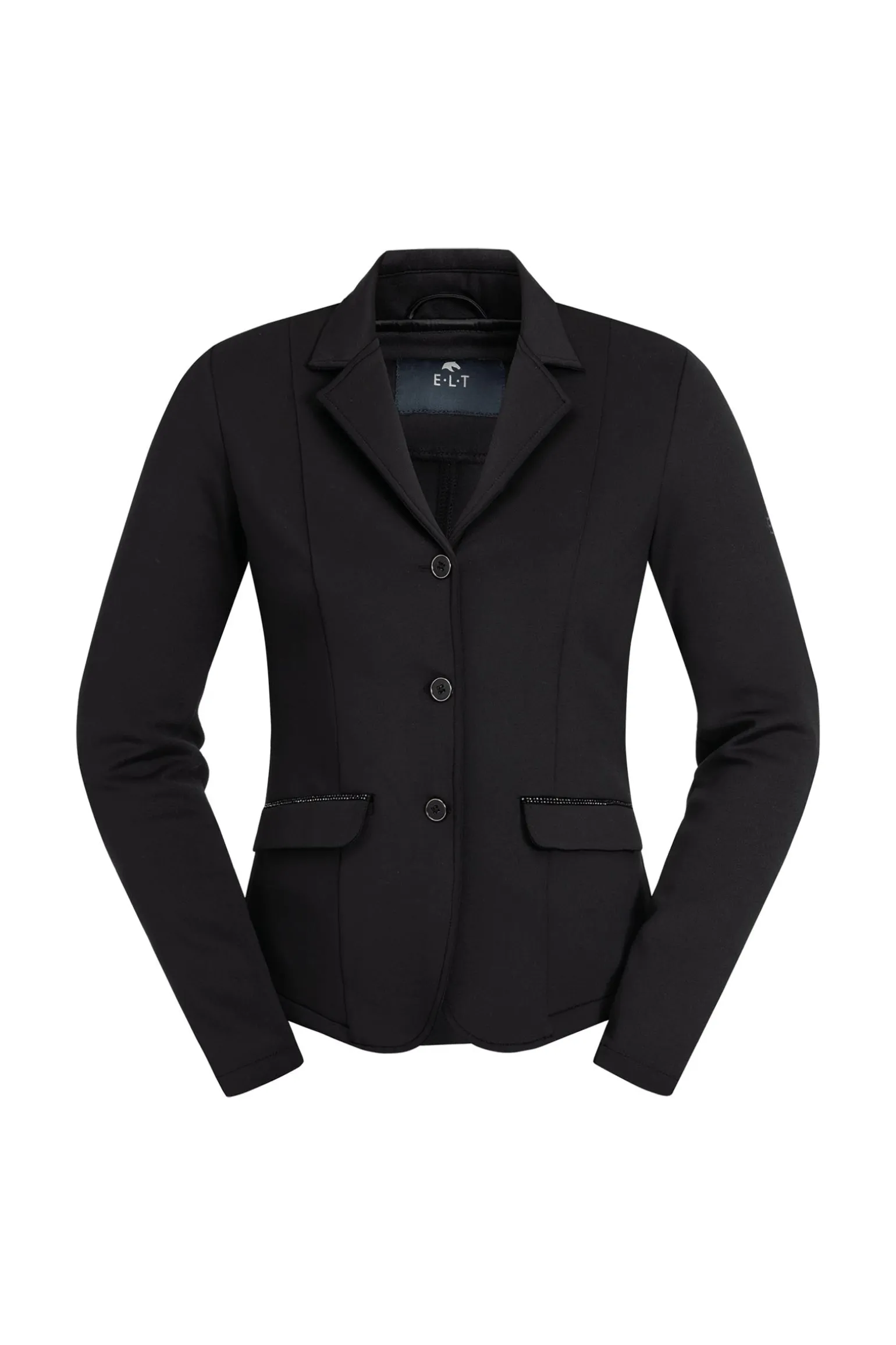 Dieses modische Turnierjacket von ELT bietet mit seinem atmungsaktiven und elastischen Material optimale Bewegungsfreiheit. Es verfügt über zwei praktische seitliche Eingrifftaschen und einem Reitschlitz auf der Rückseite. Seine taillierte Passform und die dekorativen Strasssteine an den Taschen machen es zu einem echten Hingucker.