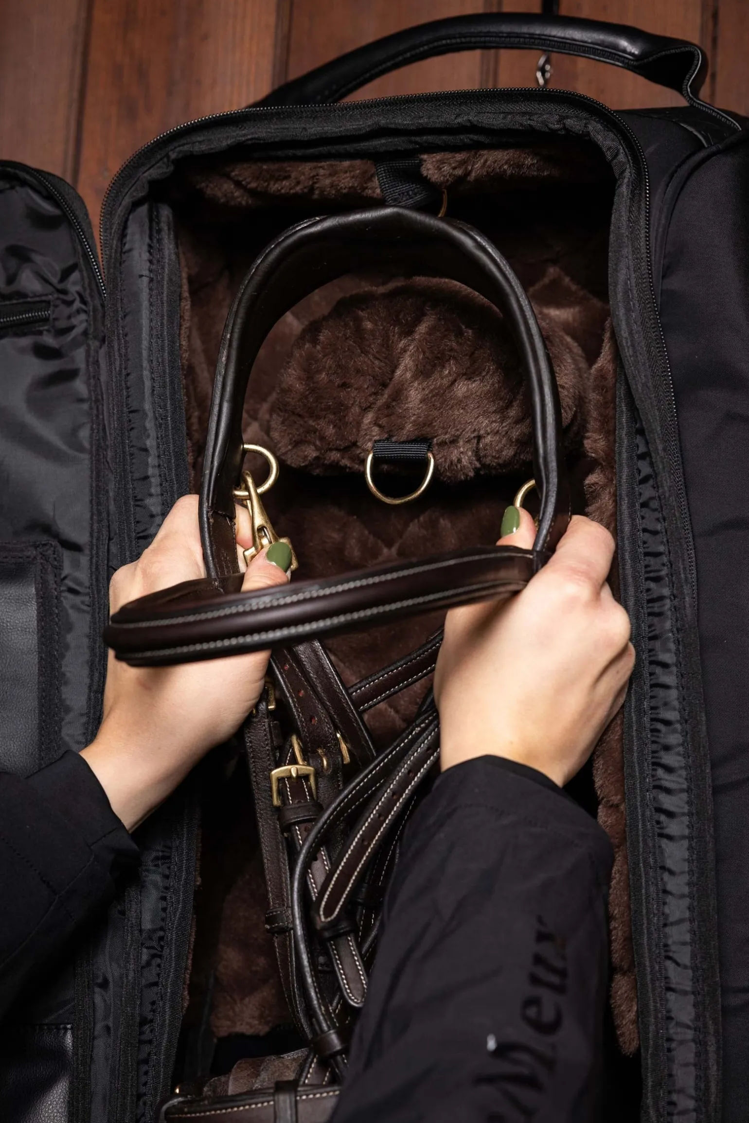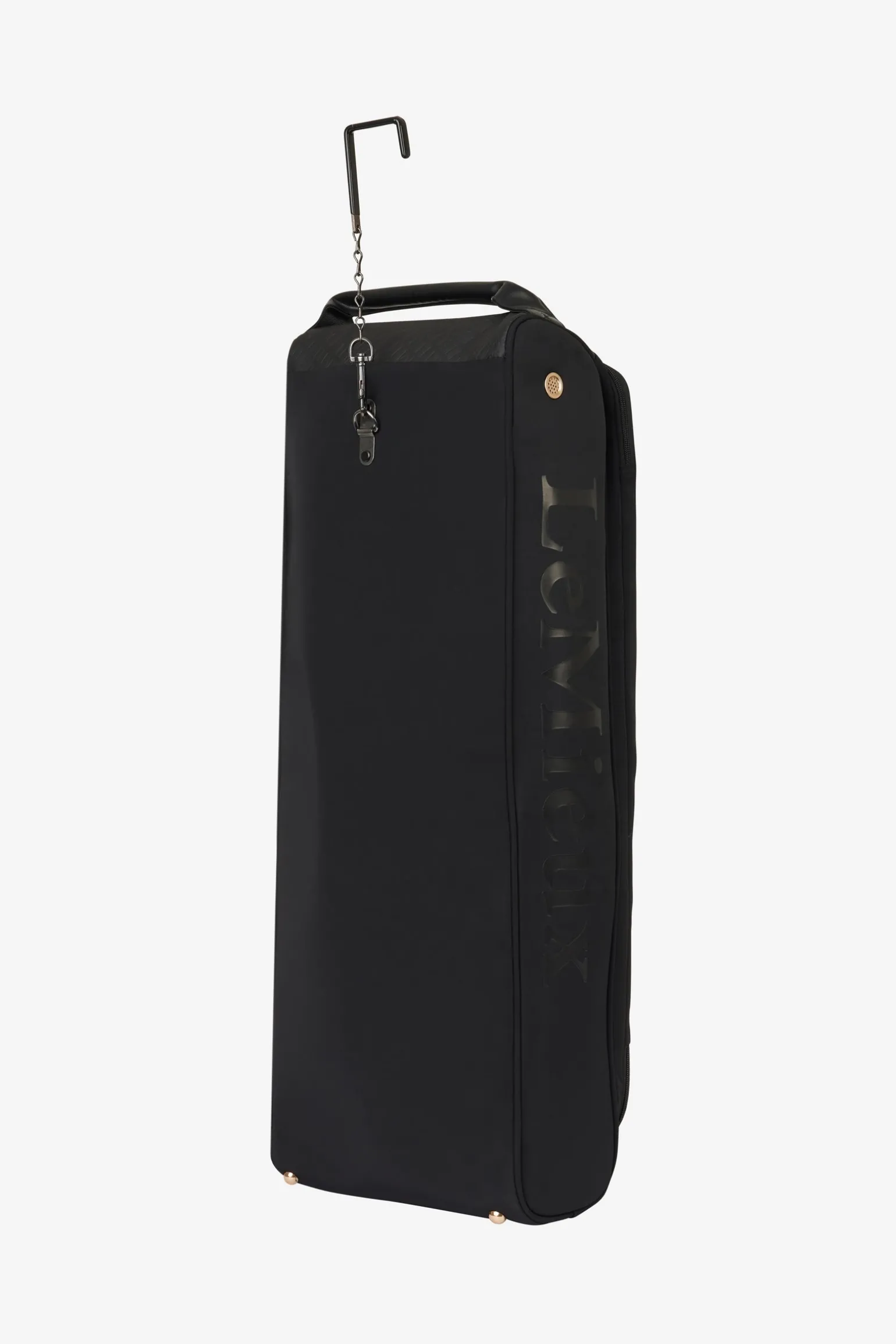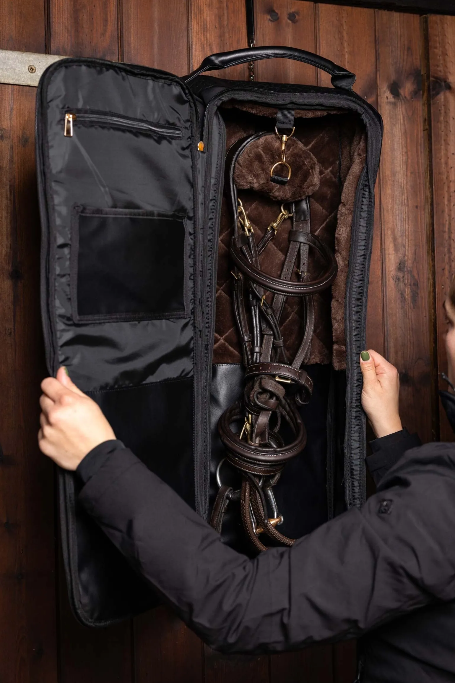 Diese luxuriöse Trensentasche bewahrt dein Zaumzeug sicher auf, schützt es und ermöglicht den bequemen Transport. Im Inneren findest du eine Aufhängung mit Haken, gefüttert mit super weichem, gestepptem Kunstfell, das zusätzlichen Schutz bietet. Großzügige Reißverschlussöffnungen, abwischbare Kunstlederplatten und Mesh-Luftöffnungen verhindern die Ansammlung von Feuchtigkeit. Der robuste, gerollte Kunstleder-Tragegriff oben, die vordere Reißverschlusstasche und mehrere Innentaschen bieten dir zusätzlichen Komfort und Stauraum. Ein starker Haken und eine Kette ermöglichen das einfache Aufhängen der Tasche. Diese Trensentasche passt perfekt zur Luxe Luggage Produktpalette und ist ideal für den Turnierreiter geeignet.
