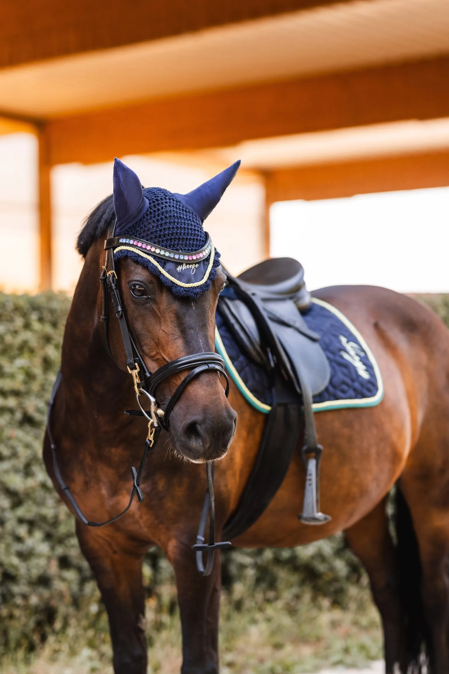 Klassisches gehäkeltes Hauptteil mit #Horze-Stickerei auf dem Schild. Der dehnbare Stoff um die Ohren erhöht die Passform und den Tragekomfort.