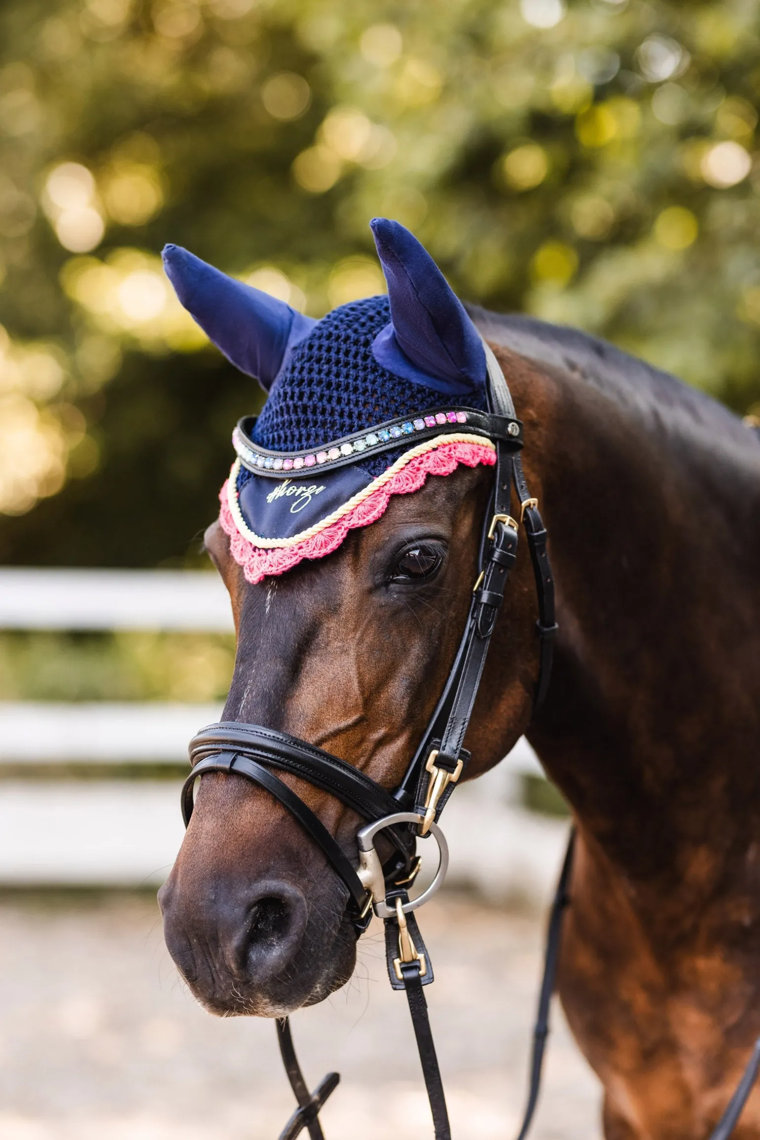 Klassisches gehäkeltes Hauptteil mit #Horze-Stickerei auf dem Schild. Der dehnbare Stoff um die Ohren erhöht die Passform und den Tragekomfort.