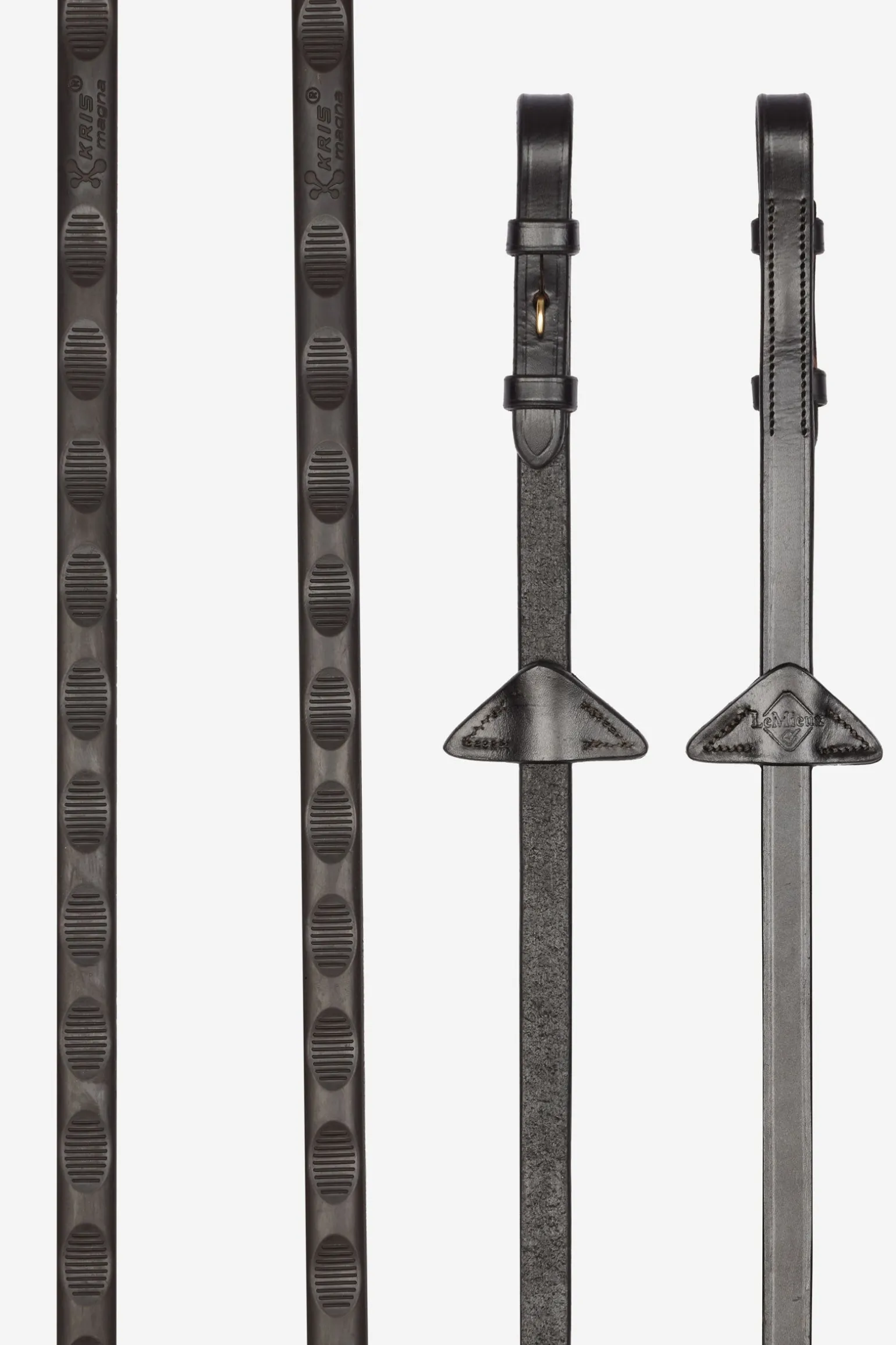 Diese gerade gearbeiteten Grip-Zügel mit strukturiertem Gummi haften an deinen Händen wie ein Magnet. Die Gummierung ist an die Daumenform angepasst und sorgt so bei jedem Wetter für besonders guten Halt. Das Leder ist mit einer Nyloneinlage verstärkt, um ein Ausleiern oder Reißen zu verhindern. Die typischen Martingalstopper aus geprägtem LeMieux-Leder setzen einen stilvollen Akzent. Zügelschnallen zur Befestigung am Gebiss runden das Design ab.