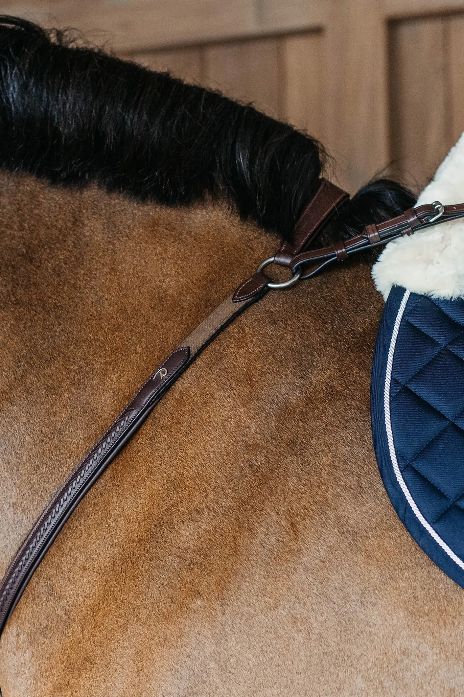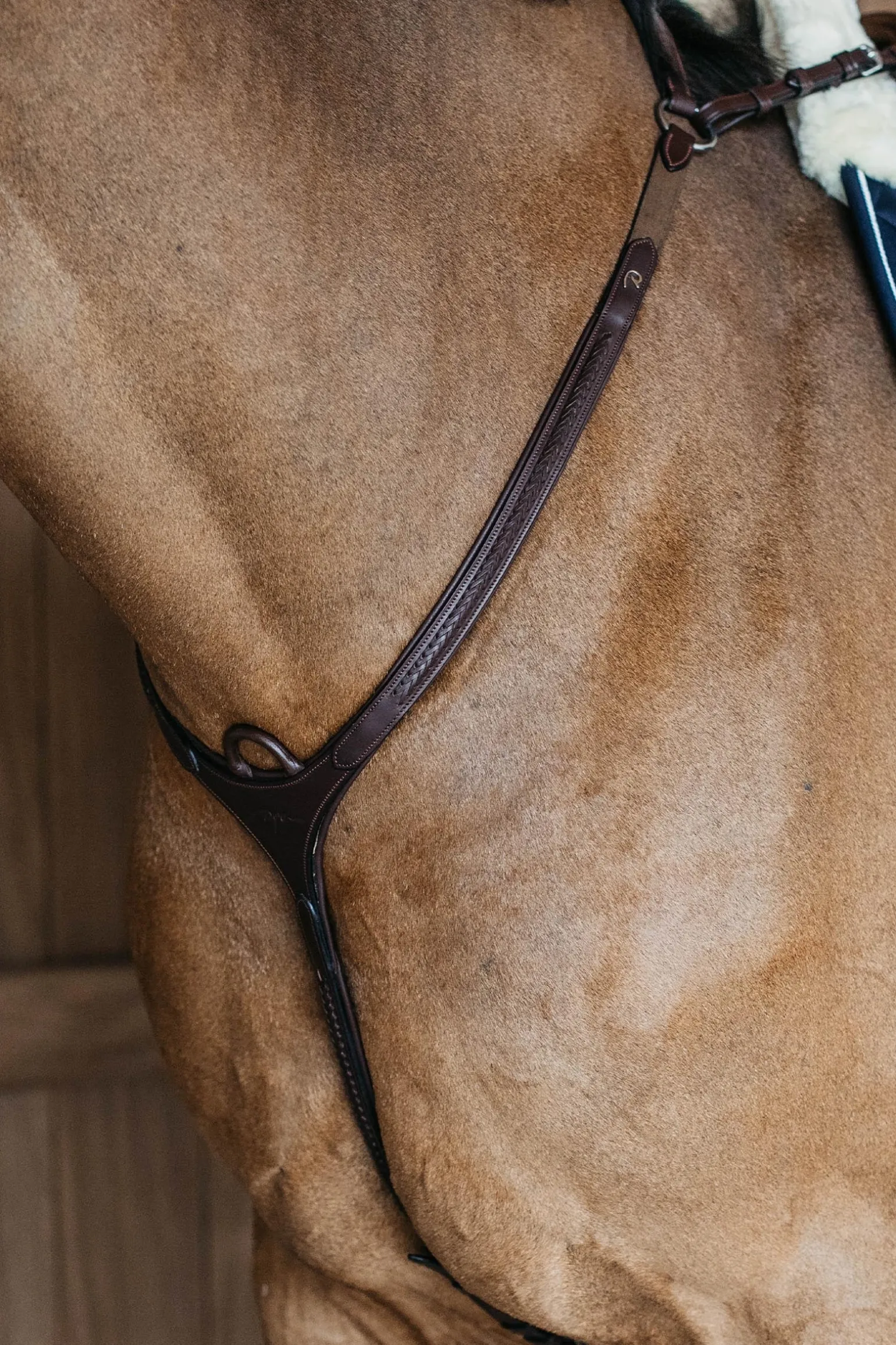 Ein stilvolles und elegantes Vorderzeug mit geflochtenen Details, das Komfort und ein edles Design verbindet. Es verfügt über drei Befestigungspunkte, um den Sattel sicher in Position zu halten. Eine Martingalgabel kann ganz einfach am Ledergriff befestigt werden. Dieses Vorderzeug eignet sich für den täglichen Einsatz – mit Fokus auf das Wohlbefinden und die Leistung deines Pferdes. Es gehört zur New English Kollektion, d. h. die Nahtfarbe ist farblich auf die Trense abgestimmt.