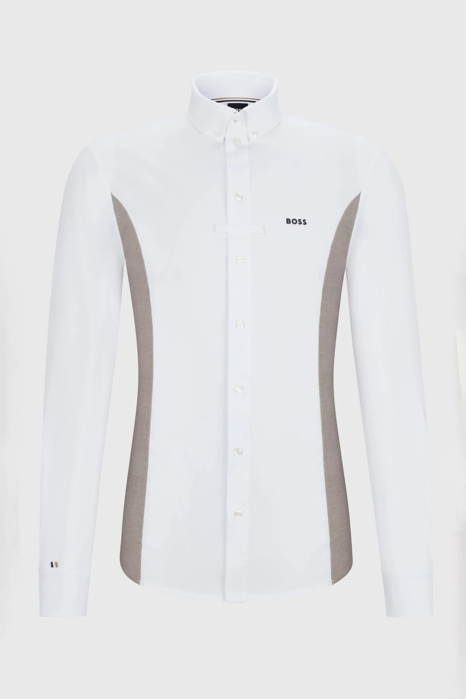Turniershirt mit seitlichem Einsatz in Pfeffer & Salz Stoffoptik in Camel mit charakteristischer Knopfleiste am Kragen und einem BOSS Logo auf der linken Brust. Der mittlere Teil der Bluse ist aus Cotton Stretch. Die anderen Teile der Bluse sind aus hochelastischem Funktionsjersey gefertigt. Der Kragen ist als Doppellage gearbeitet. Kleines Signature Stripe Flag am rechten Arm oberhalb der Manschette.