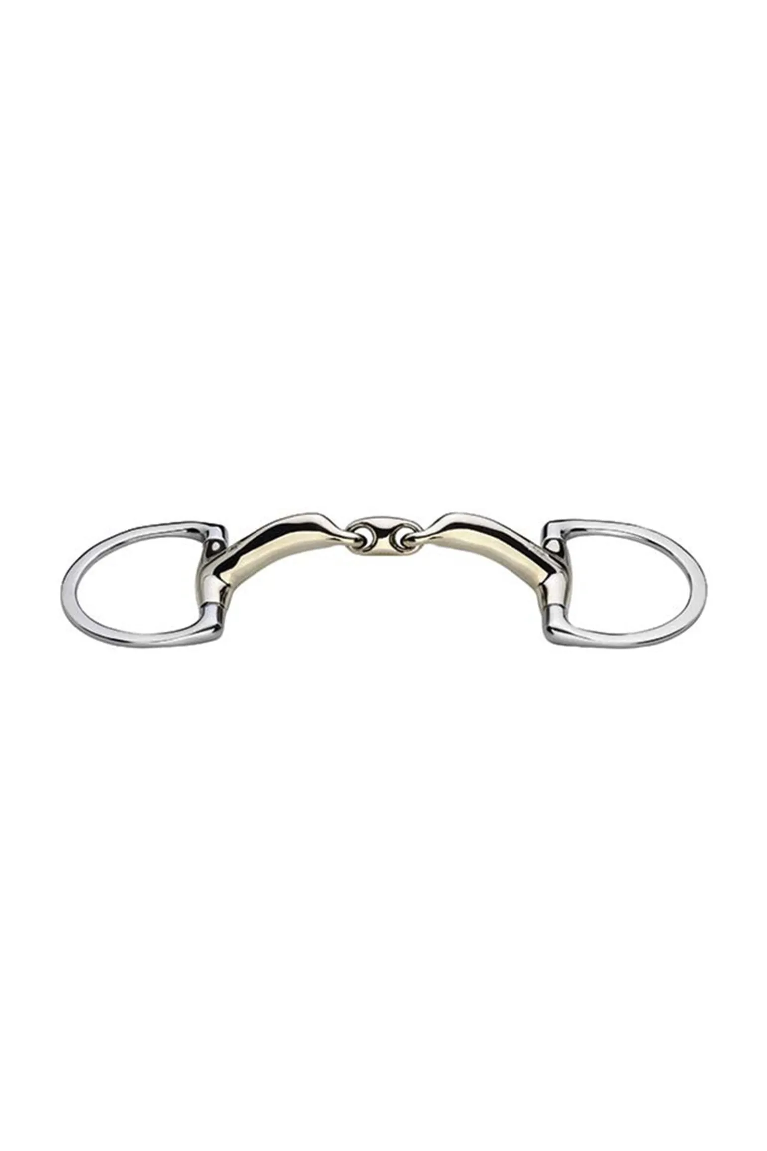 Bereit für den modernsten Standard pferdefreundlicher Gebisse? Die innovativen novocontact-Gebisse sind einzigartig oval geformt. Dadurch liegen die Gebisse mit breiter Fläche auf der Pferdezunge auf, solange eine leichte Anlehnung gehalten wird. Erst, wenn der Reiter verstärkt über den Zügel einwirkt, dreht sich das Mundstück nach vorn. Dadurch verringert sich für einen Augenblick die Auflagefläche auf der Zunge. So kommt das Signal einfühlsam und effektiv beim Pferd an und dem Reiter wird eine effektive Hilfengebung ermöglicht. Auf diese Weise unterstützen die novocontact-Gebisse eine optimale Kommunikation und ebnen den Weg für eine verbesserte Anlehnung zwischen Pferd und Reiter. Das doppelt gebrochene Olivenkopfgebiss mit D-förmigem Ring wirkt leicht begrenzend und liegt ruhig im Maul. Gleichzeitig trägt es zur Schonung der empfindlichen Maulwinkel bei. Das Modell ermöglicht eine direkte Übertragung der Zügelhilfe. Aufgrund der modernen novocontact-Geometrie ist dieses doppelt gebrochene Modell eine gute Wahl für Pferde, die gelegentlich stark werden, aber zu sensibel für einwirkungsstärkere Gebisse sind. Auch im Rahmen unserer Praxistests haben diese Pferde positiv auf das Gebiss reagiert. Es liegt ergonomisch angepasst im Pferdemaul, verfügt über eine große Auflagefläche auf der Zunge und unterstützt so eine weiche, aber klare Einwirkung.