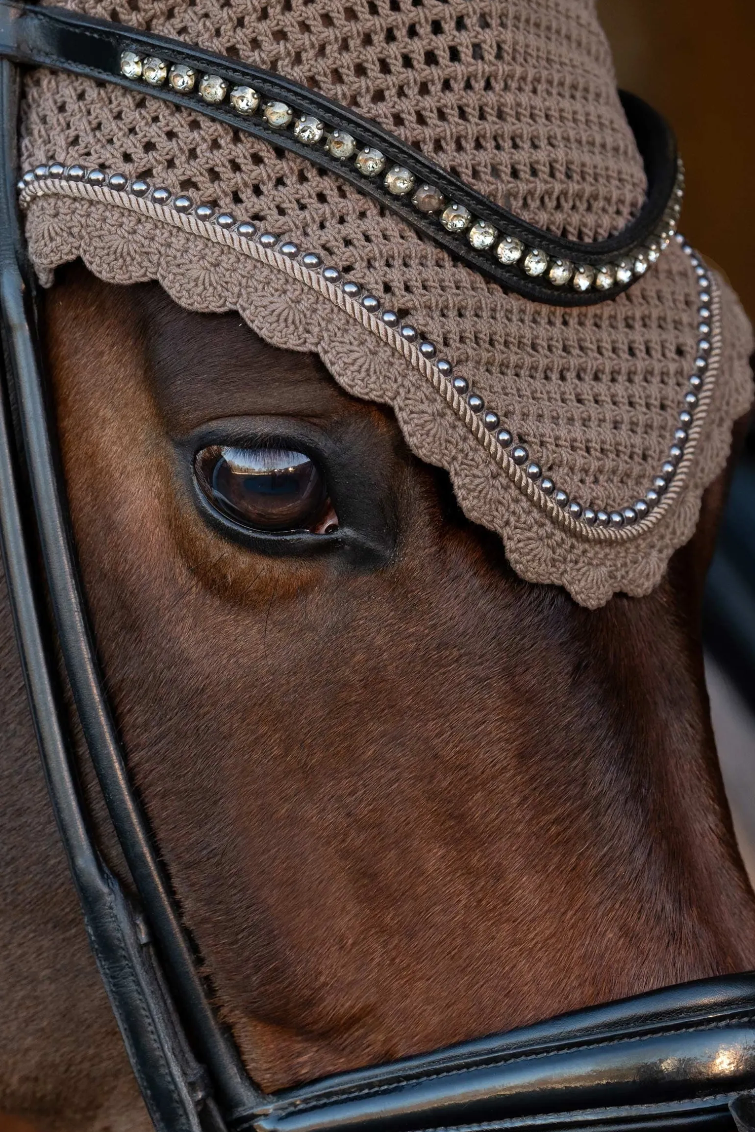 Diese stilvollen Fliegenohren sind aus gehäkeltem Baumwollgarn gefertigt, das für eine weiche und bequeme Passform sorgt. Mit innovativen, atmungsaktiven Softshell-Ohren bieten sie hervorragende Belüftung und Komfort für dein Pferd. Die elegante Kombination aus Kordel und Perlen verleiht einen Hauch von Raffinesse, während der Eskadron-Schriftzug am Ohr ein dezentes Branding-Detail hinzufügt.