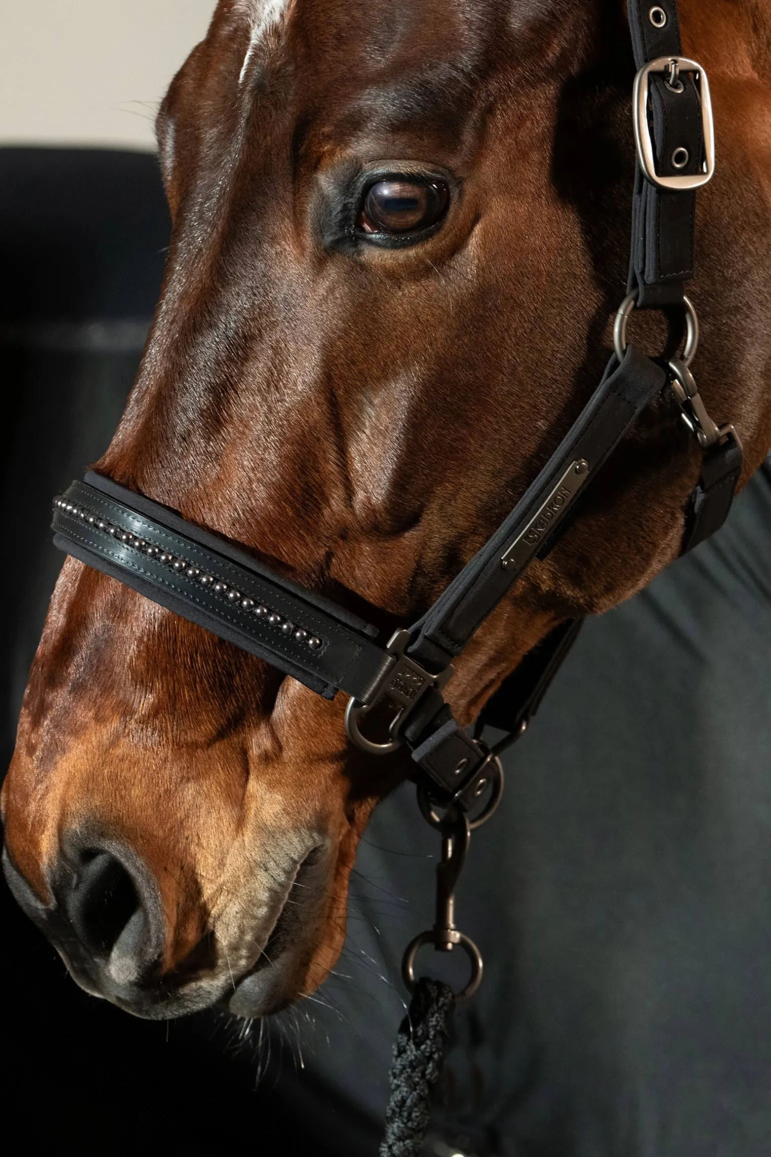 Dieses Halfter verfügt über eine robuste Softshell-Oberfläche und ein reißfestes Gurtband innen für zusätzliche Haltbarkeit. Weiche Polsterung an der Nase und dem Stirnriemen sorgt für Komfort, während Pin-Schließen auf beiden Seiten eine optimale Anpassung ermöglichen. Eine zusätzliche Anpassungsmöglichkeit im Kinnbereich bietet mehr Flexibilität. Die hochwertigen taupefarbenen Metallbeschläge und die eingefügten Perlen am Nasenriemen verleihen Eleganz, und die Eskadron Metallplatte auf der linken Seite verstärkt das anspruchsvolle Design.