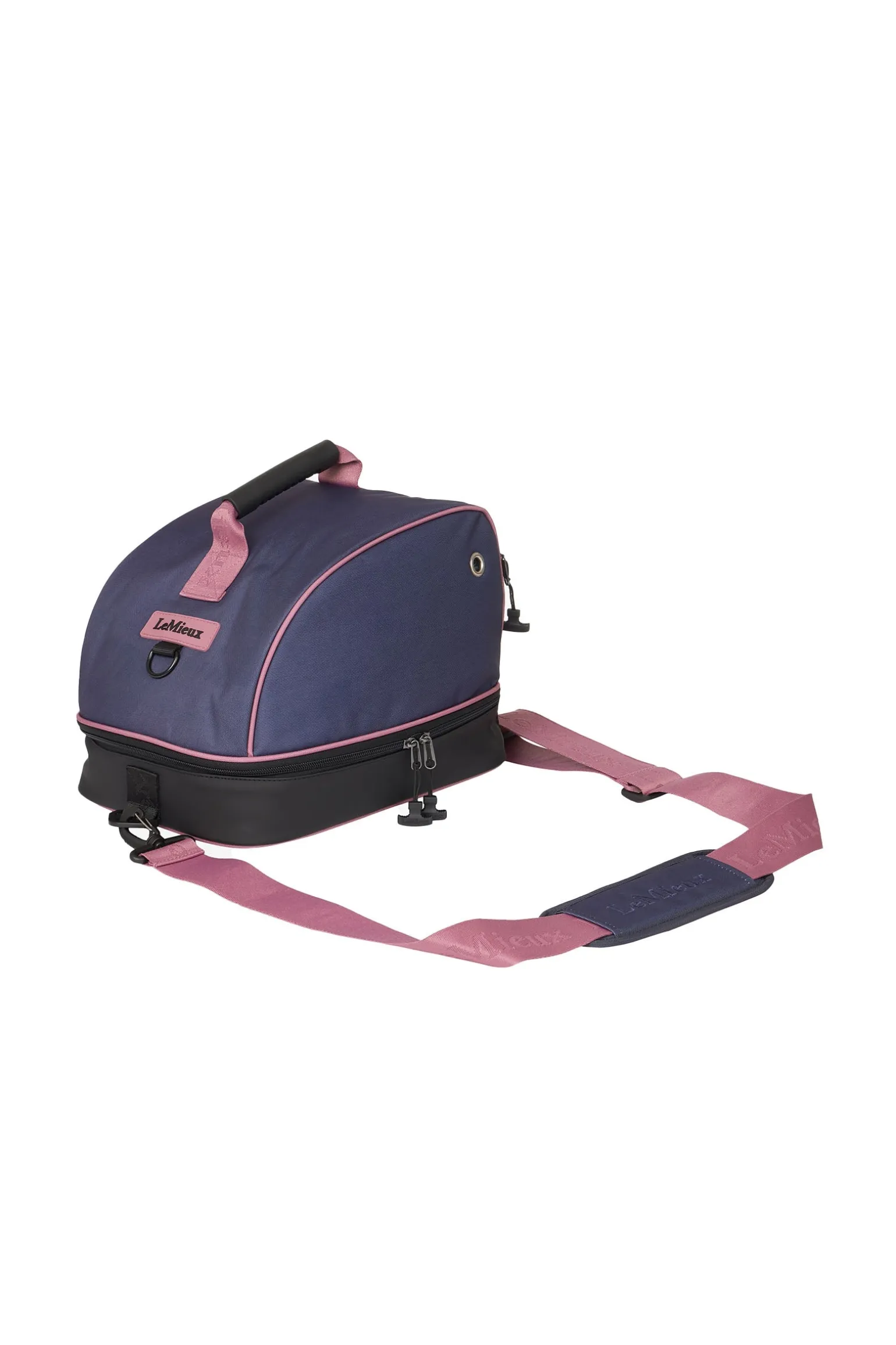 Die leicht zu reinigende, strapazierfähige Hutbox von LeMieux erleichtert das Verstauen und Tragen Ihres Turnier-Reithelms.