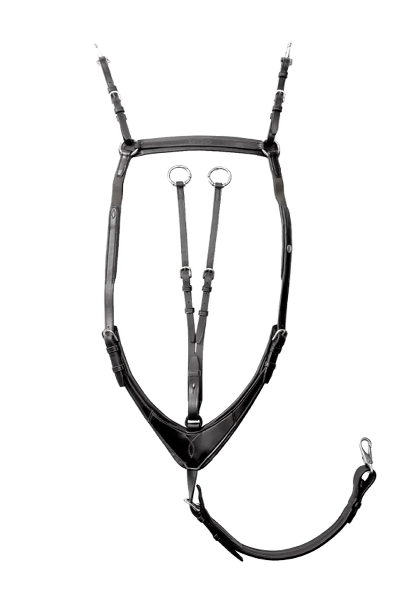 Das Vorderzeug aus hochwertigem deutschem Leder bietet eine perfekte Kombination aus Funktionalität und Komfort. Die Schulterriemen mit Elasteinsatz sorgen für mehr Flexibilität und erhöhten Komfort. Die Martingalringe sind zum Öffnen konzipiert, was das Handling erleichtert und das Entschnallen der Zügel überflüssig macht. Der feste Brustriemen ist vorne verstellbar, sodass er individuell an das Pferd angepasst werden kann.