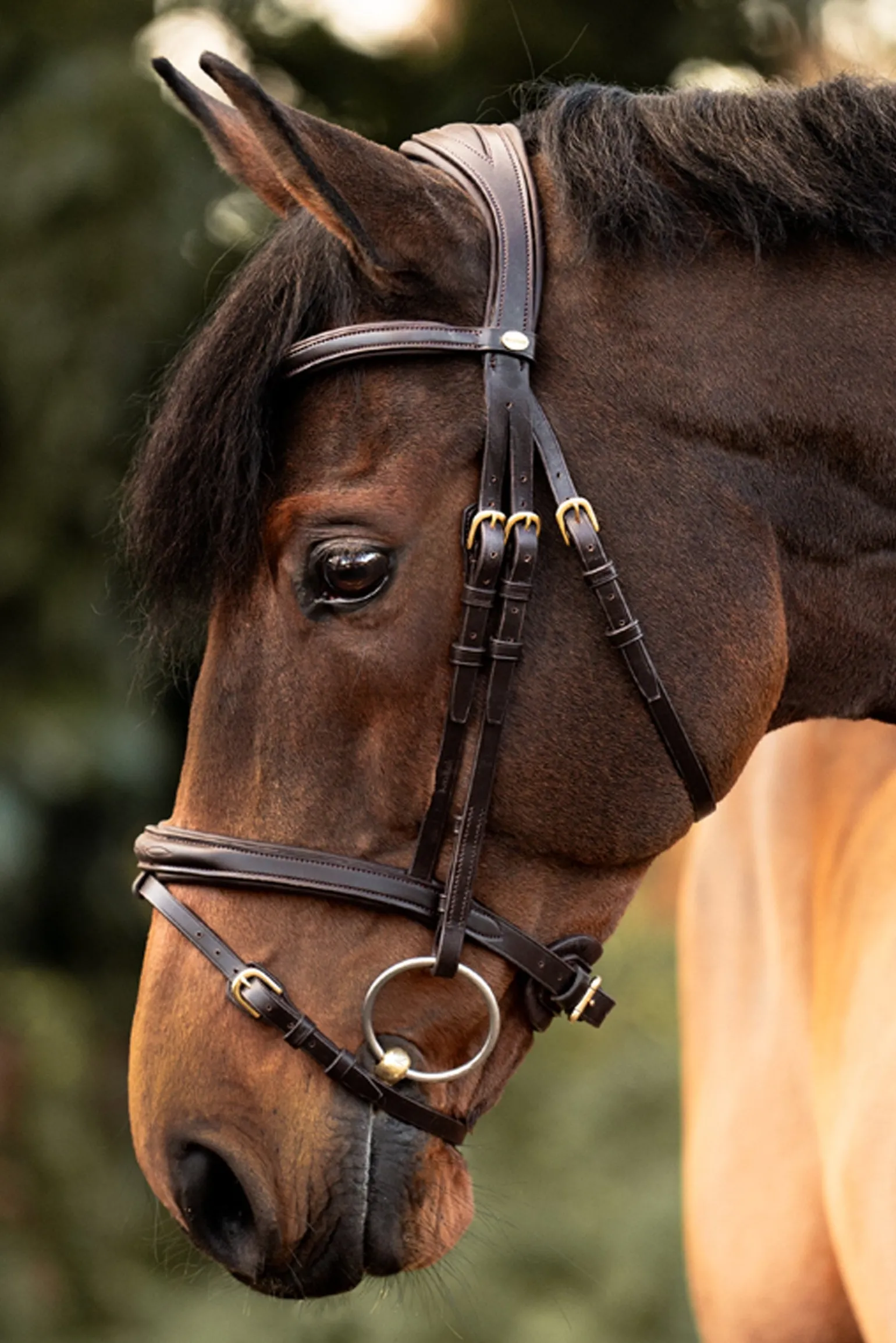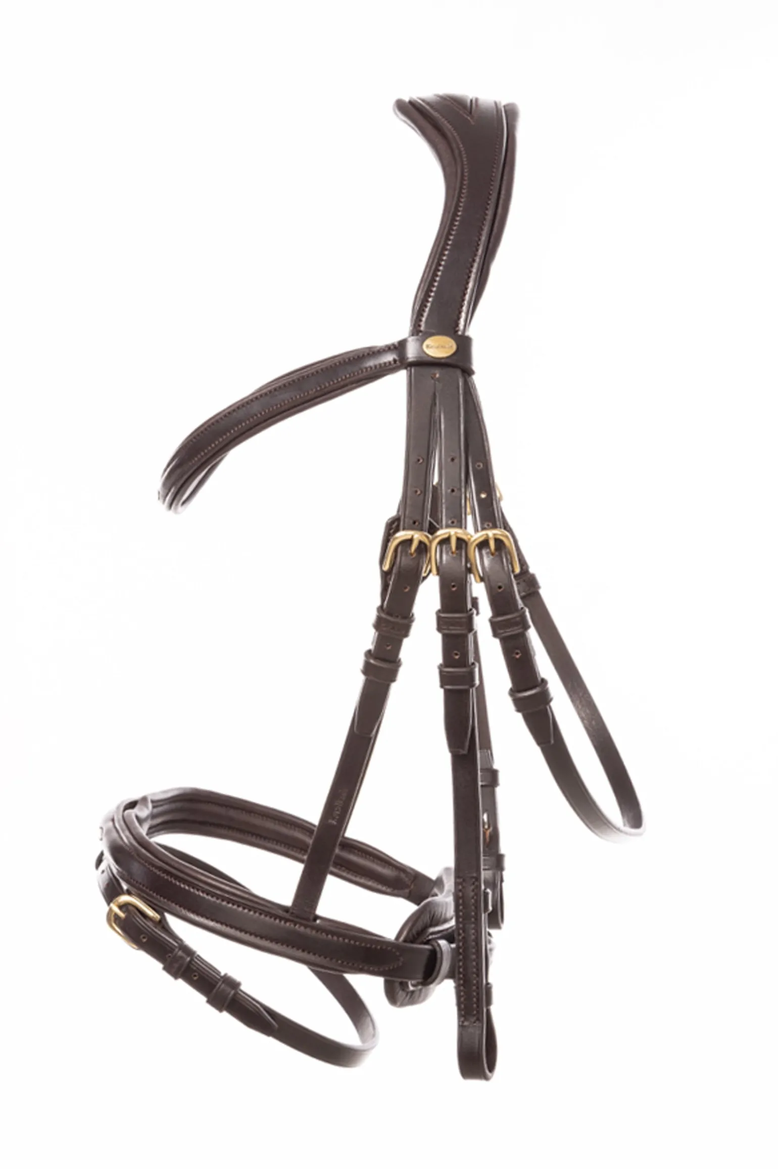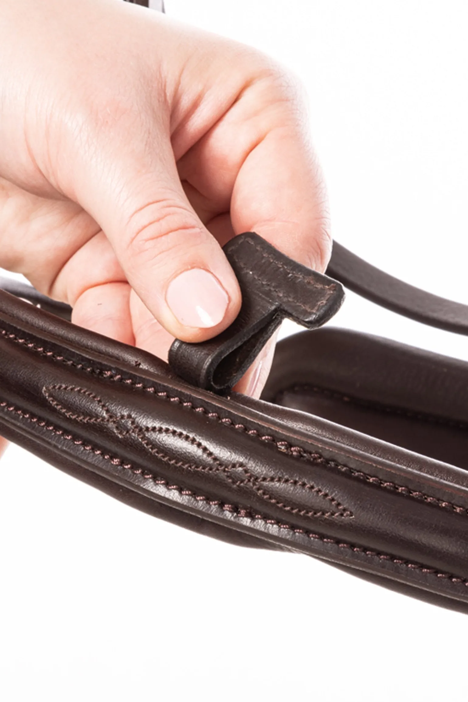 Bei Trensen mit dem Zusatz KavalSH4 ist der Sperrriemen abnehmbar. Das Besondere daran ist, dass die Halterung für den Sperrriemen nicht, wie bei herkömmlichen Trensen mit abnehmbarem Sperrriemen, ersichtlich ist.