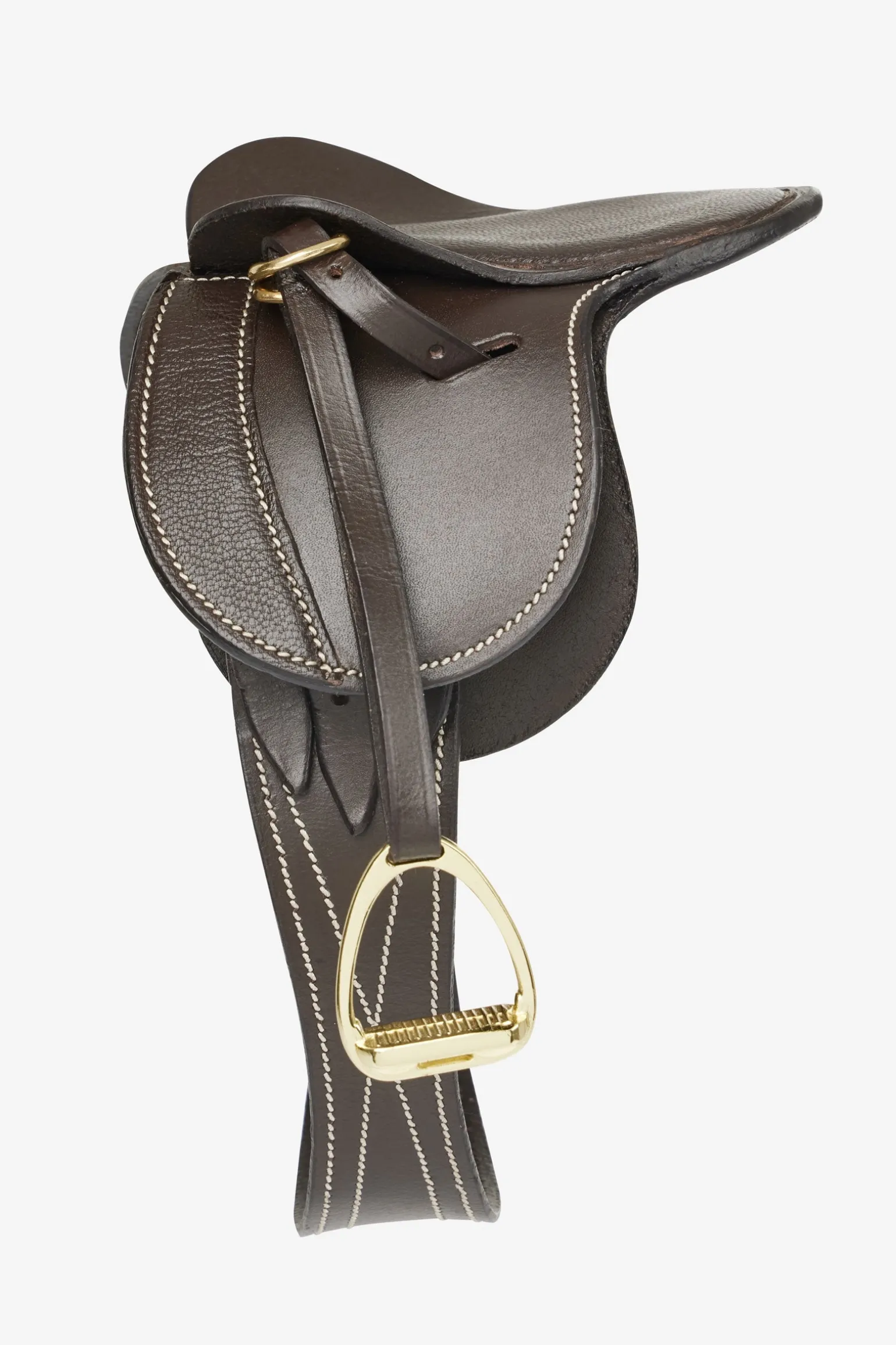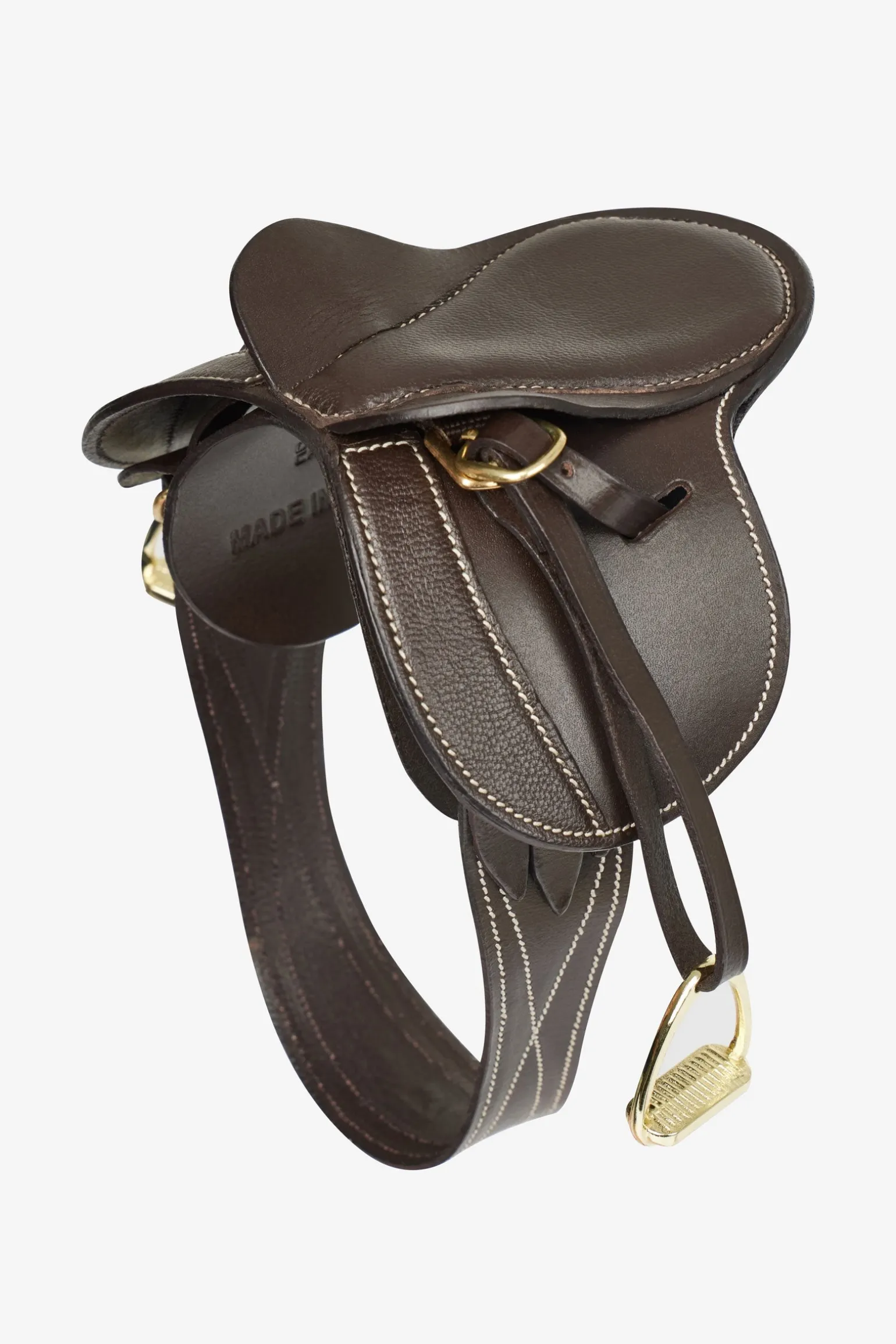 Exquisit gearbeiteter Miniatursattel aus schönem, fein genarbtem Leder. Echte Designmerkmale wie eine doppeltes Sattelblatt mit drei Gurtstrupfen und Schnallenschutz. Komplett mit abnehmbarem Sattelgurt und Steigbügeln aus Metall – ideal, um die Teile des Sattels kennenzulernen, das Aufsatteln zu üben und das Sattelzeug zu reinigen.