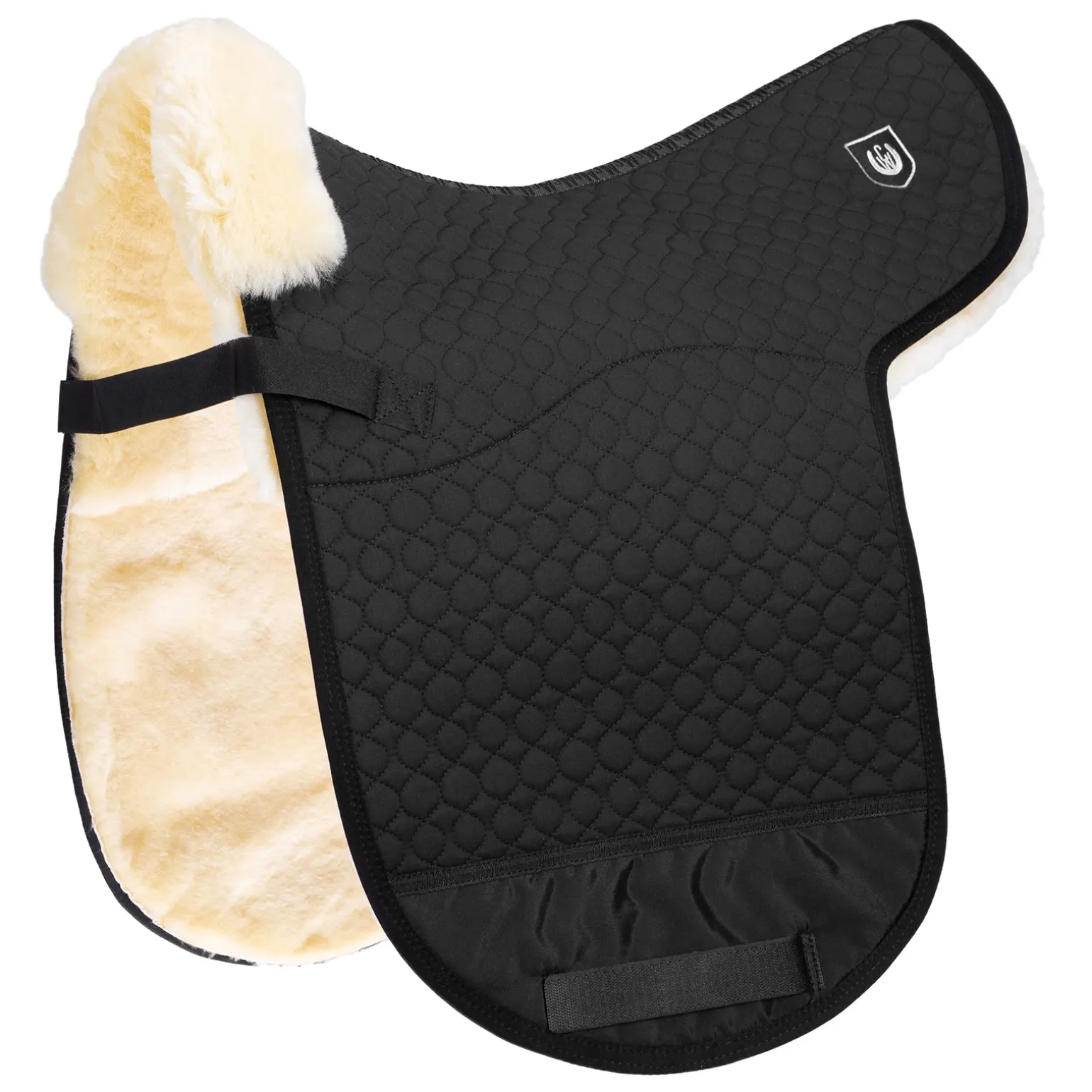 D-Dressur. Auf der Unterseite komplett aus echtem Lammfell mit 2 verschiedenen Wollhöhen gefertigt. Im Sitzbereich mit ca. 30mm Wollhöhe, an den Seiten ca. 15mm Wollhöhe für eine enge Verbindung zum Pferd. Die Befestigung erfolgt mit Klettstrupfen an den Gurtriemen des Sattels und durch eine Gurtführung am Blattende. Der eingearbeitete Nylonschutz verhindert das Aufscheuern im Bereich der Sattelgurtung. Vorne wird das Lammfell bis auf die Oberseite herumgezogen und dient als Sattelanlage. Maschinenwaschbar mit einem Lammfellwaschmittel sowie trocknerbeständig. Als Waschmittel empfehlen wir unser Produkt „C7“. Bitte beachten Sie unsere Pflegehinweise.