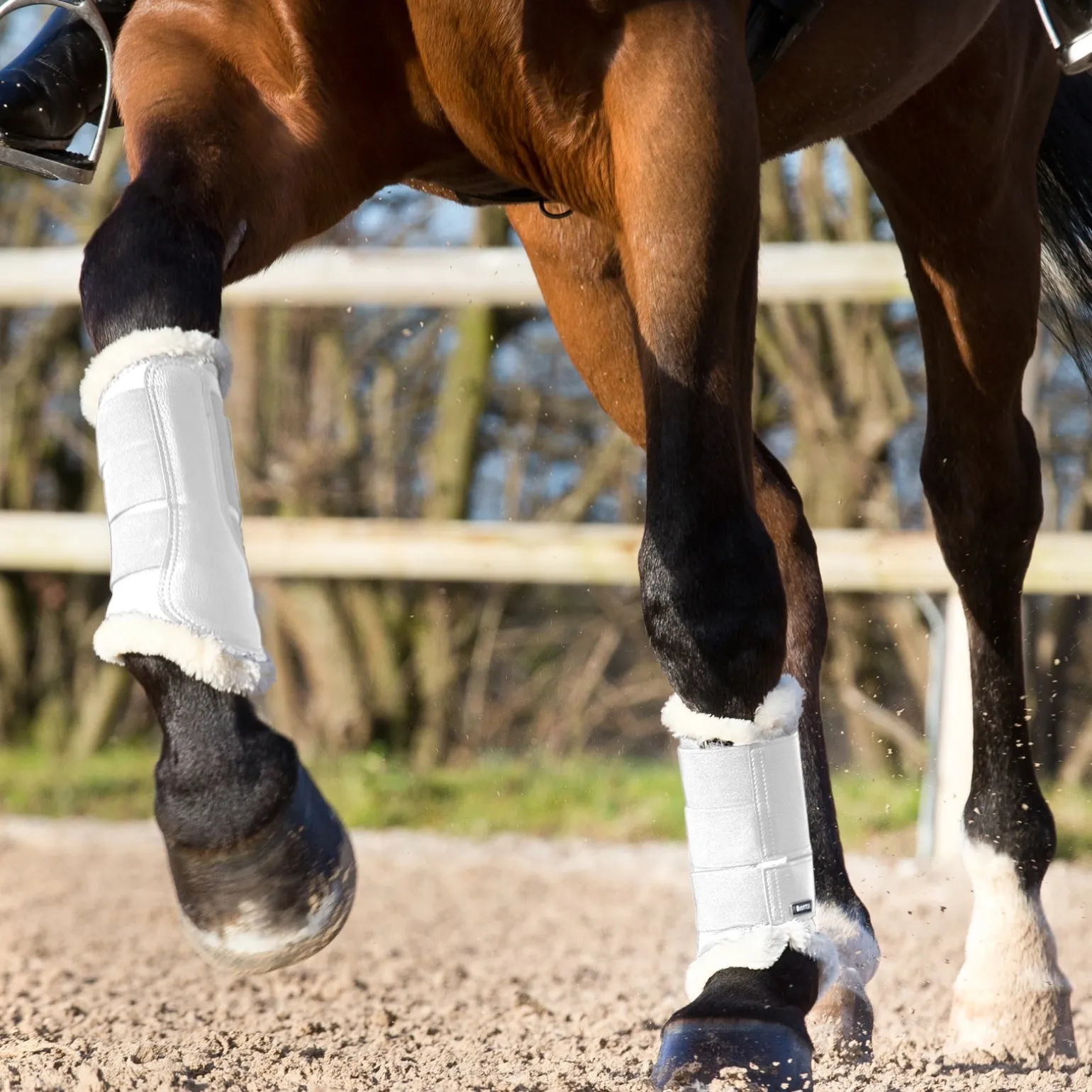 Die qualitativ hochwertigen Gamaschen schützen Ihr Pferd während des Trainings oder des Turniers mit einem weichen Fellimitat aus Schaffell und einer harten, aber flexiblen Hülle. Diese Gamaschen umschließen das Röhrbein und den Fesselkopf und bieten Schutz vor Schlägen und Stößen.