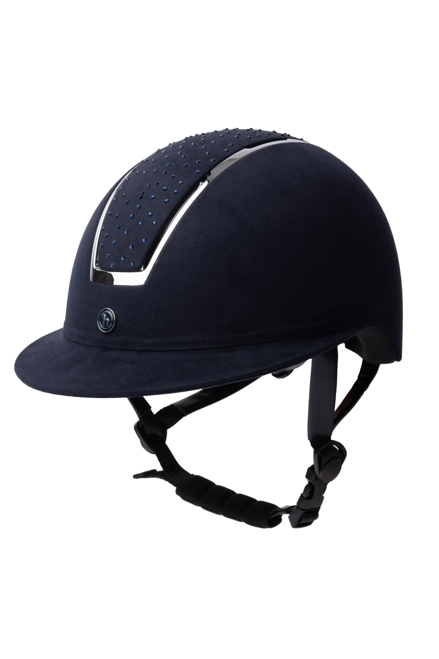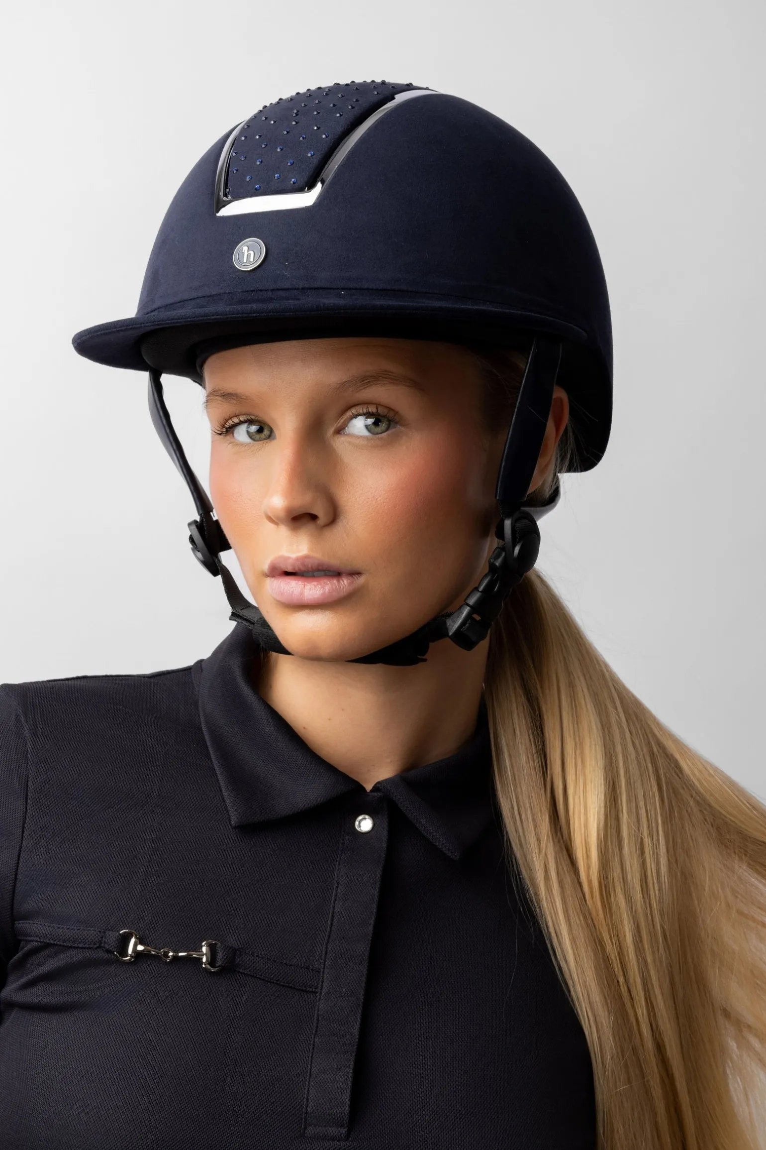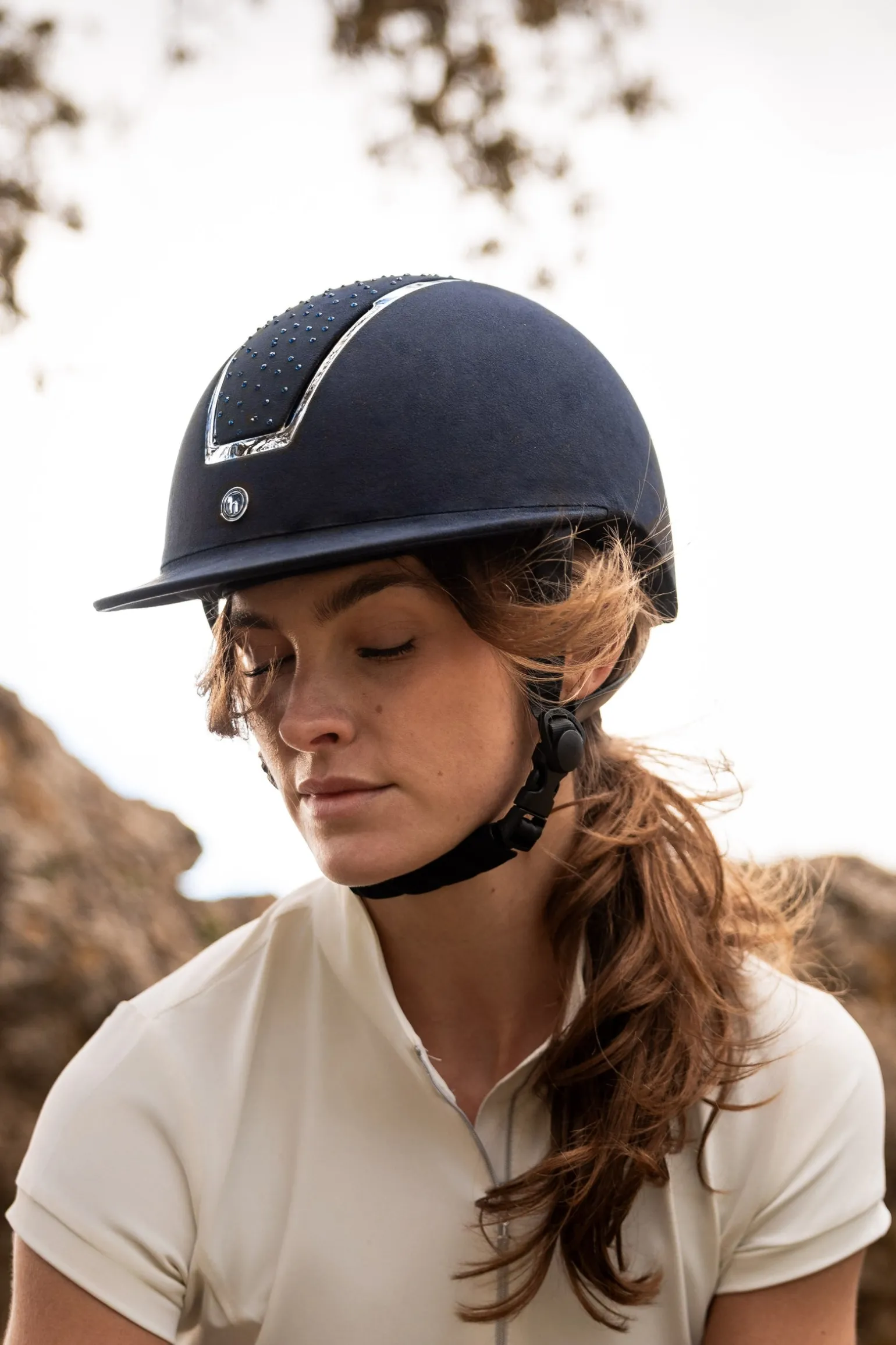 Der Horze Solara Reithelm entspricht der VG1-Norm und bietet weitere zusätzliches Extras. Die Lüftungsöffnungen vorne, oben und hinten sorgen für hervorragende Luftzirkulation, so kannst du dich entspannen und auf die wichtigen Dinge konzentrieren, ohne dich um deinen Kopf sorgen zu müssen. Das besonders breite Visier schützt deine Augen und verhindert, dass du von der Sonne geblendet wirst. Das Innenfutter aus Memory-Schaum passt sich an die Konturen deines Kopfes an und sorgt für noch mehr Tragekomfort. Die inneren Befestigungen sind mit einem Drehrädchen einstellbar, für die perfekte Passform und um Rutschen zu verhindern. Der Kinnriemen ist als zusätzlicher Halsschutz konzipiert und gepolstert, für sicheren und bequemen Sitz. Eine weitere Raffinesse ist die Schnellverschluss-Schnalle. Das attraktive Design mit den auffälligen Kristallen verleiht dir Eleganz.