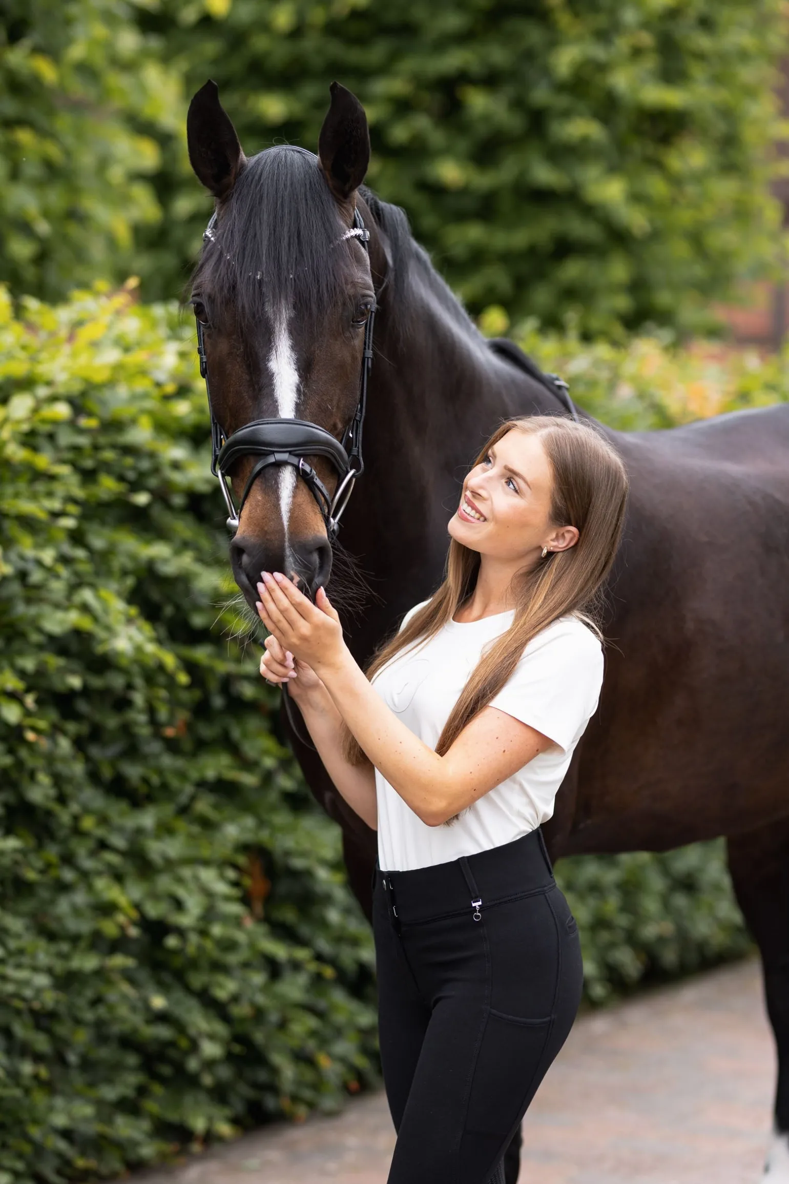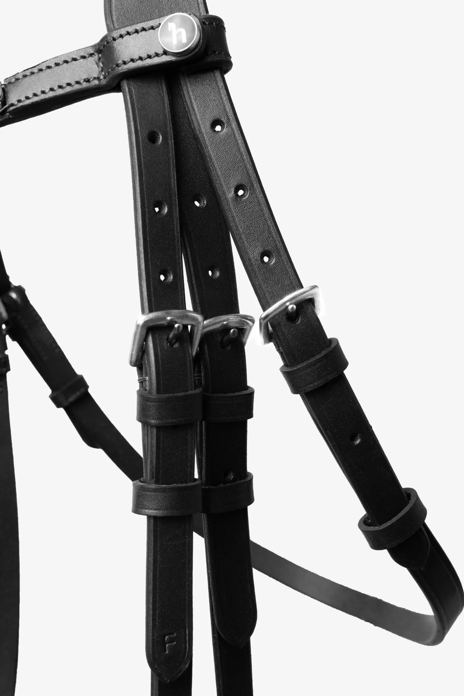 Die Horze Somerset Trense ist anatomisch geschnitten und an Nase und Genick gepolstert, um deinem Pferd den höchsten Komfort zu bieten. Der U-förmige Stirnriemen sorgt mit glitzernden Kristallen für einen eleganten Look. Praktische Druckknöpfe machen ihn einfach auswechselbar, wenn du mal einen einfarbigen Stirnriemen brauchst. Metallbeschläge passen perfekt zu dem weichen Nappaleder der Trense.