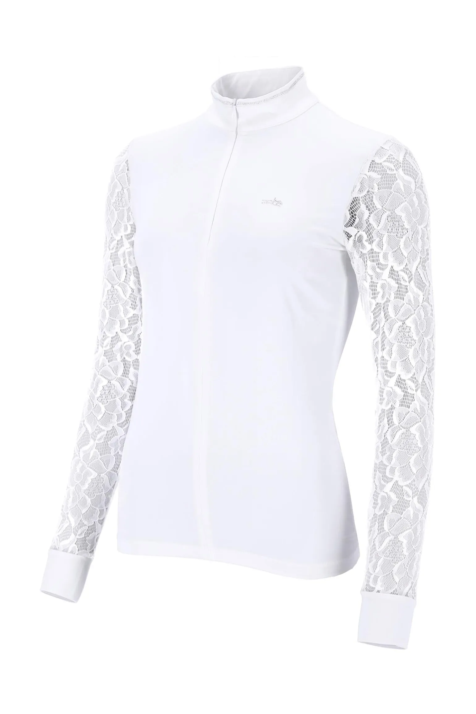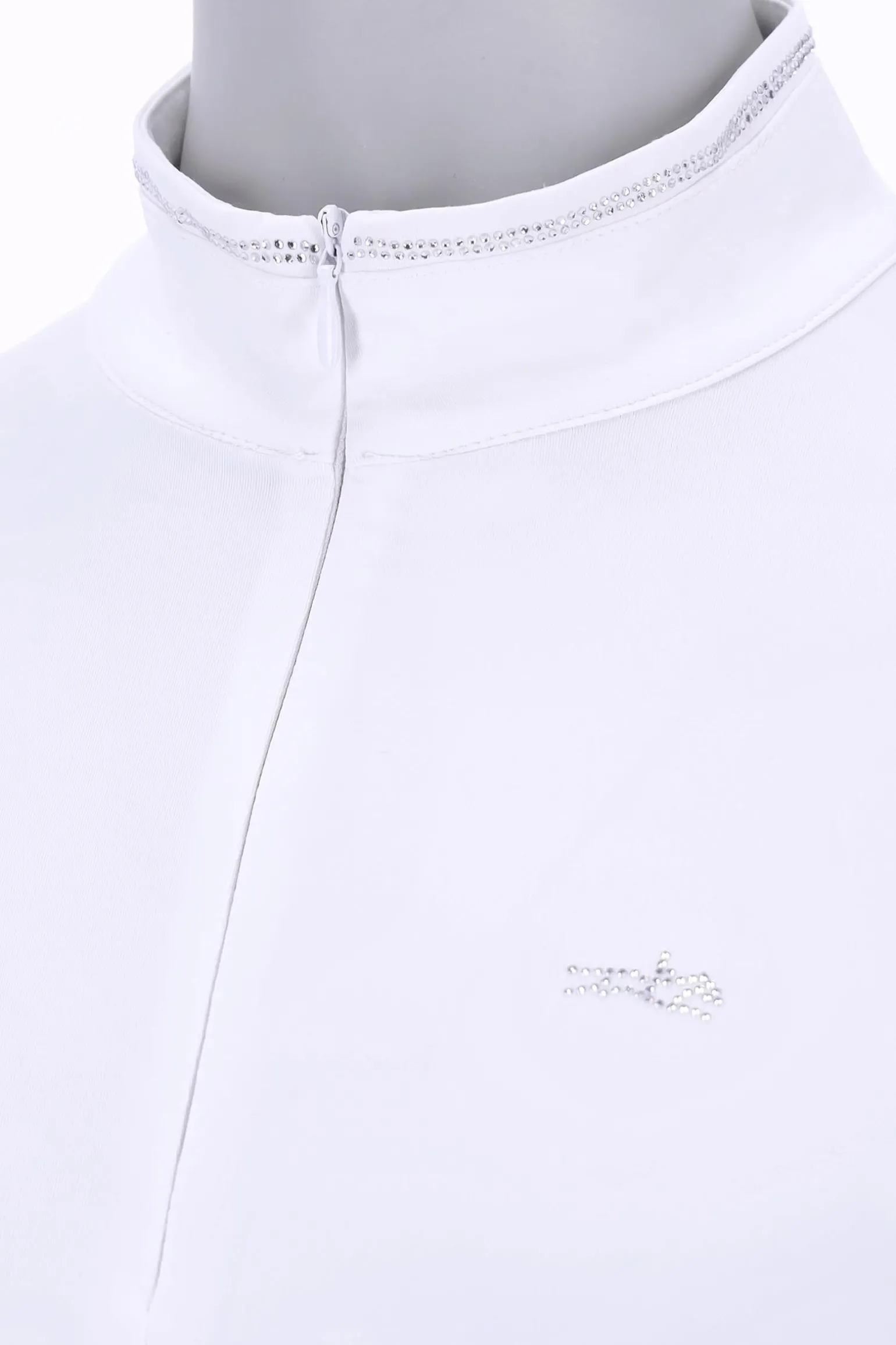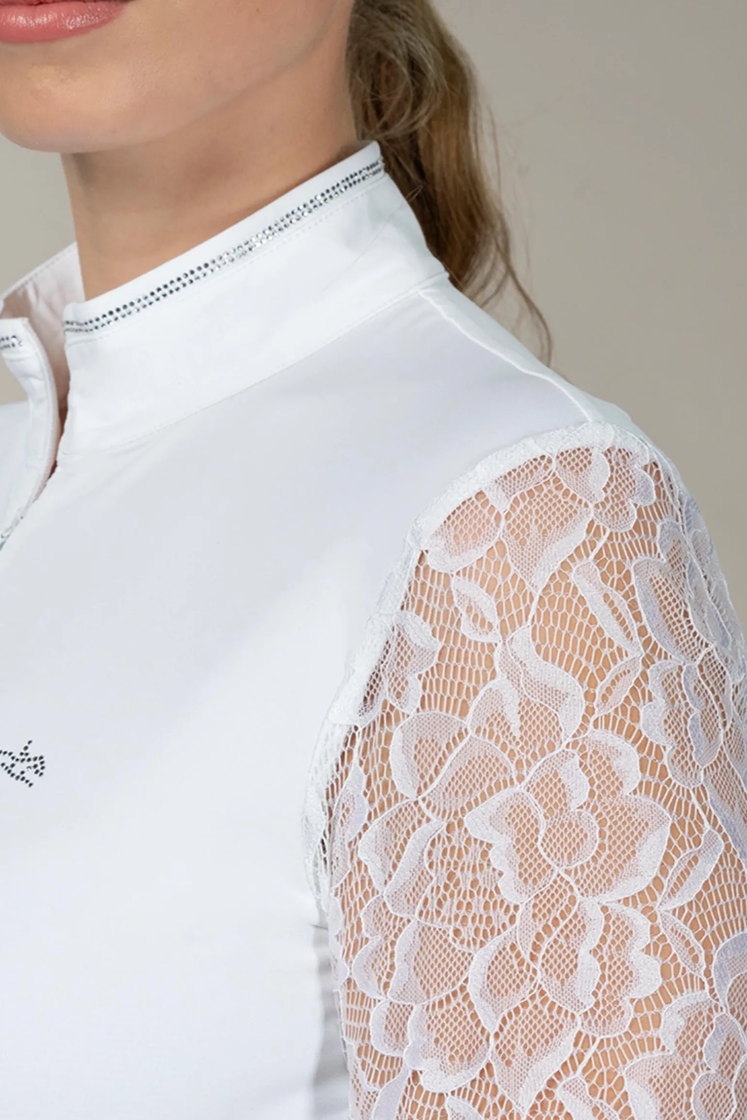 Das SPAlicia Damen Turniershirt vereint dekorativen Stil mit elegantem Design! Dieses dekorative Turniershirt verfügt über einen unsichtbaren Reißverschluss in der vorderen Mitte, der für eine schlanke Silhouette sorgt. Der Stehkragen ist mit einer schimmernden Strass-Verzierung versehen, die dem Shirt einen Hauch von Glamour verleiht. Die Ärmel aus Spitze mit Manschetten sorgen für eine feminine Note und schaffen einen einzigartigen Look. Ein Logo-Strass-Pferd im Brustbereich rundet das Design ab und setzt einen modischen Akzent.