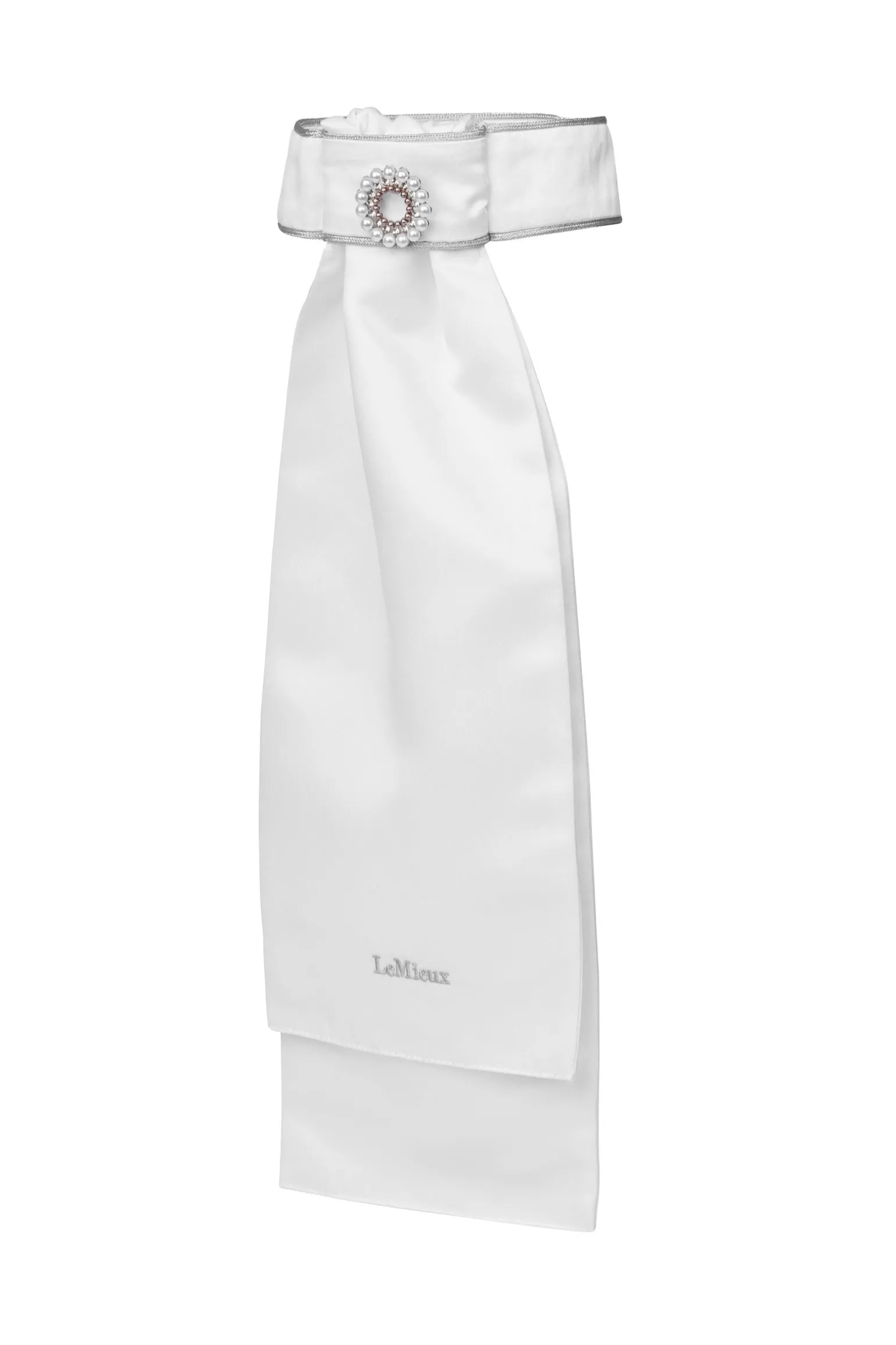 Ein wunderschön verziertes, vorgebundenes Plastron aus weichem, atmungsaktivem Satinstoff mit geraffter Frontpartie und bestickter Einfassung, veredelt mit einer fest angebrachten, dekorativen Plastronnadel mit Perlen. Der Klettverschluss im Nacken sorgt für eine verstellbare Passform und einfaches Anlegen.