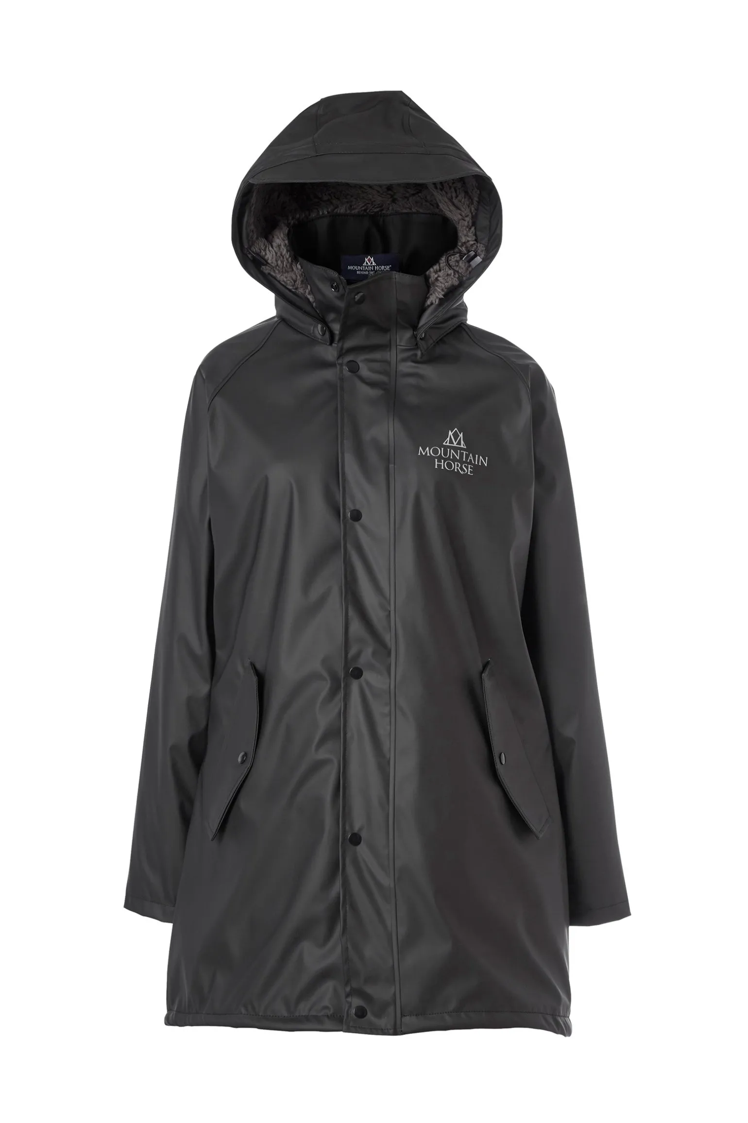 Vollständig wasserdichter Regenmantel mit verschweißten Nähten. Gefüttert mit kuschelig weichem Plüschstoff. Große Taschen auf der Vorderseite, Reitschlitz auf der Rückseite und reflektierende Details.