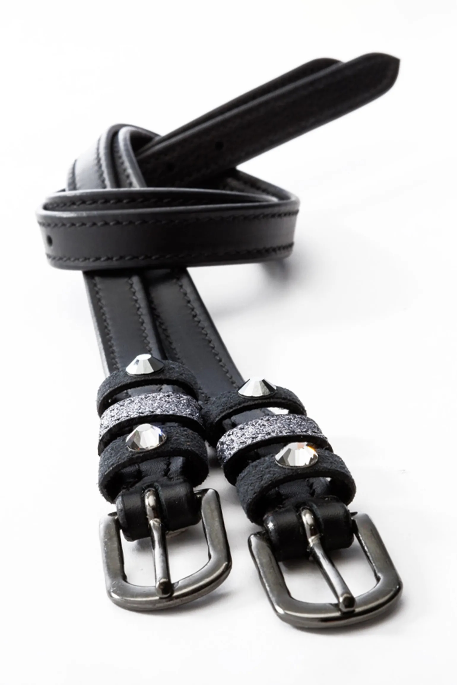 Sporenriemen „Grey“ aus weichem, strapazierfähigem Qualitätsleder mit grauen Strasssteinen, Schnallen und Glitzerstreifen auf den Lederschlaufen. Verkauft im Paar.