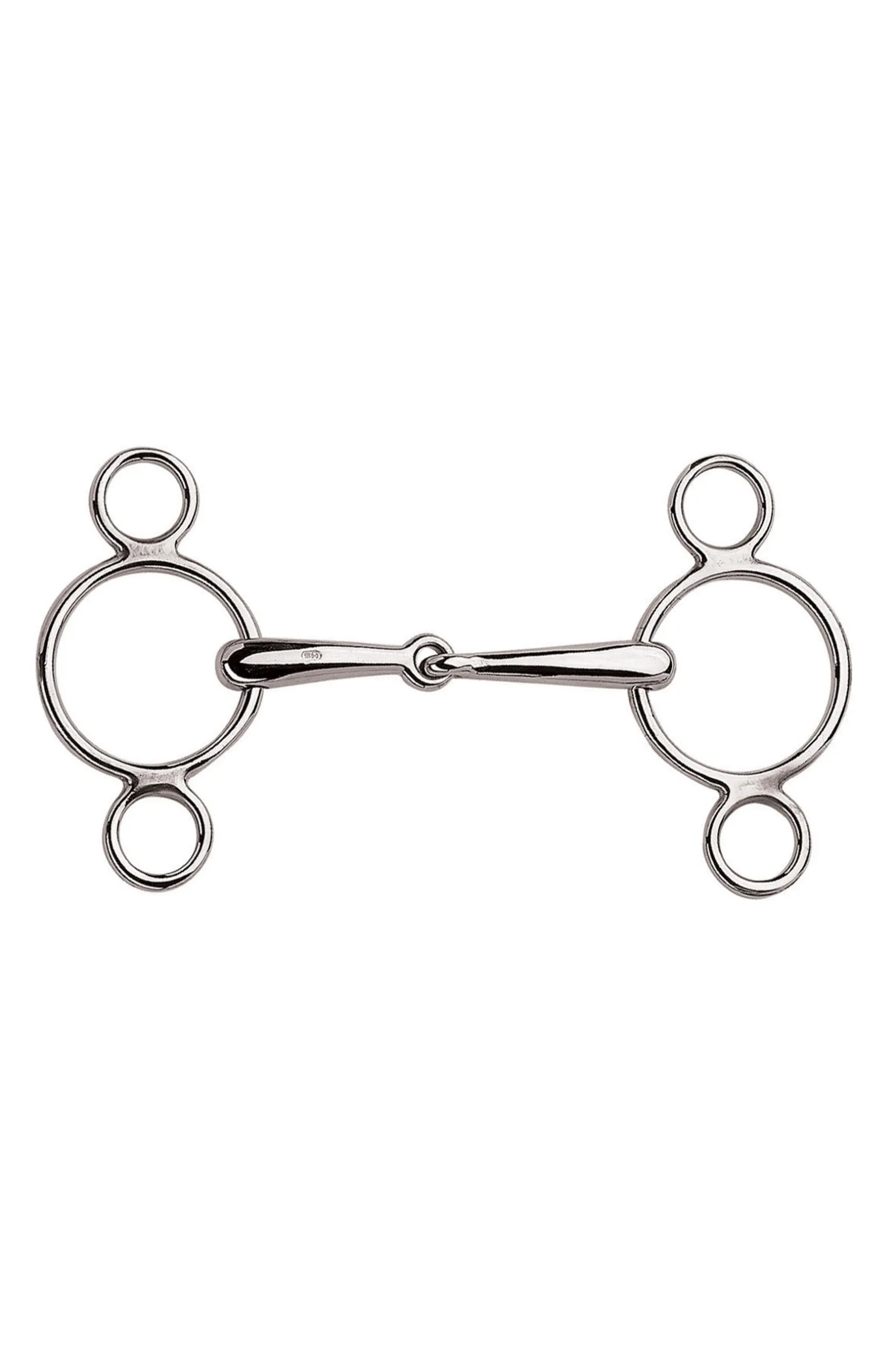 Dieses 3-Ring-Gebiss bietet 4 verschiedene Möglichkeiten die Zügel in das Gebiss zu schnallen. Es ist sehr vielseitig und daher bei Springreitern sehr beliebt, da sie mit diesem Gebiss mehr Kontrolle über das Pferd haben wenn es nötig ist. Je nachdem wie die Zügel in das Gebiss eingeschnallt sind, werden die Hilfen des Reiters intensiver auf das Pferd übertragen.
