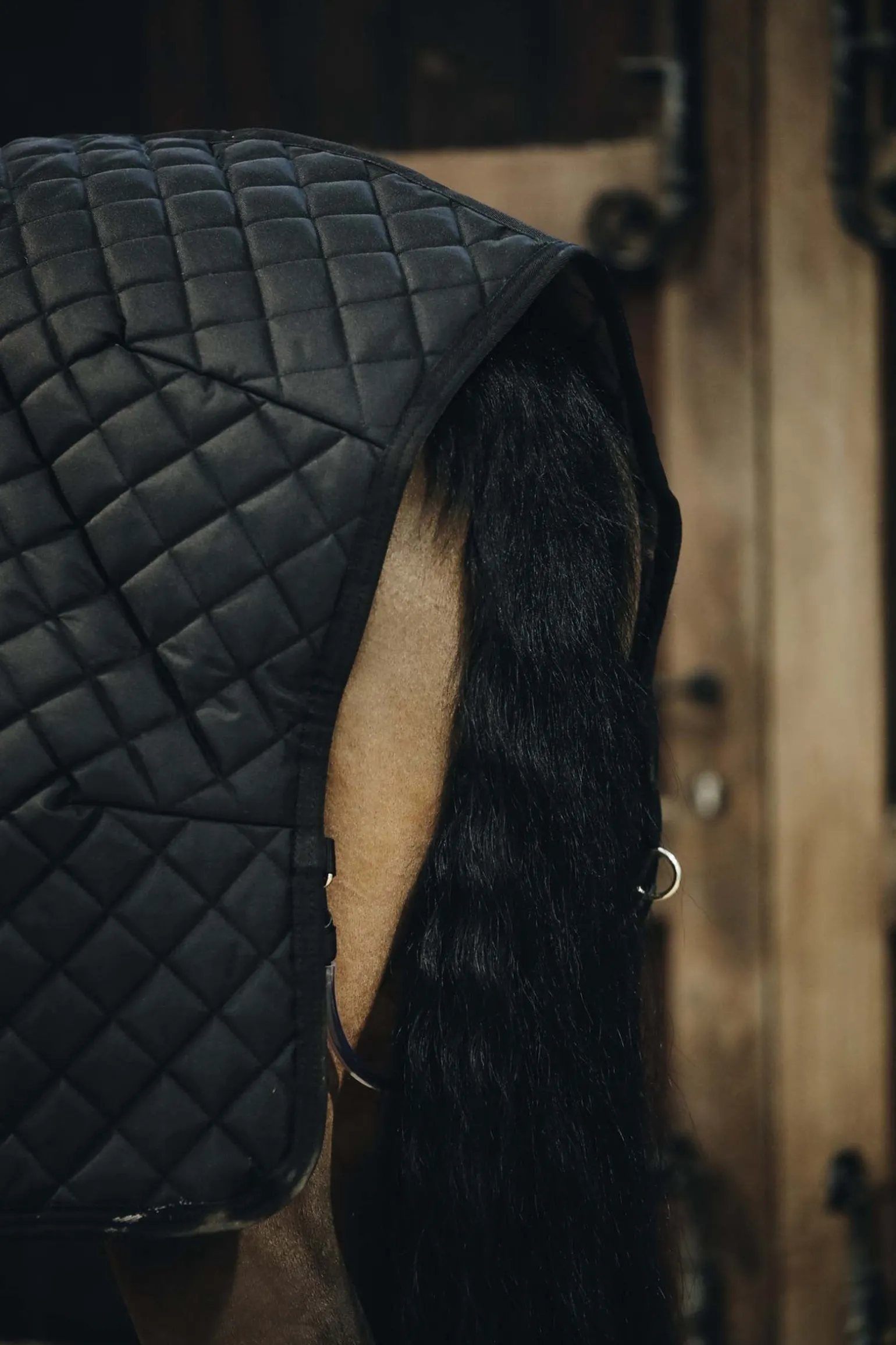 Die Stalldecke verfügt über einen doppelten Verschluss vorne und zwei Bauchgurte, die mit Kunstleder verstärkt sind. Die Bungee-Schweifkordel ist abnehmbar und hat eine Plastikabdeckung, die eine einfache Reinigung ermöglicht. Die Stallecke ist maschinenwaschbar bei 30° (kein Trockner).