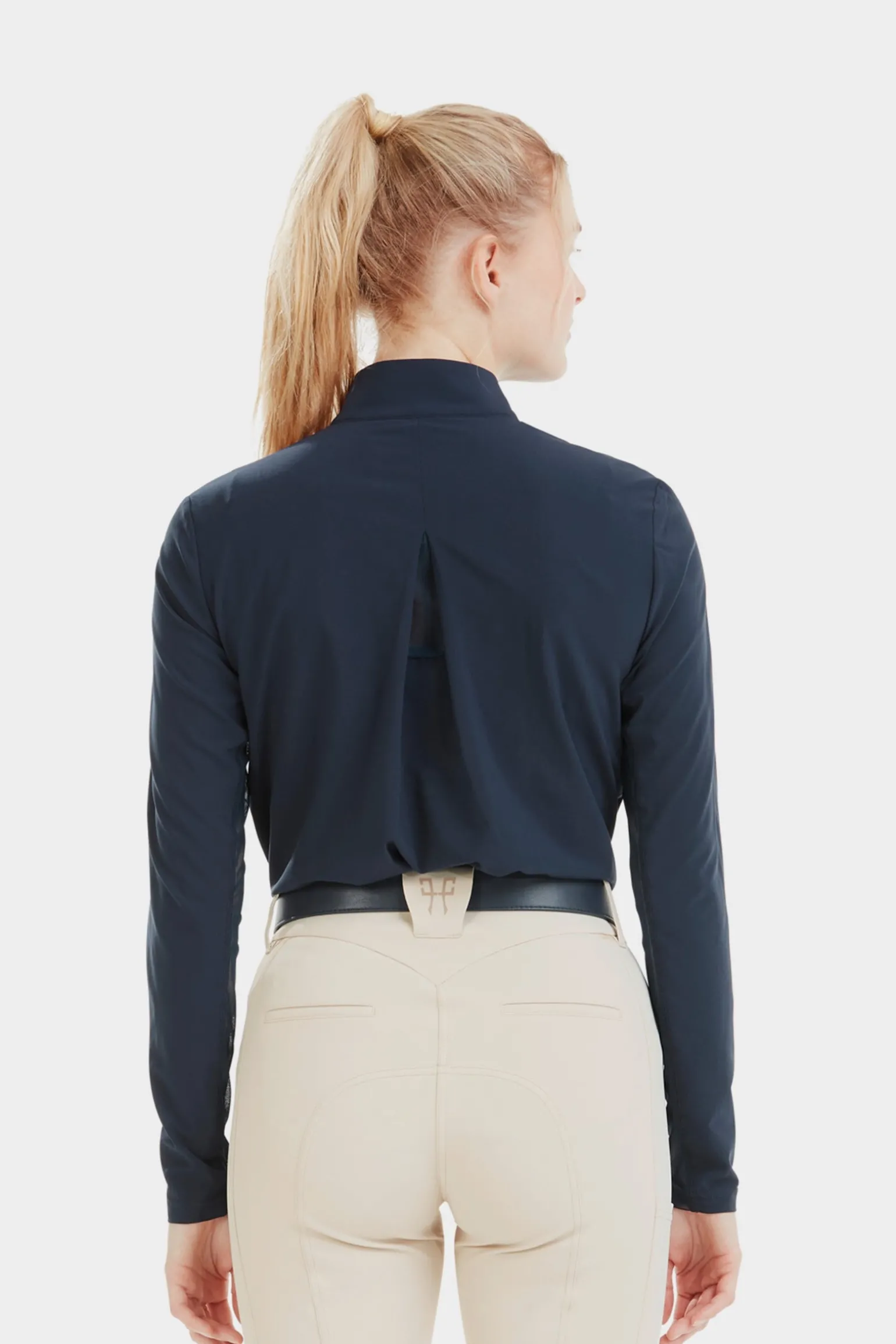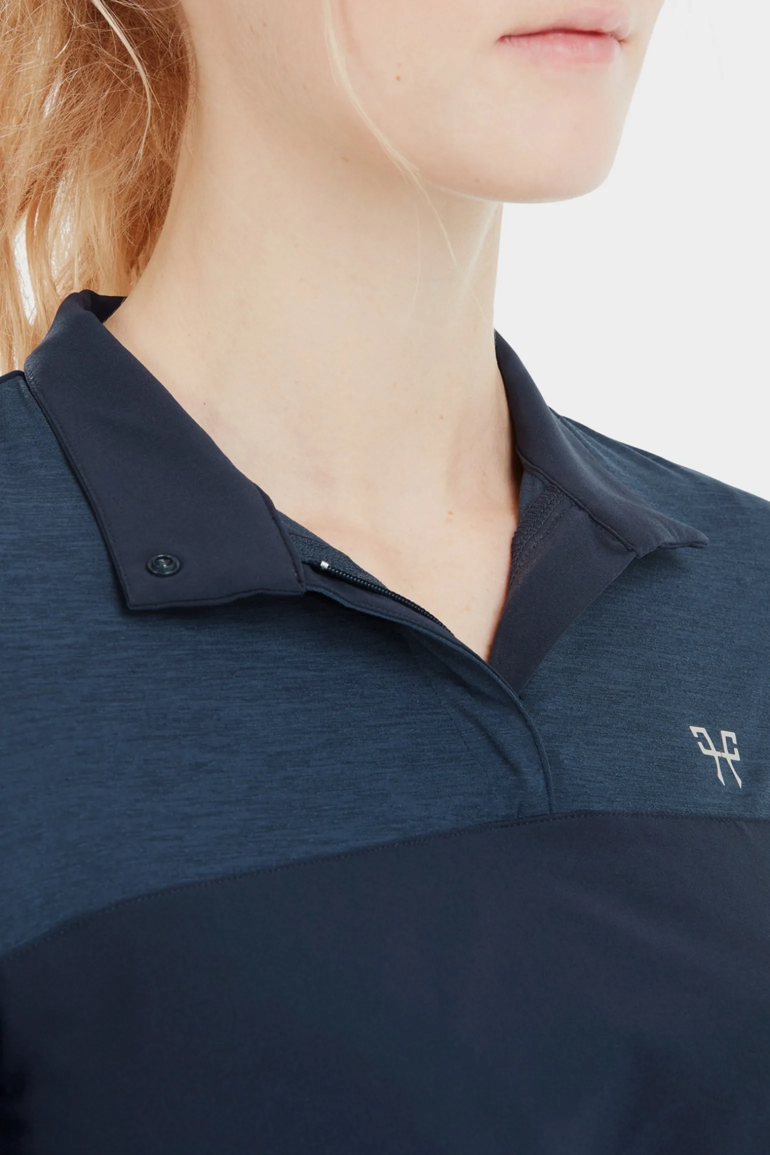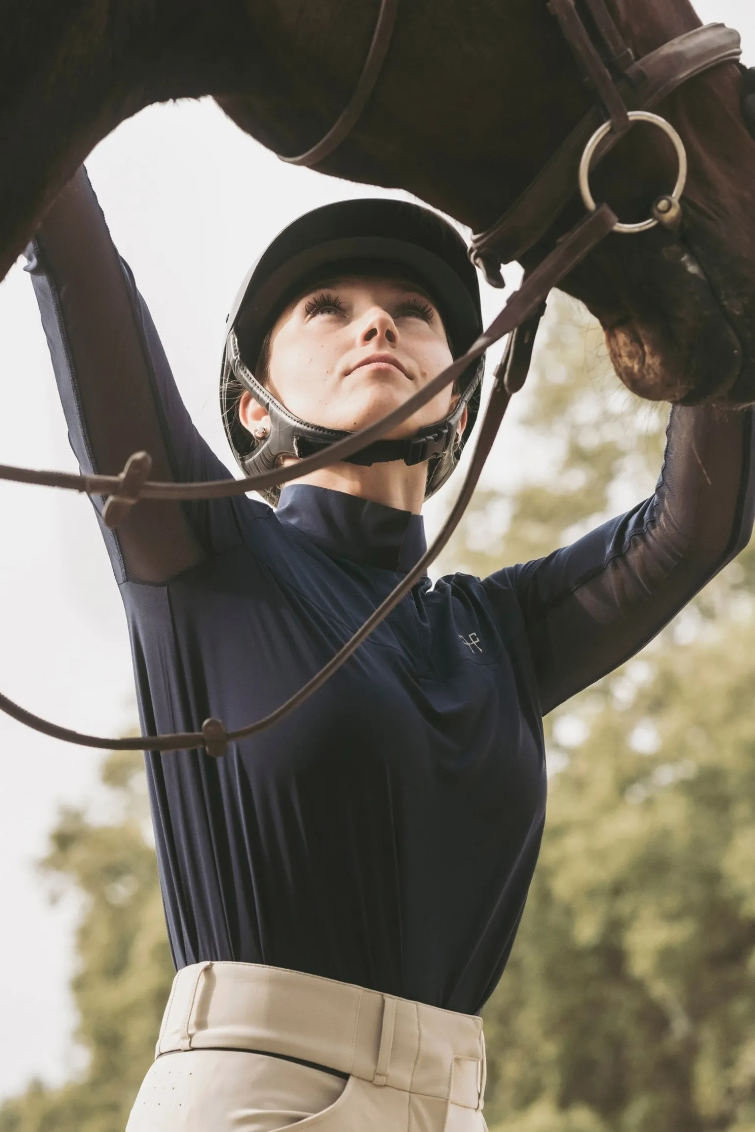 Für das Reiten entwickelt, hat dieses langärmlige Shirt einen lockeren Schnitt, einen stilvollen Hemdkragen sowie einen Reißverschluss- und Clipverschluss. Leicht und atmungsaktiv dank des Meshs unter den Armen und auf dem Rücken bietet es optimalen UV-Schutz.