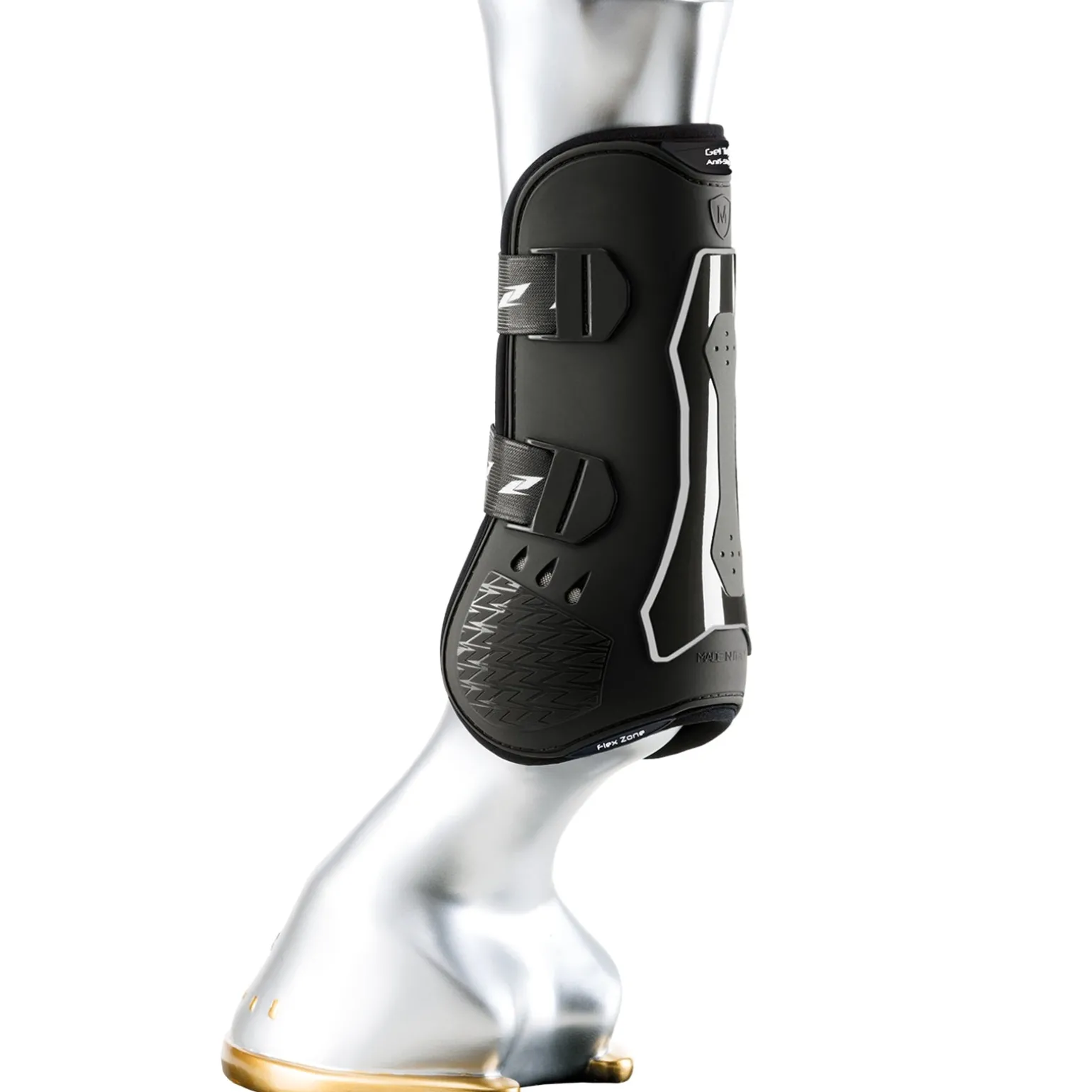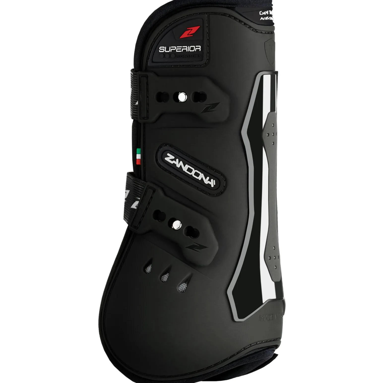 Die in Italien hergestellten Gamaschen „SUPERIOR Tendon“ wurden speziell entwickelt, um bei Springpferden Ergüsse und Prellungen im Fesselbereich der Vorhand und am Röhrbein zu vermeiden und die Sehnen zuverlässig zu schützen. Sie setzen sich zusammen aus äußeren TPU-Schichten mit unterschiedlichen Stärken und sind atmungsaktiv dank des perforierten Neoprengewebes. Zudem werden sie durch 6 Luftöffnungen, die über der Fessel angeordnet sind, belüftet. Gel-Tech befindet sich an den erforderlichen Bereichen zwischen dem TPU-Gewebe und der Neopren-Schutzschicht und wirkt hier als Stoßdämpfer und bequeme Polsterung. An der Innenseite, nahe am langen Fesselknochen, wurde eine Flex-Zone eingearbeitet, die notwendig ist, um der Gliedmaße eine maximale Bewegungsfreiheit zu garantieren. Die elastischen Bänder mit Schnellverschluss-Spitze wurden so justiert, dass ein sicherer Verschluss stets gewährleistet ist. Sie sind eigens zu diesem Zweck mit einem doppelten Verschlusssystem ausgestattet (horizontal und vertikal). Die Abmessungen und die perfekte ergonomische Form wurden entwickelt, indem man die tatsächliche Struktur der Gliedmaße kopierte – dies garantiert eine perfekte Anpassung und verhindert Beanspruchungen jeglicher Art..