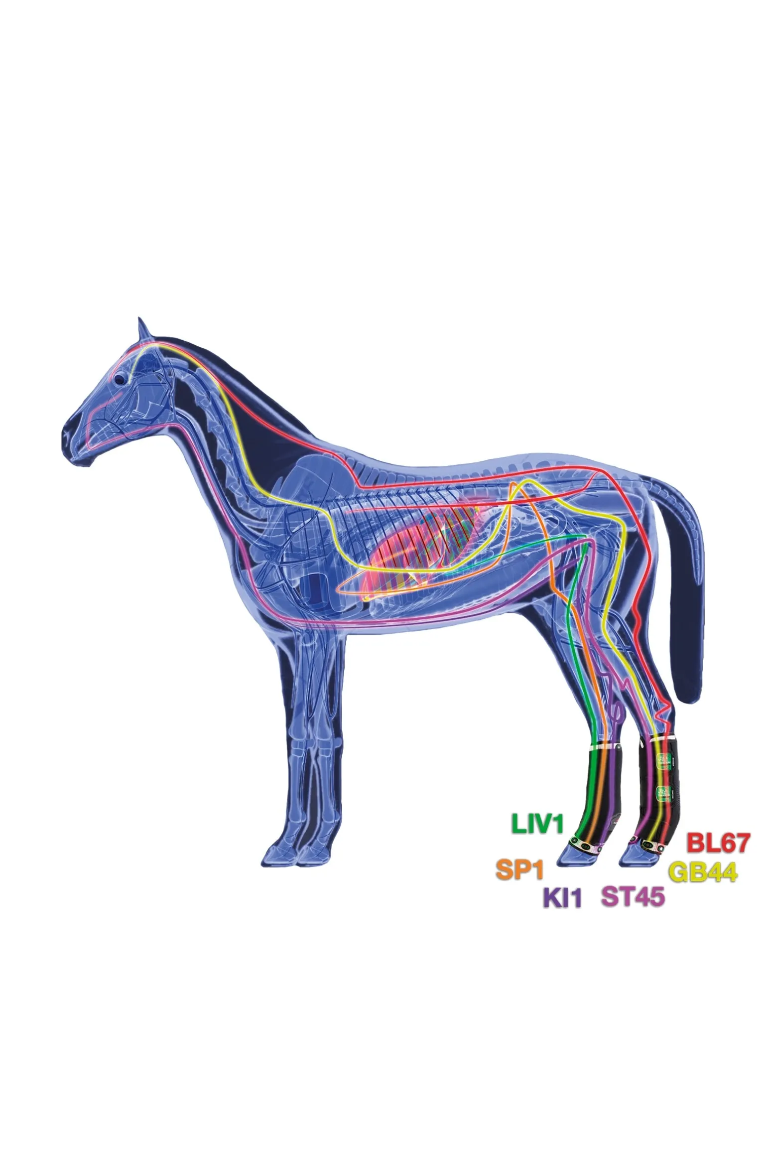 Der Magnet, der in der Nähe des Yang LIV Meridians platziert ist (Liver (Leber) – Ting LIV1), wirkt auf die Fessel, auf die oberflächlichen Hüftmuskeln und auf die Kruppe und Hüfte Muskulatur.
