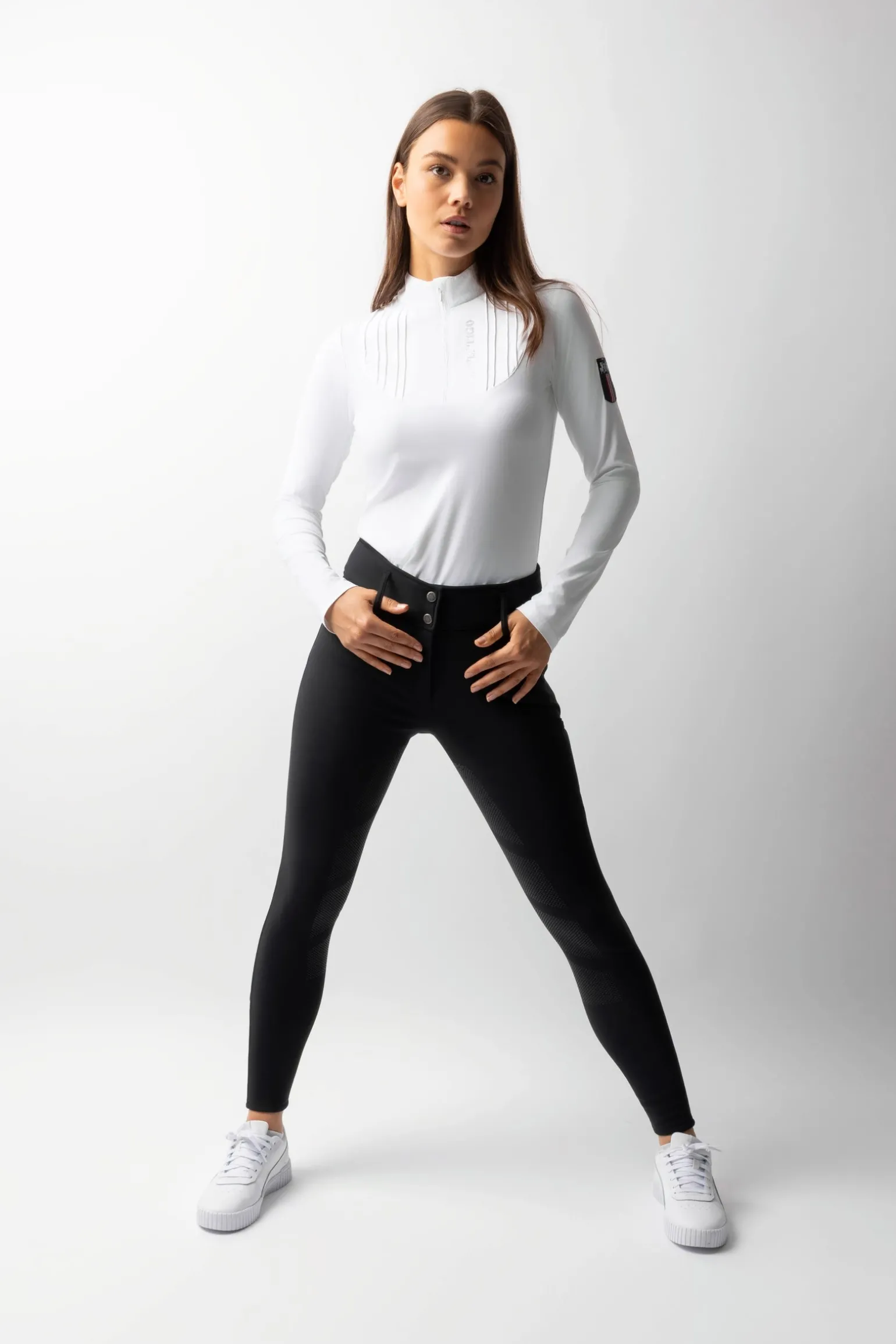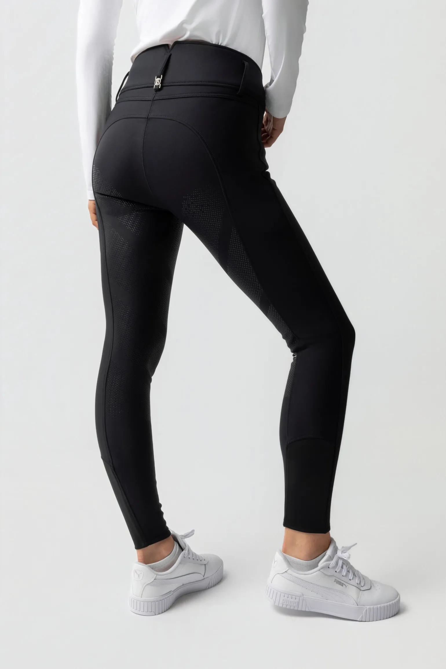 The B Vertigo Tiffany II Thermo Breeches are designed to keep you warm and dry in winter riding. Made from waterproof, windproof fabric, they feature taped seams and a soft brushed fleece lining for insulation. A silicone full seat ensures secure grip in the saddle, while belt loops and a flattering cut add functionality. With a thigh phone pocket, these breeches combine comfort and practicality.