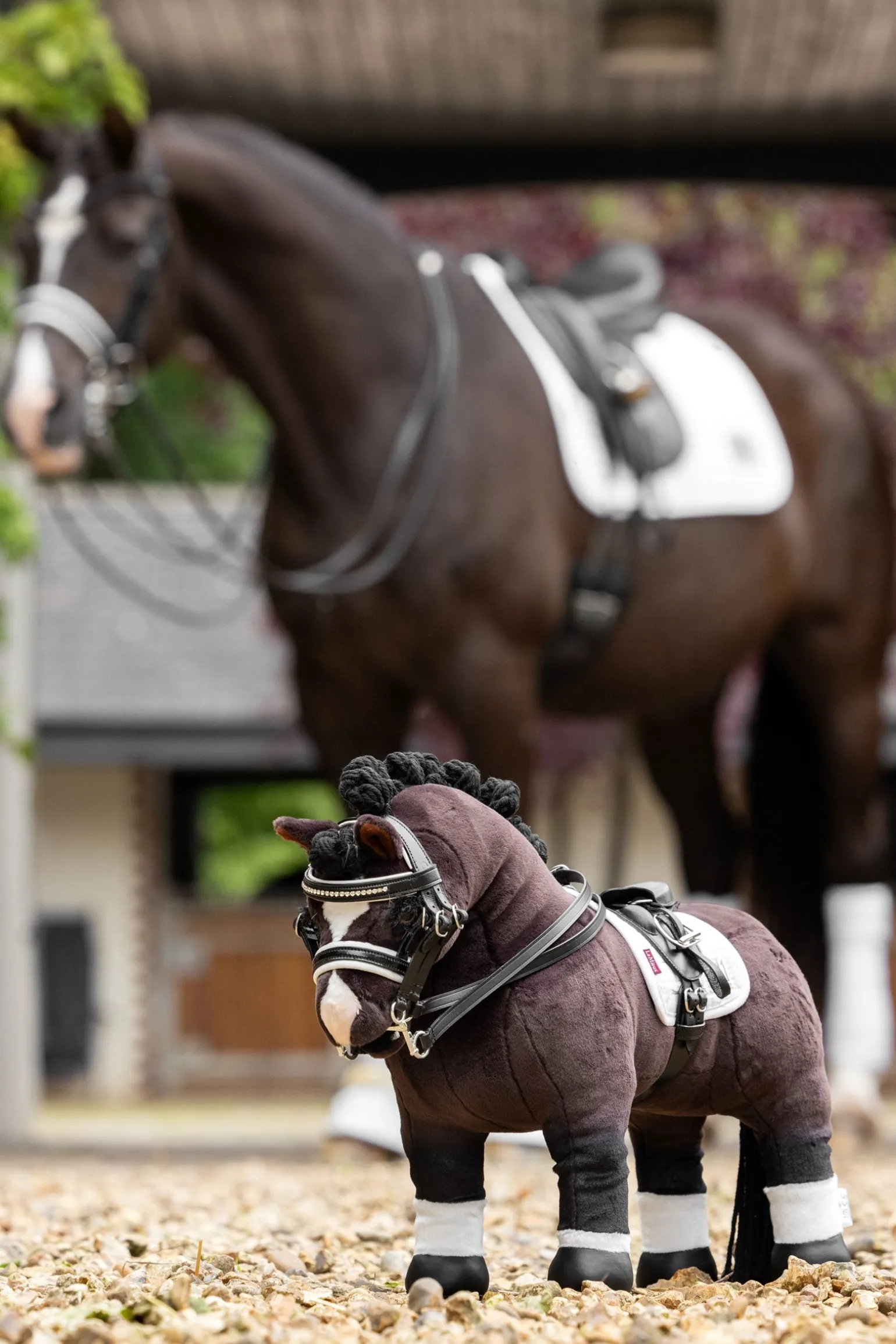 Dieses unglaublich detailgetreue Mini-Kandarenzaumzeug aus Leder ist ideal für kleine Dressurreiter*innen, um das Aufzäumen ihres LeMieux Toy Pony zu üben. Es wurde von denselben Lederprofis gefertigt wie die echten Performance-Trensen. Mit funktionierenden Schnallen kannst du die Kandare individuell anpassen. Natürlich gehört ein glitzerndes Stirnband dazu und ein schwarzer Lacknasenriemen mit weichem weißen Lederpolster. Alle echten Details sind enthalten – sogar die zwei Gebisse: eine Kandare, eine Unterlegtrense und zwei Zügel.