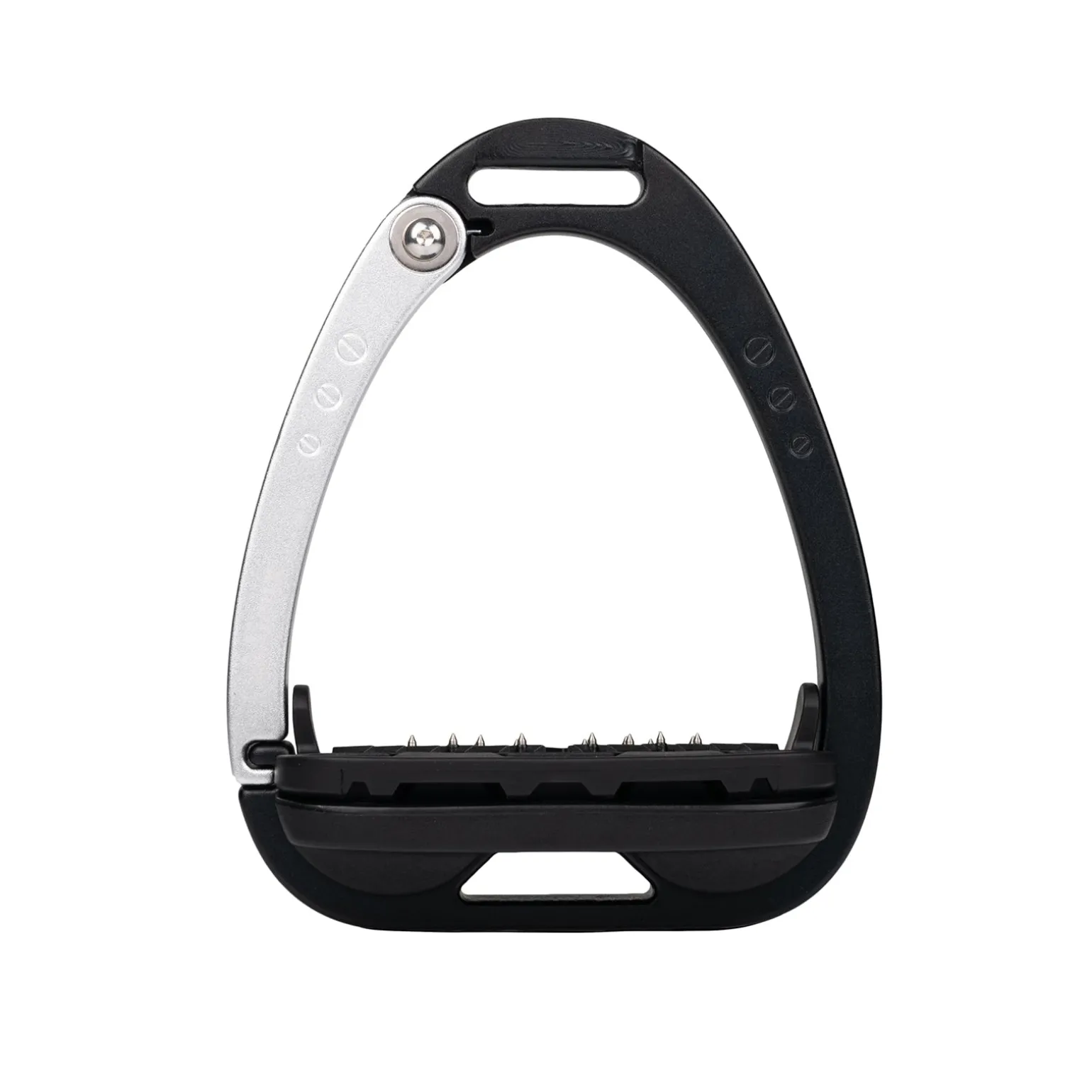 Die Trittfläche wird durch ein Twin-Balance-Bogensystem gestützt, das das Gewicht gleichmäßig auf die Basis des Steigbügelrahmens verteilt. Der Scheitelpunkt des Rahmens ist vertieft und versetzt, was eine 45º-Ausrichtung nach außen fördert und es dem Reiter erleichtert, den optimalen Winkel für den Fuß zu finden und einen verlorenen Steigbügel wiederzufinden.