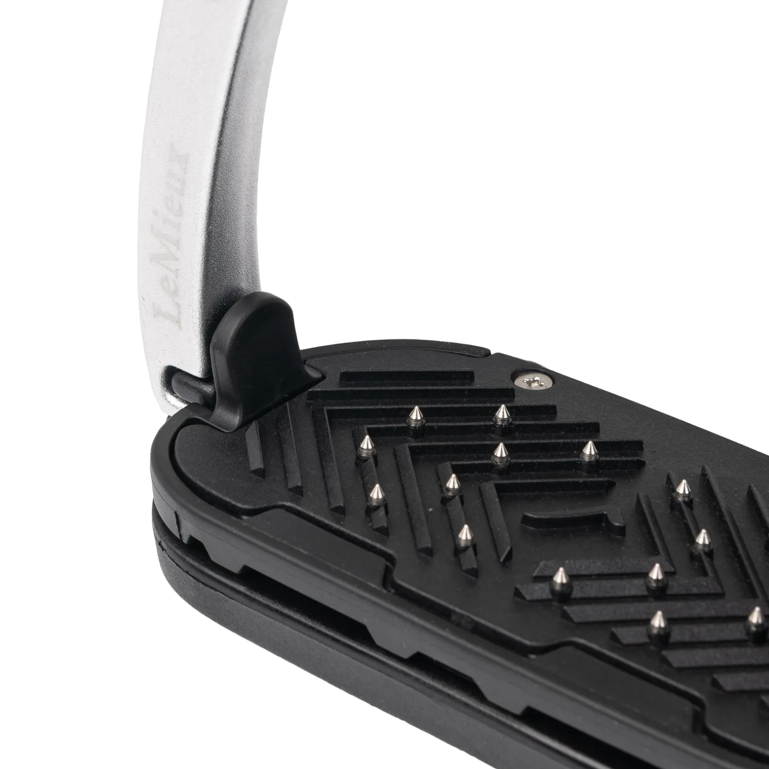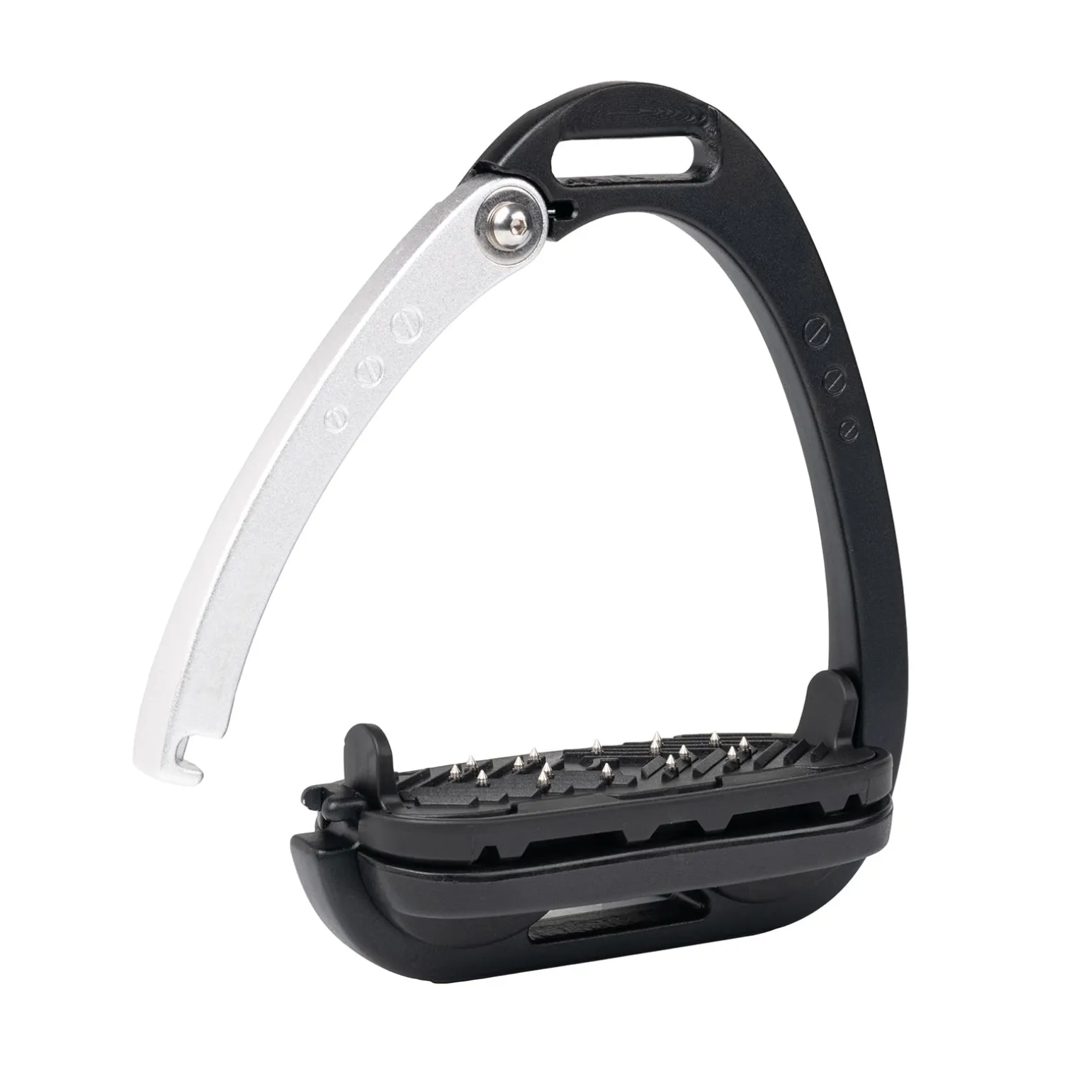 Ein integrierter Sicherheitsarm verfügt über ein zweistufiges Auslösesystem, das ein ungewolltes Öffnen verhindert. Der federbelastete Sicherheitsarm rastet in der Basis des Hauptrahmens ein, so dass bei hoher Belastung beispielsweise nach einem Sprung das Gewicht des Reiters gleichmäßig auf den Steigbügel verteilt wird. Wenn Druck auf den Steigbügelarm ausgeübt wird, z. B. bei einem Sturz, löst sich der Arm, so dass sich der Fuß nicht im Steigbügel verfangen kann. Die Auslösekraft des Steigbügelarms beträgt im Test 36N (entspricht 3,62kg), d.h. genug Widerstand, um ein versehentliches Öffnen zu verhindern, aber ein sicheres Auslösen im Falle eines Sturzes des Reiters zu gewährleisten.