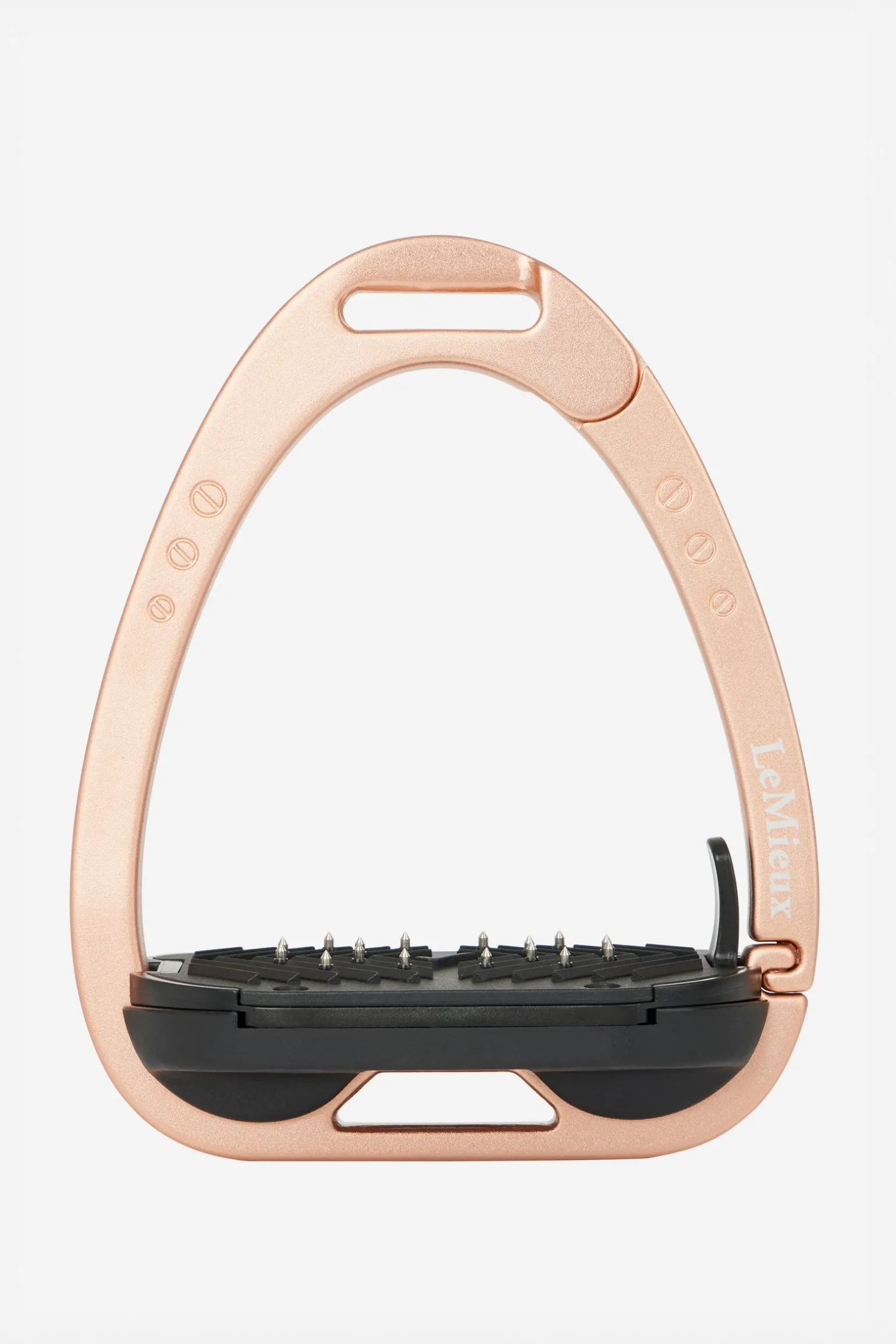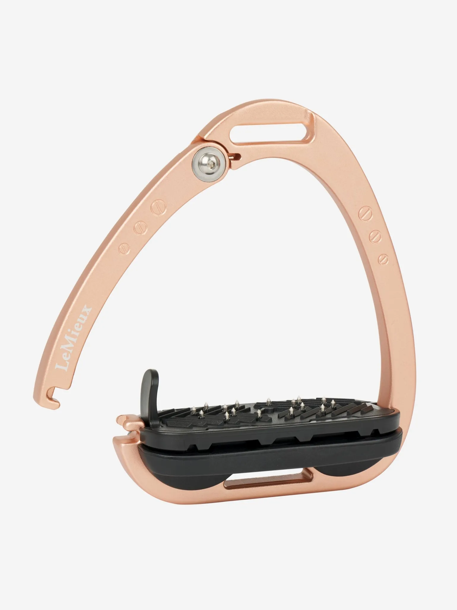 Die Trittfläche wird durch ein Twin-Balance-Bogensystem gestützt, das das Gewicht gleichmäßig auf die Basis des Steigbügelrahmens verteilt. Der Scheitelpunkt des Rahmens ist vertieft und versetzt, was eine 45º-Ausrichtung nach außen fördert und es dem Reiter erleichtert, den optimalen Winkel für den Fuß zu finden und einen verlorenen Steigbügel wiederzufinden.