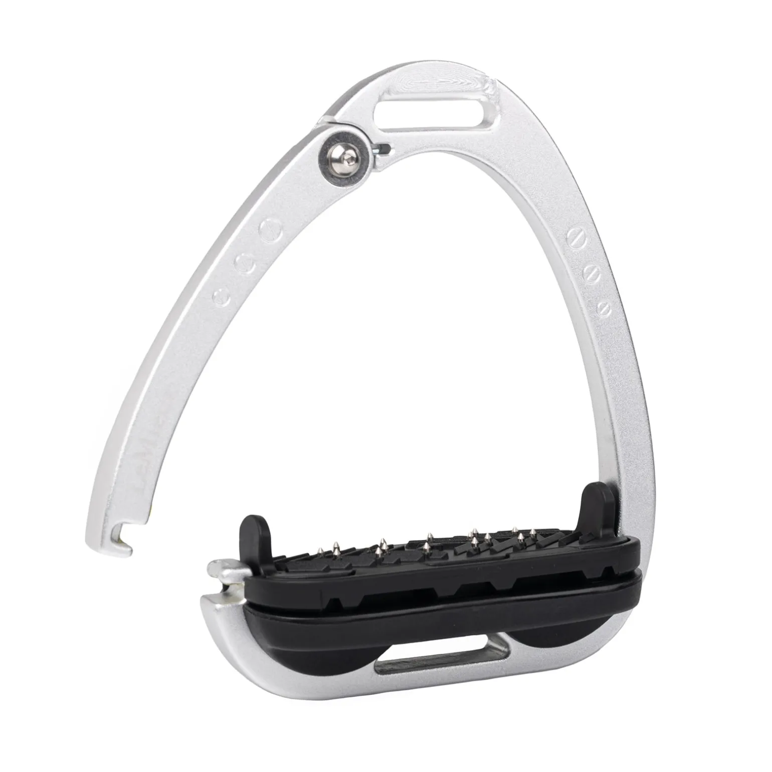 Die Trittfläche wird durch ein Twin-Balance-Bogensystem gestützt, das das Gewicht gleichmäßig auf die Basis des Steigbügelrahmens verteilt. Der Scheitelpunkt des Rahmens ist vertieft und versetzt, was eine 45º-Ausrichtung nach außen fördert und es dem Reiter erleichtert, den optimalen Winkel für den Fuß zu finden und einen verlorenen Steigbügel wiederzufinden.