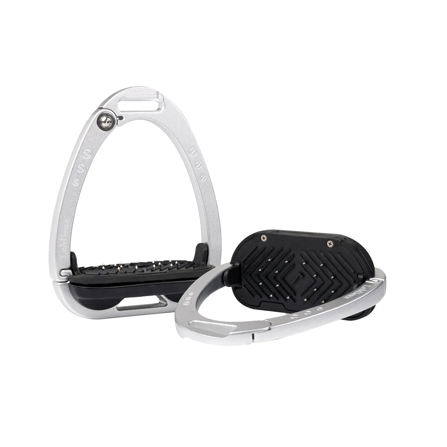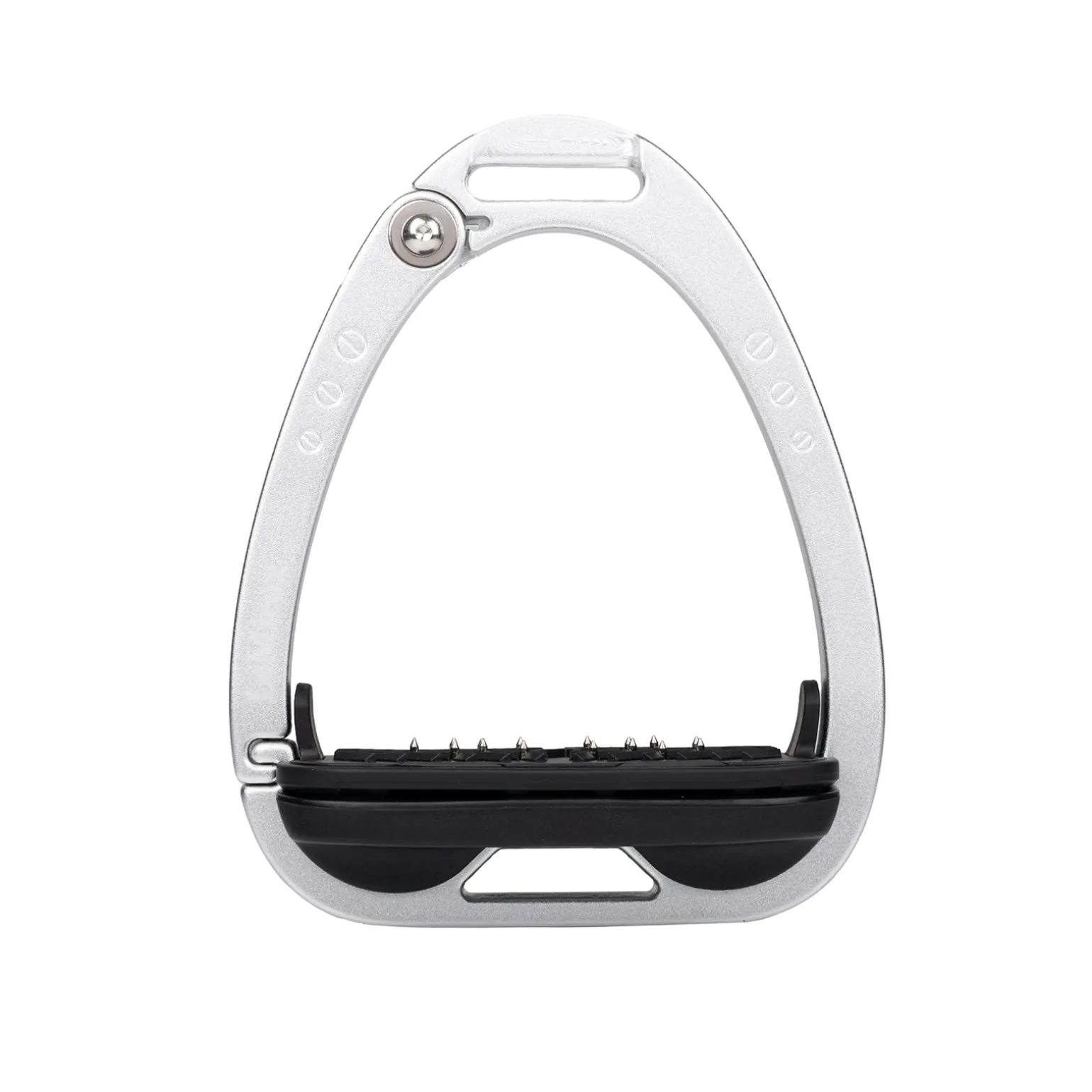 Die Trittfläche wird durch ein Twin-Balance-Bogensystem gestützt, das das Gewicht gleichmäßig auf die Basis des Steigbügelrahmens verteilt. Der Scheitelpunkt des Rahmens ist vertieft und versetzt, was eine 45º-Ausrichtung nach außen begünstigt, was es dem Reiter erleichtert, den optimalen Winkel für den Fuß zu finden und einen verlorenen Steigbügel wiederzufinden.