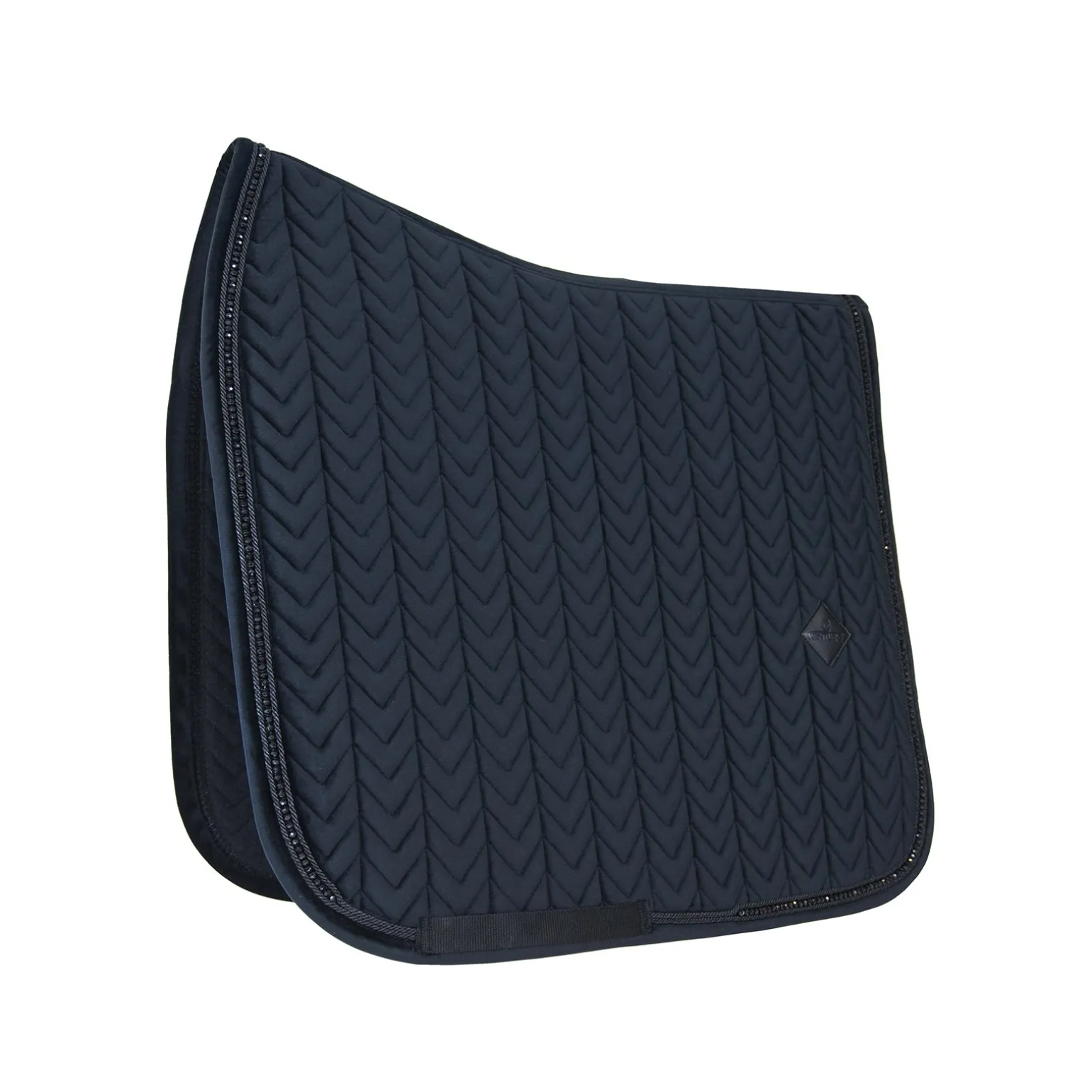 Die Velvet Pearls Schabracke besteht aus feinstem weichen Samt mit Stepp in Fischgrät-Muster. Die Paspelierung wird durch schicke Perlen abgerundet. Das schweißabsorbierende atmungsaktive Futter besteht aus einem Baumwoll-Polyester Mix. Dieses Schabrackenmodell verzichtet auf Riemen die am Sattel befestigt werden müssen, stattdessen sorgt ein strukturiertes Waffelmuster an der Unterseite dafür, dass die Schabracke an Ort und Stelle gehalten wird. Damit die Perlen nicht durch den Gurt beschädigt werrden können wurde der Gurtbereich ausgespart.