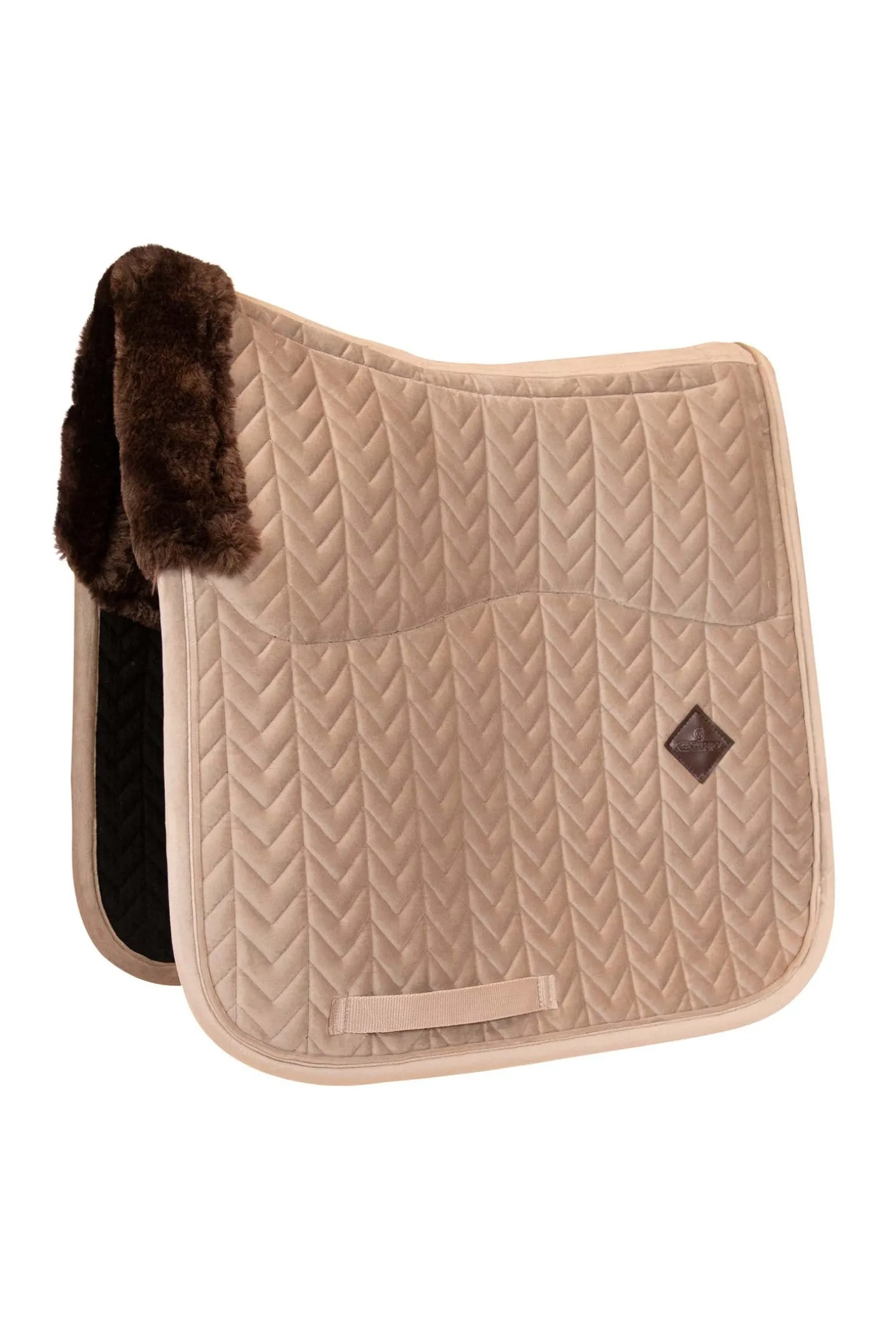 Der Widerrist und die Innenseite der Schabracke sind mit veganem Schaffell gefüttert. Dies bietet eine hervorragende Polsterung und vermeidet Reibung an den empfindlichen Stellen auf dem Pferderücken, wie zum Beispiel dem Widerrist. Für Pferde mit empfindlicher Haut ist dies besonders angenehm. Die Außenseite der Schabracke ist aus weichem Samtstoff gefertigt. Die Schabracke ist mit einer stilvollen Fischgrätensteppung versteppt.