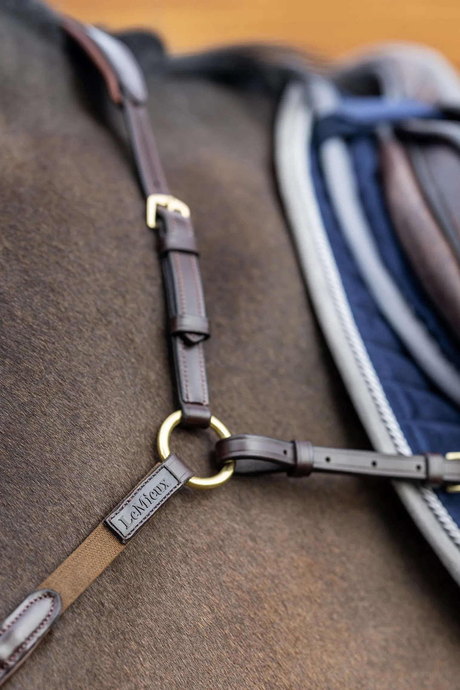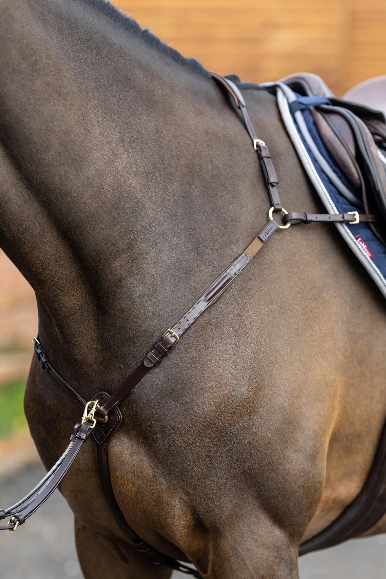 Das LeMieux Vorderzeug mit Martingalbefestigung ist die ideale Lösung für deine Sattelkammer mit einem schicken Aussehen und praktischer Funktionalität. Ein verstellbares Element sitzt mit einem weichen Lederpolster am Widerrist und wird an den elastischen Halsschlaufen befestigt. Die Polsterung hinter dem Verbindungsstück auf der Brust trägt zum Komfort für das Pferd bei und verfügt über eine abnehmbare Martingalgabel mit praktischen Clips, langlebigen Metallbefestigungen und einfach zu bedienenden Schnallenverschlüssen. Die speziell entworfenen Martingalringe lassen sich ganz einfach an den Zügeln befestigen und wieder abnehmen, ohne dass du diese öffnen musst. Das Leder von LeMieux ist aus wunderschönem, weichem europäischem Leder gefertigt und wurde so konzipiert, dass es den Druck besser verteilt und den Komfort maximiert.