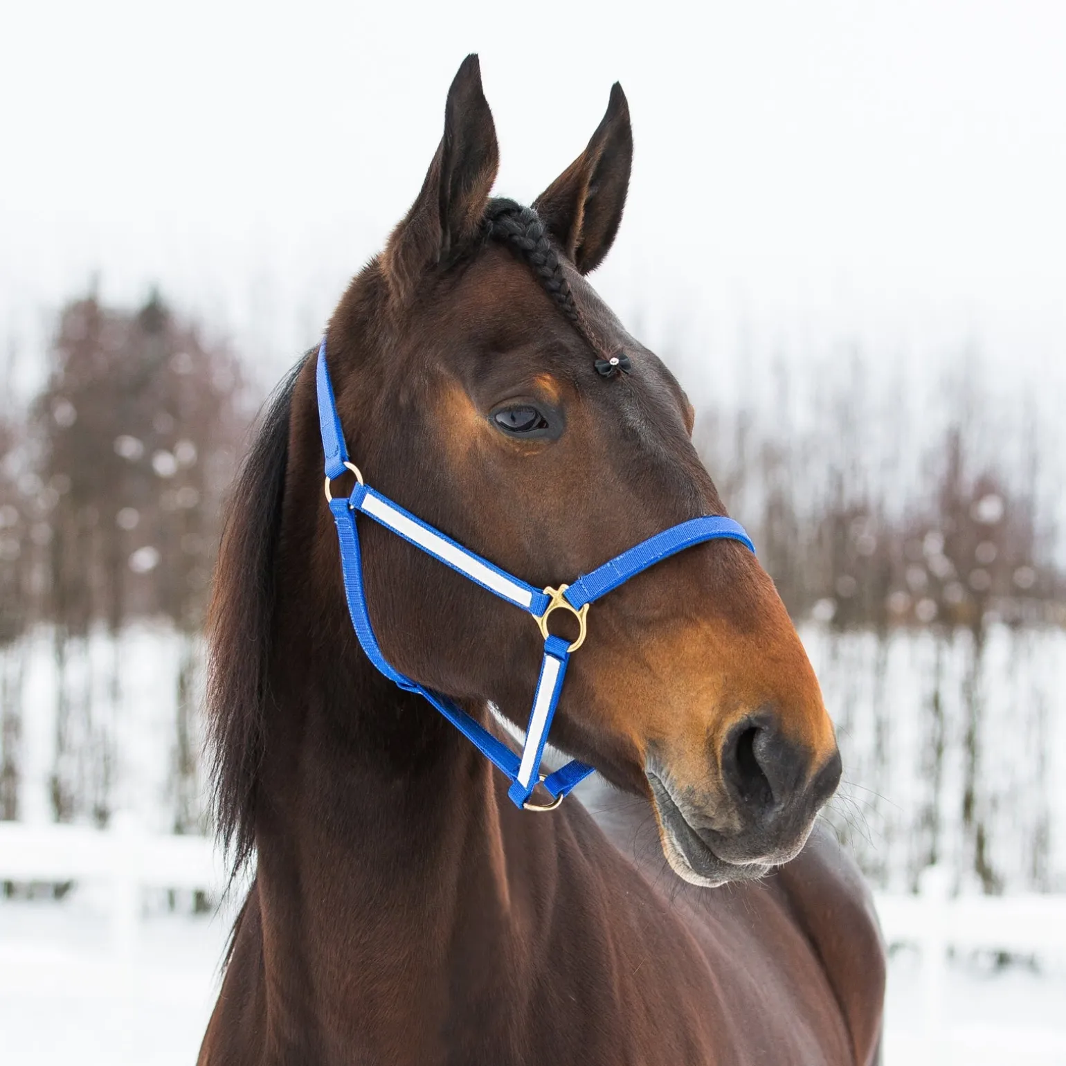 Finn-Tack Nylon Yankee Halfter, aus weich gepolstertem, 20mm starken Nylon gefertigt. Solide Messing-Beschläge und synthetisches Leder-Polster am Genick.