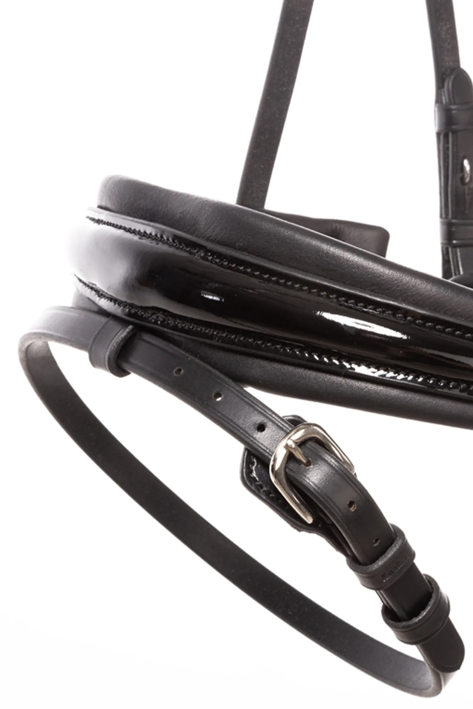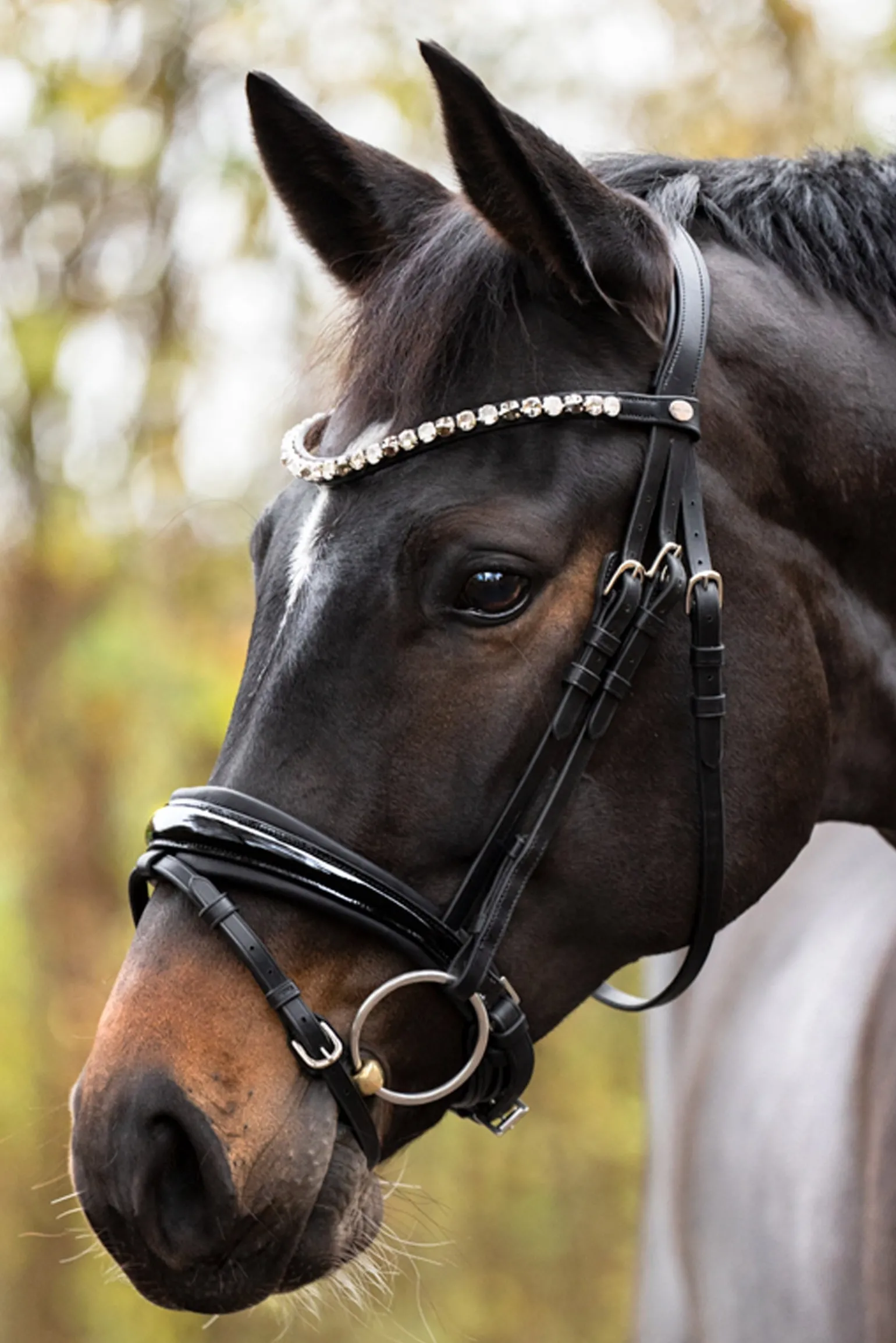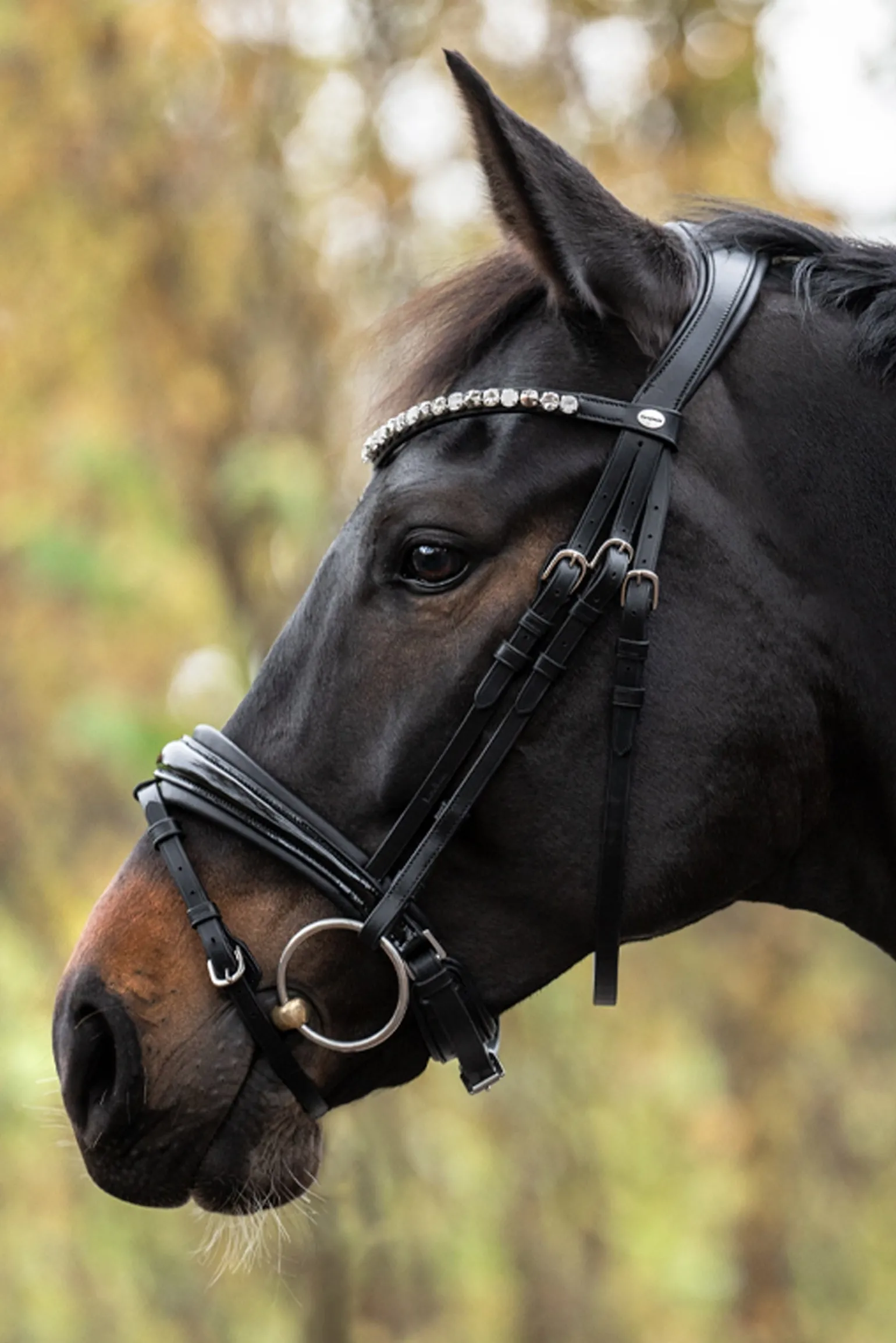 Die Dressurtrense „Zora“ besteht aus hochwertigem deutschen Qualitätsleder sowie einem besonders weichen Genickstück, welches stark anatomisch geformt ist mit Einschnitt. Die weiche Polsterung vom Nasenriemen und Stirnband bieten ebenfalls einen besonderen Komfort für das Pferd. Das Reithalfter ist beidseitig verstellbar. Der Trensenzaum wird ohne Zügel geliefert.
