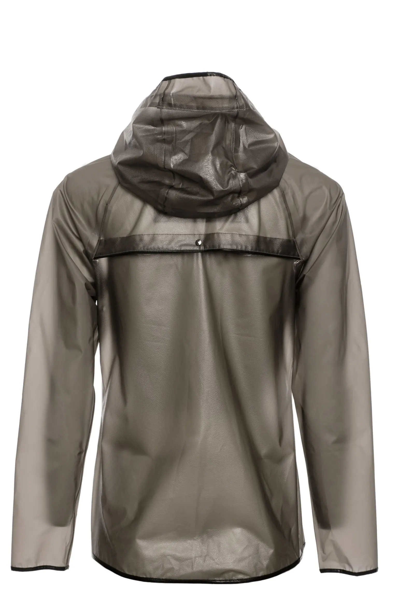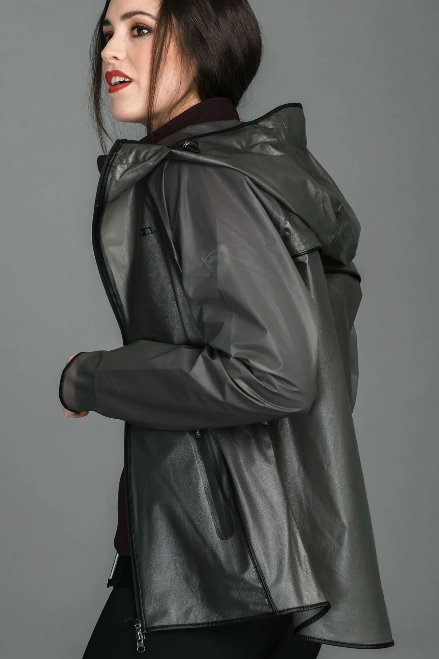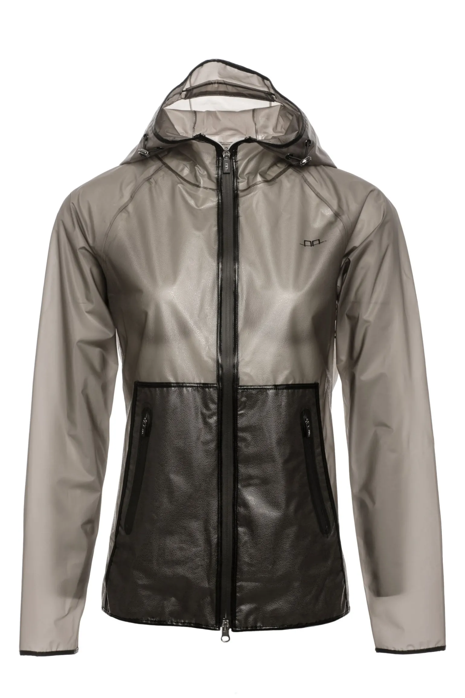 Diese coole, durchsichtige, wasserdichte Jacke ist atmungsaktiv, hat eine aufrollbare Kapuze und elegante Verzierungen aus veganem Leder.