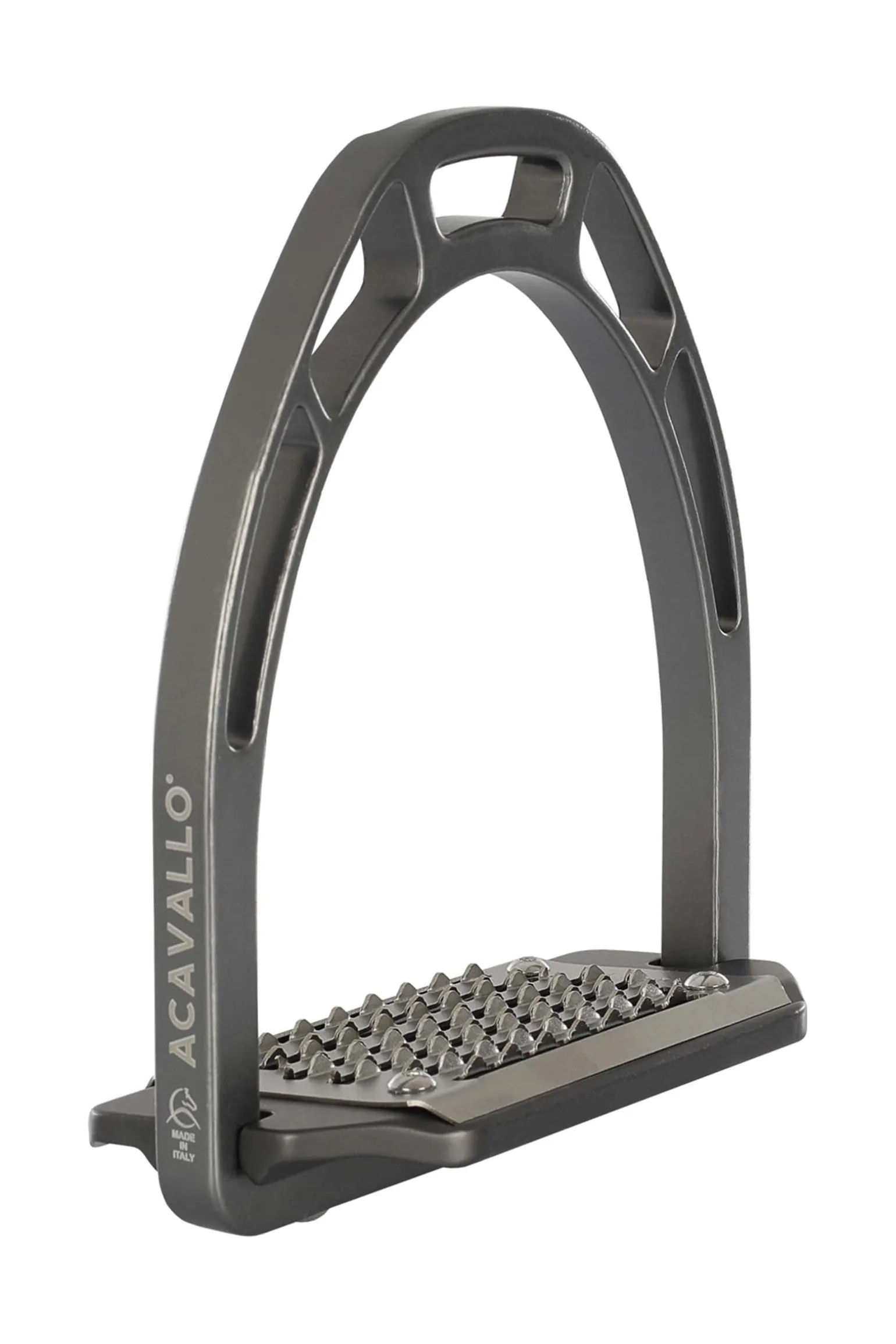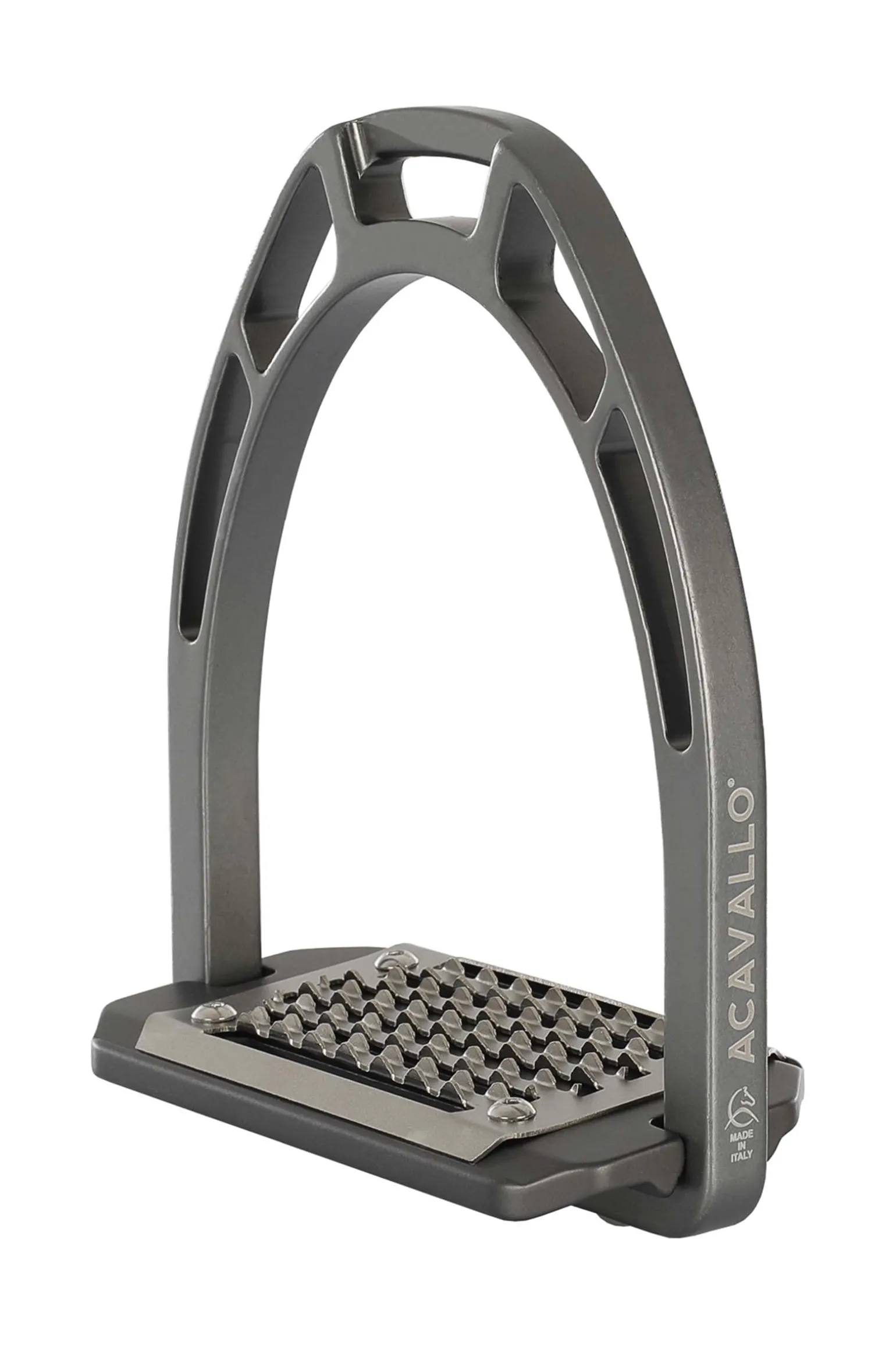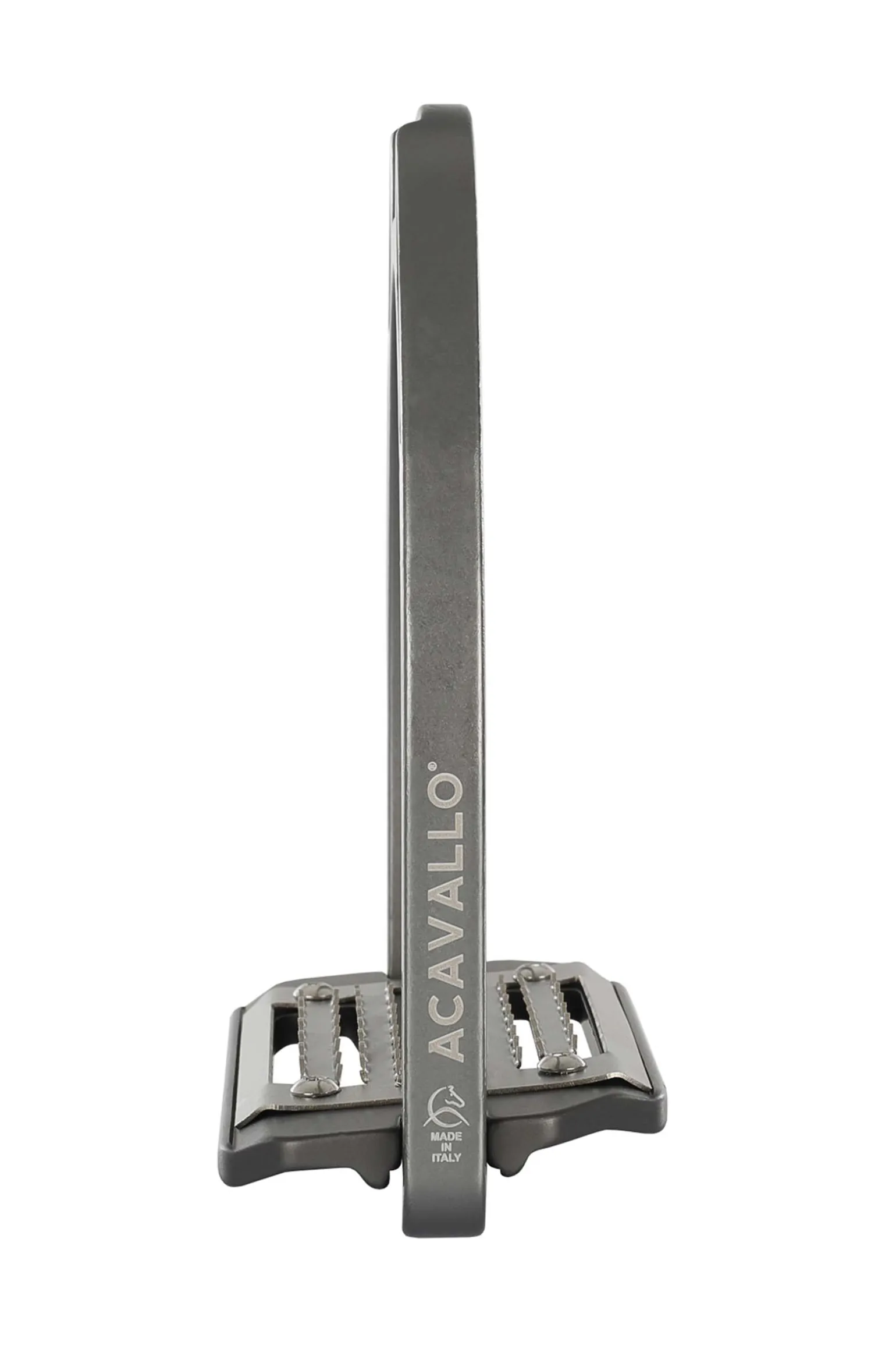 Die Trittfläche ist aus rostfreiem Stahl und hat lange horizontale Löcher. Die 5° Neigung hilft den Reitern, die richtige Haltung einzunehmen und entlastet Knöchel, Waden, Knie und Hüfte.