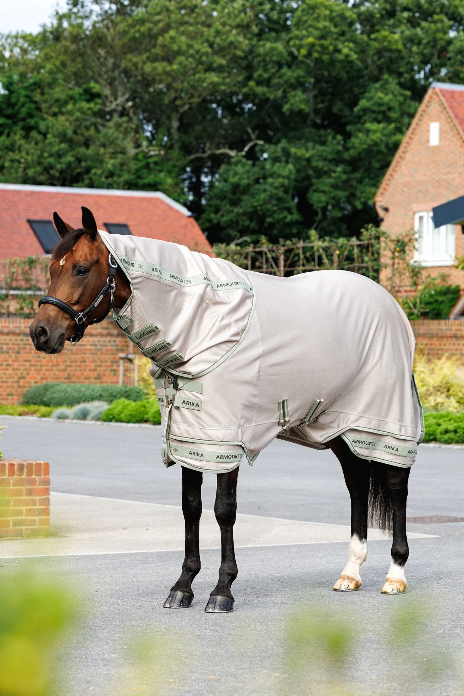 Schütze dein Pferd vor Fliegen und reguliere gleichzeitig seine Temperatur bei warmem Wetter mit der atmungsaktiven, leichten und hochschützenden Arika Armour-Tek Fliegendecke.