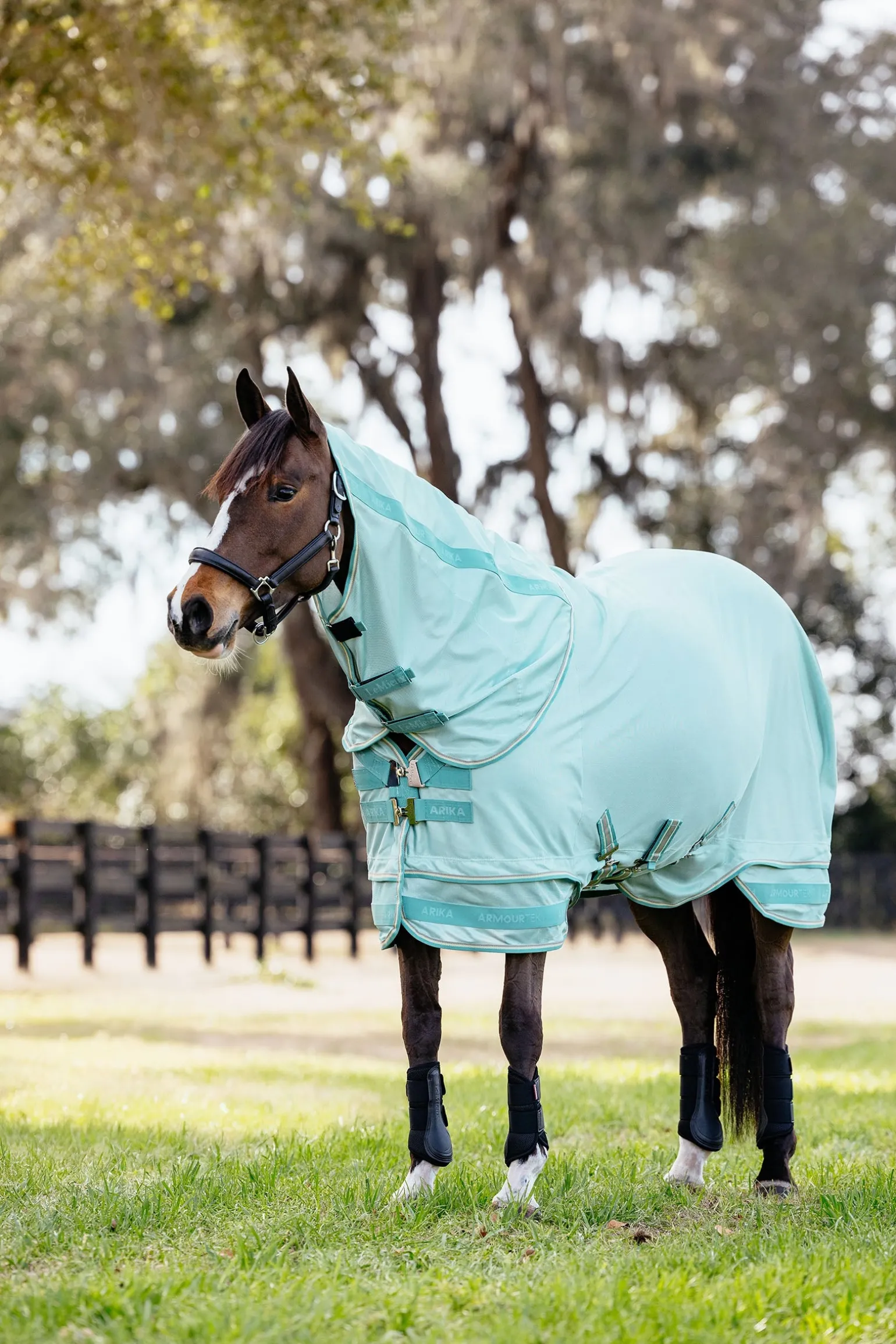 Schütze dein Pferd vor Fliegen und reguliere gleichzeitig seine Temperatur bei warmem Wetter mit der atmungsaktiven, leichten und hochschützenden Arika Armour-Tek Fliegendecke.