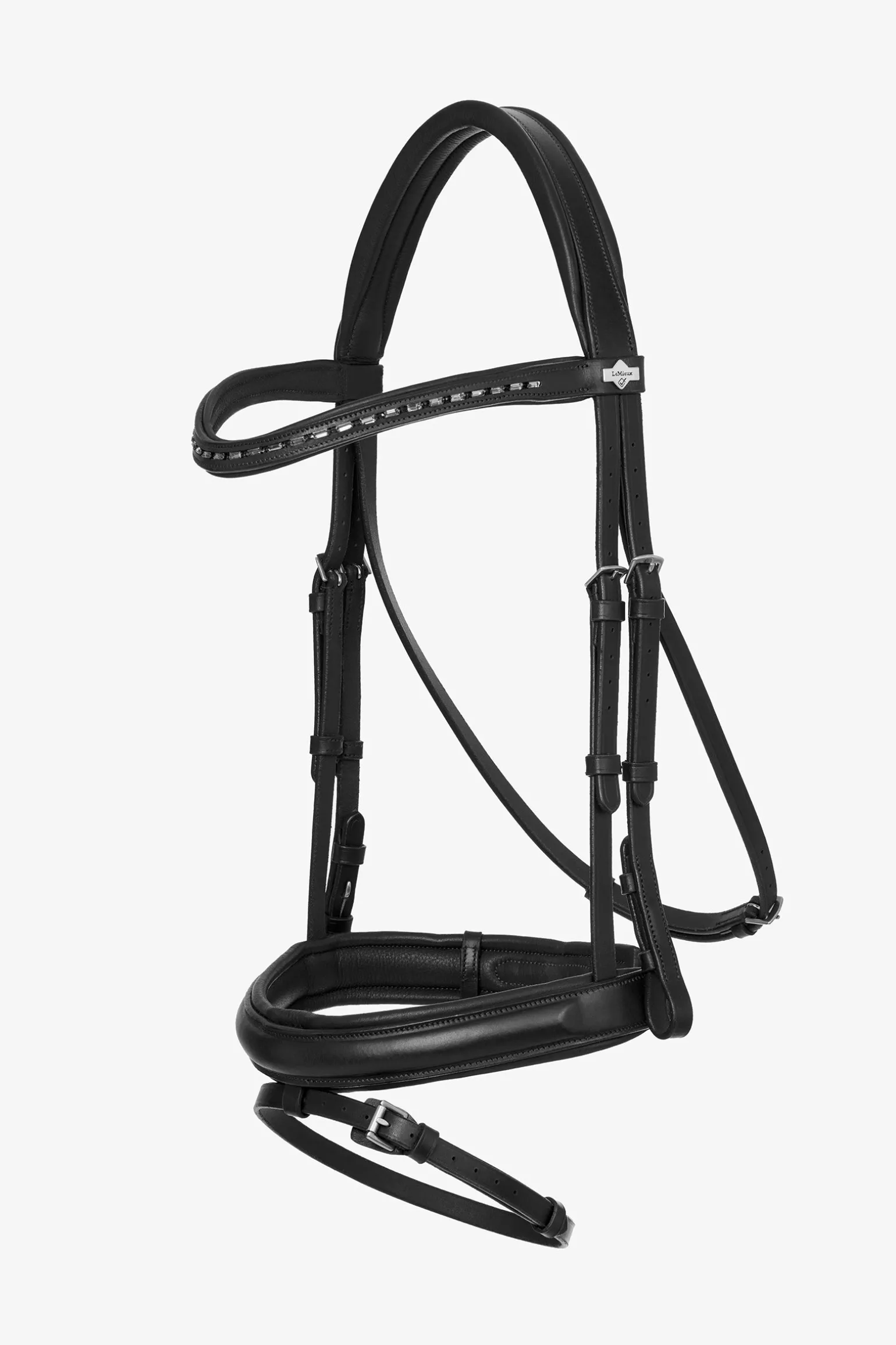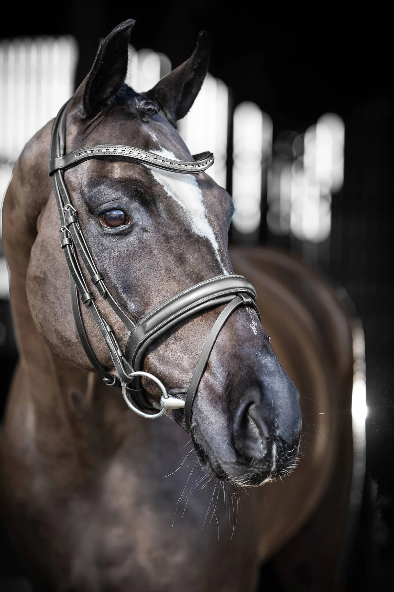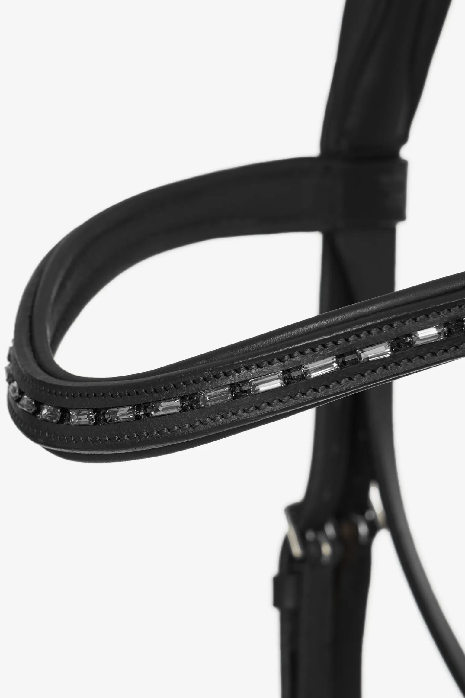 Die Arika Dressurtrense bietet die perfekte Balance zwischen Stil und Funktion. Der anatomisch geformte Stirnriemen ist mit schwarzen Diamantkristallen besetzt, die dein Dressur-Outfit perfekt ergänzen.