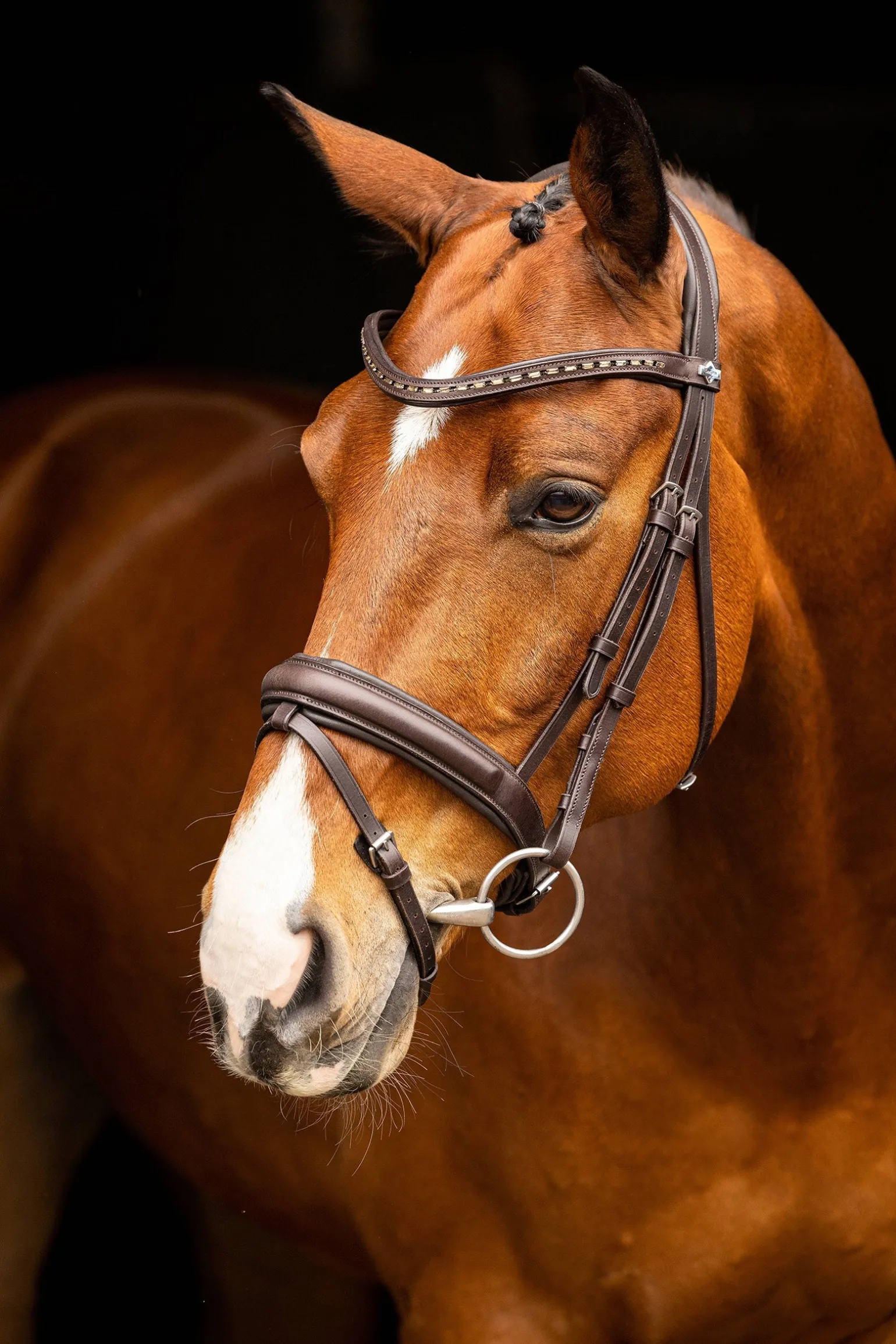 Die Arika Dressurtrense bietet die perfekte Balance zwischen Stil und Funktion. Der anatomisch geformte Stirnriemen ist mit schwarzen Diamantkristallen besetzt, die dein Dressur-Outfit perfekt ergänzen.