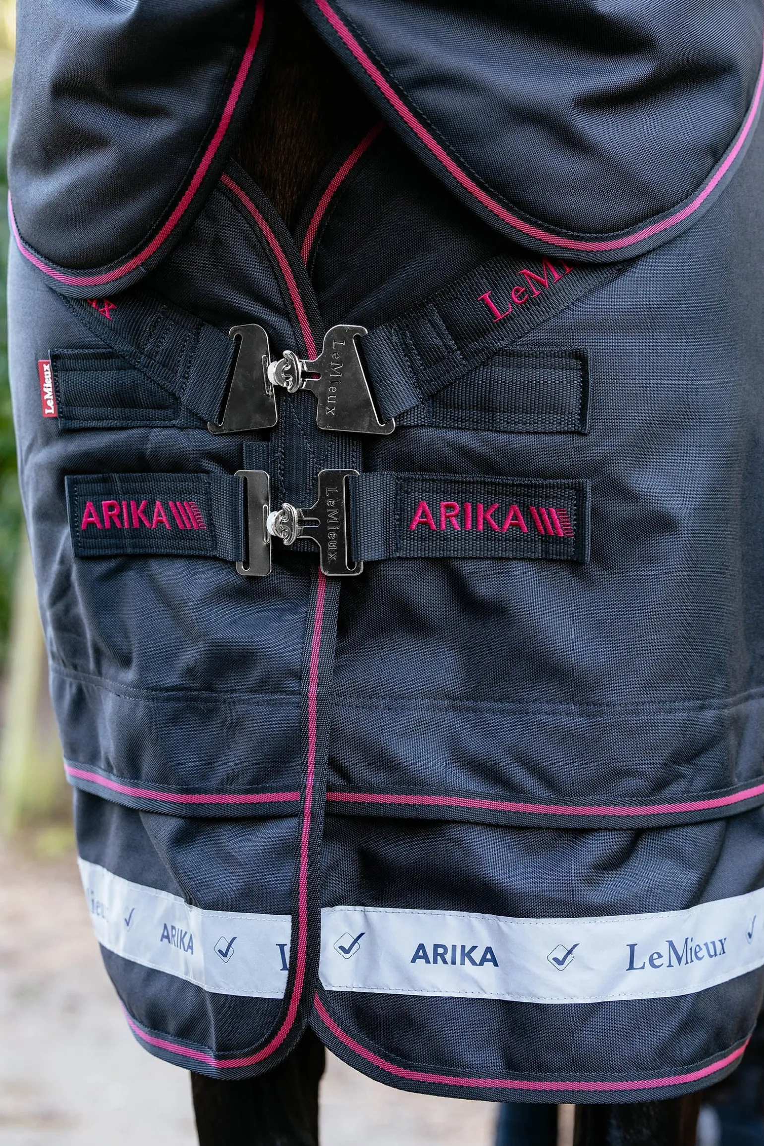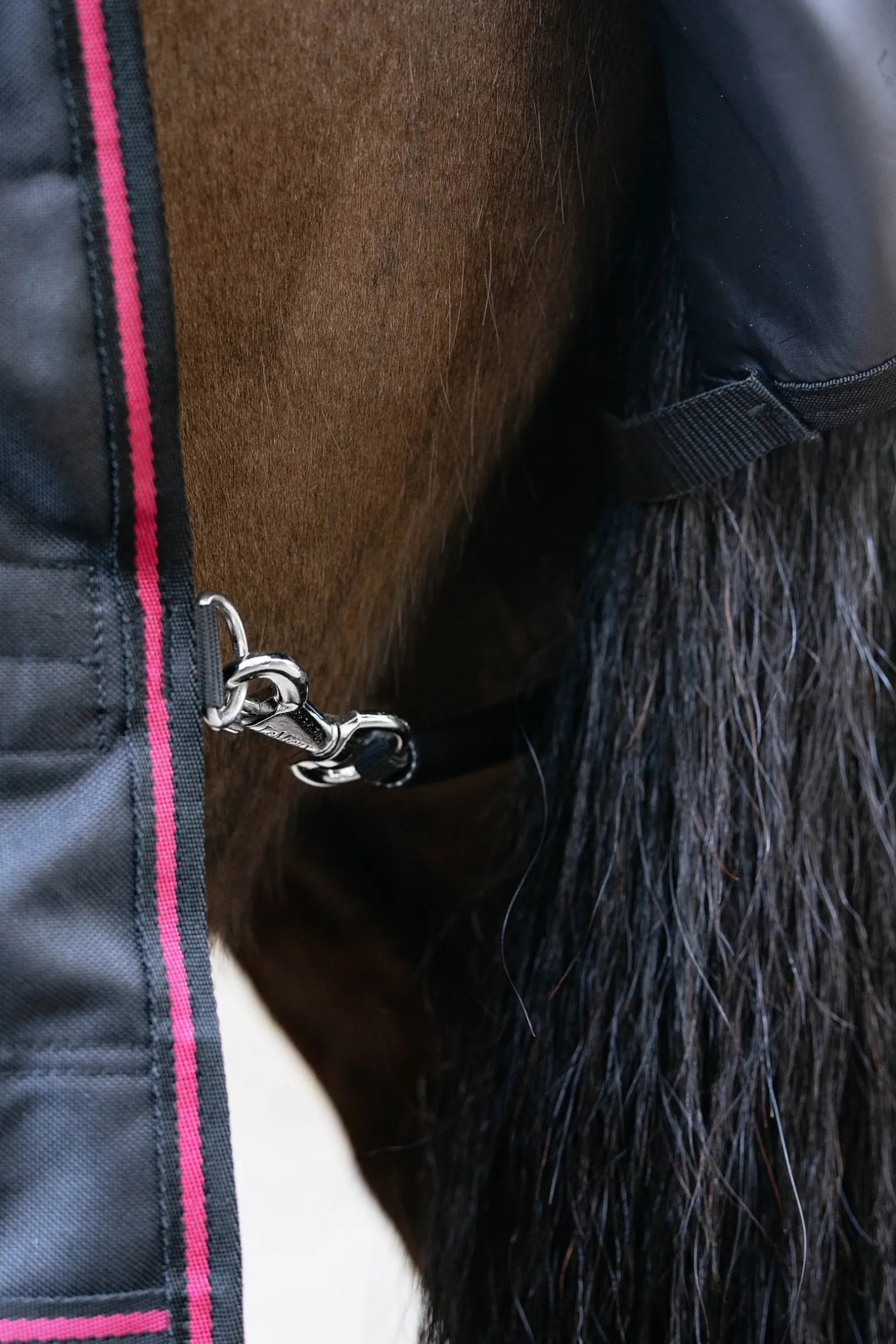 Die Sicherheit wird durch einen Frontverschluss mit geschütztem Design gewährleistet. Der obere Teil der beiden stabilen T-Verschlüsse ist in einem 45°-Winkel angebracht, um Druckpunkte im Schulterbereich zu vermeiden für mehr Komfort und Bewegungsfreiheit. Der darunter liegende, nicht fusselnde Kletteinsatz sorgt dafür, dass die Decke nicht verrutscht, sodass du dein Pferd völlig sorgenfrei auf die Weide bringen kannst.